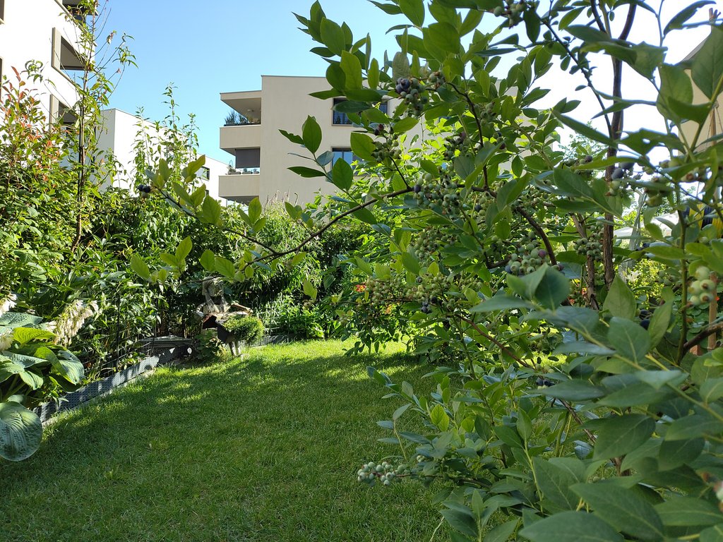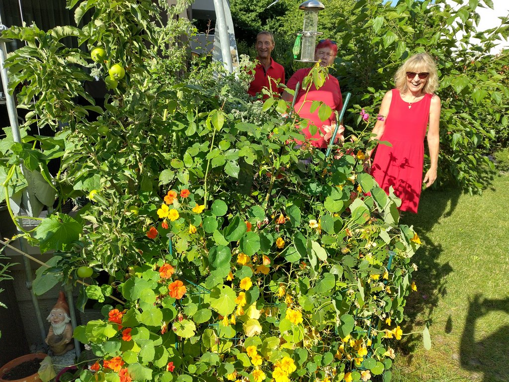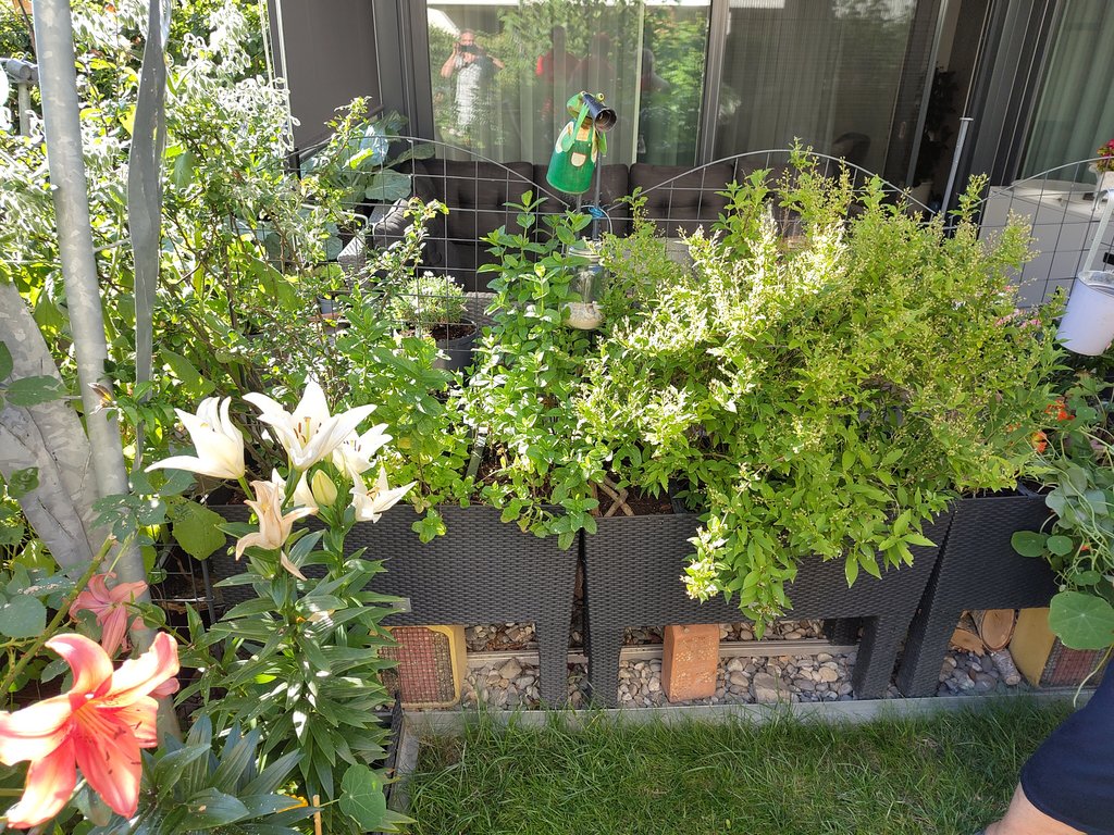 Der Garten von Manuela Veith zeigt uns, dass auch auf 180 m² in einer Wohnanlage einiges möglich ist. Die Wurmkiste unter der kühlen Hecke ersetzt den Kompost. Bienenhotels und Nistkästen, welche gerade das 2. Mal erfolgreich bebrütet werden, sind vorhanden. Kleine Gründächer z.B. auf der Werkzeugkiste, sind zu finden. Gemüse ist um die Sitzgruppe arrangiert. Eine Wanne mit Seerose wird von Vögeln gerne zum Baden genommen. Obst ist reichlich vorhanden: Brombeeren, Ribiseln, Maulbeeren, Heidelbeeren... Teilweise hat Manuela die Pflanzen von der Pflanzentauschbörse oder aus der Mulde des Friedhofs. So finden wir ganzjährig ein Blütenangebot mit zahlreichen Besuchern und freuen uns, dass manche Blüte über die Hecke weiter in die Wohnanlage wandert.