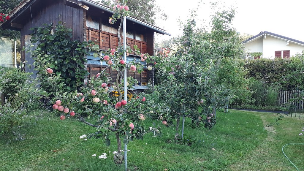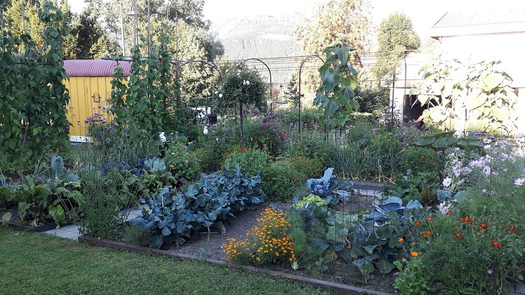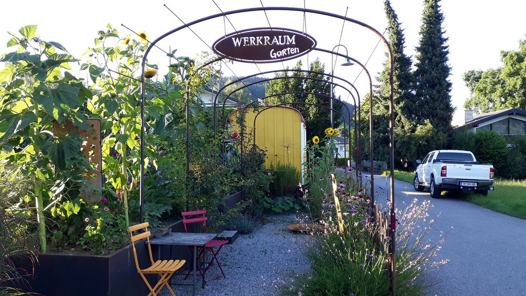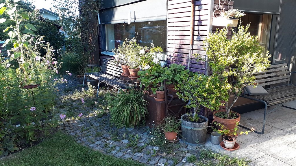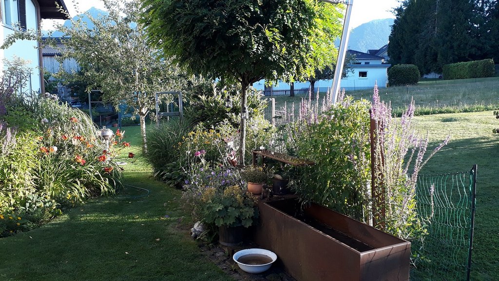 Ein sehr stilvoll angelegter Garten mit einer Trockenzone, einem großen Gemüsegarten im Bauerngartenstil, einer Kräuterspirale, einem großen Bienenhaus und zwei Laufenten. Auf dem begrünten Flachdach befindet sich ein kleiner Sitzplatz mitten in verschiedenen Nelken und Gräsern. Im Brunnen auf der Terrasse baden regelmäßig die Spatzen und die Pflasterfugen sind artenreich bewachsen. Mehrere kleine Bänke und Sitzplätze laden zum Verweilen ein