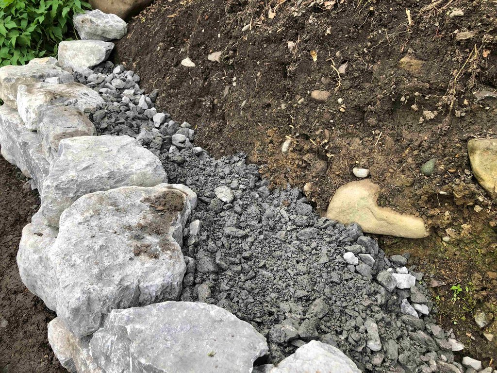Die Steine werden auf einer Drainageschicht aus Kies, Schotter oder grobem Bauschutt aufgeschichtet. Wichtig ist, dass ein Verbund zwischen den Steinen entsteht, indem die Steine versetzt und leicht zum Hang geneigt aufgeschichtet werden. Es dürfen keine Kreuzfugen entstehen. Eine ca. 20 cm breite, durchlässige Drainageschicht hinter den Steinen, je nach Höhe der Mauer, verhindert Frostschäden und lässt das Wasser abrinnen. Die Mauer muss so stabil sein, dass man gefahrlos darauf laufen kann.