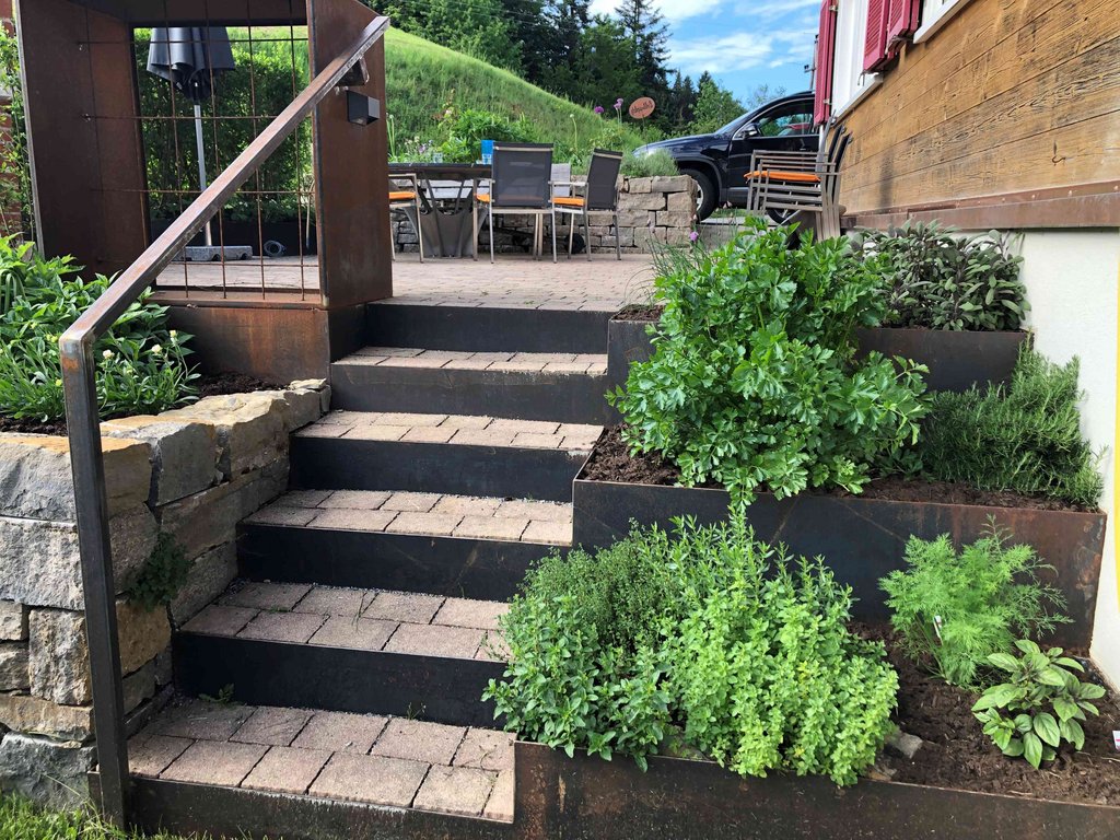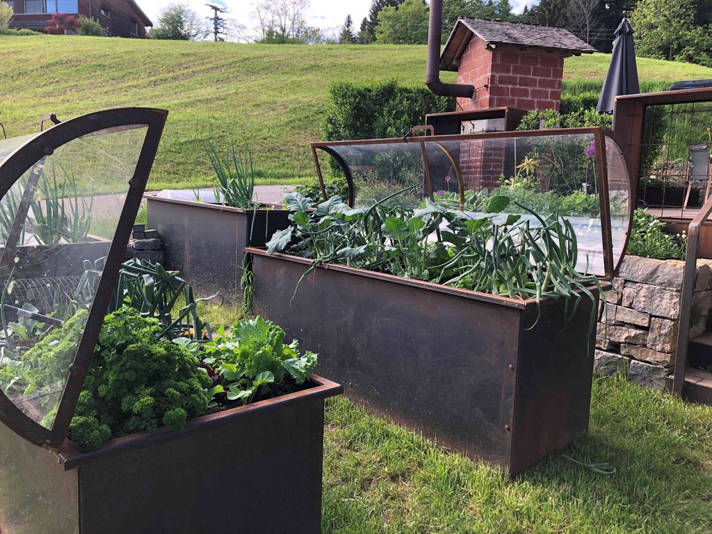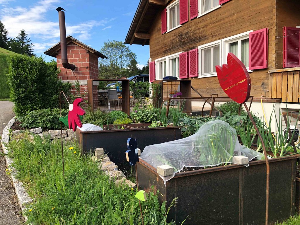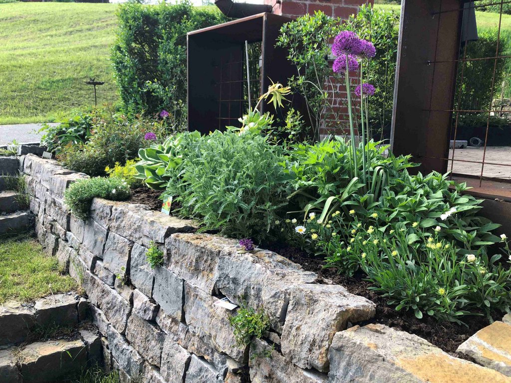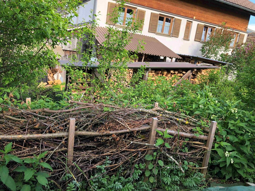 Es gibt: Trockensteinmauern, Kräuter- und Gemüsebeete in Mischkulturund gemulcht, Obst, Nützlingshotel, Benjeshecke, Wildsträucherhecke, Blumen und Staudenbeet, Kompostanlage, Regenwassernutzung, unversiegelte Plätze.
