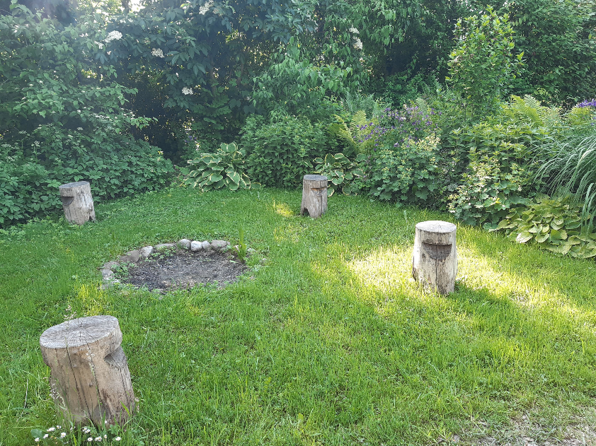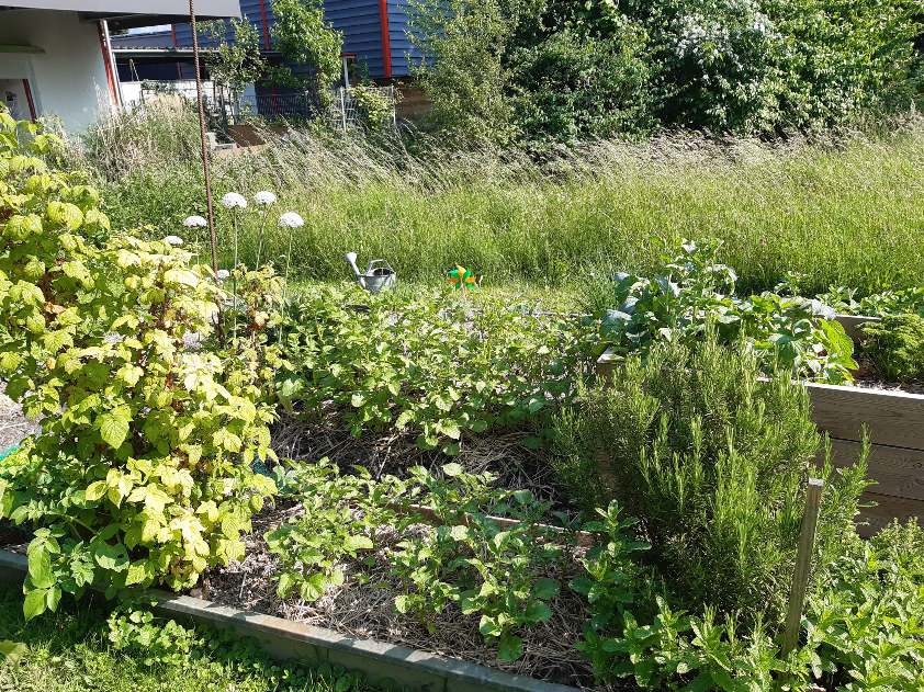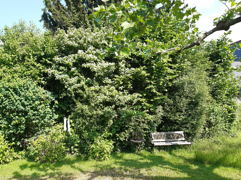 Großer Naturgarten mit vielen einheimischen Wildsträuchern und Bäumen. Hier finden Wildbienen das ganze Jahr über ein großes Nahrungsangebot. Verschiedene Sitzgelegenheiten und Schattenbäume laden in dieses Garten zum Verweilen ein.