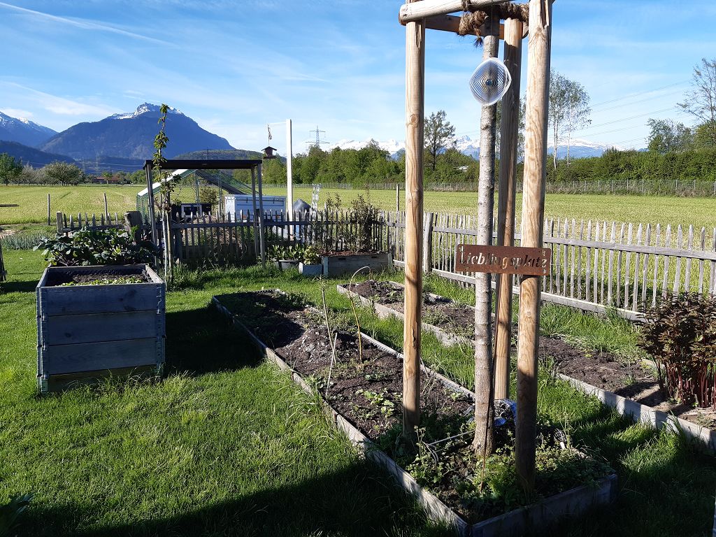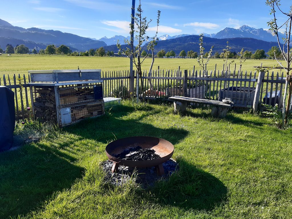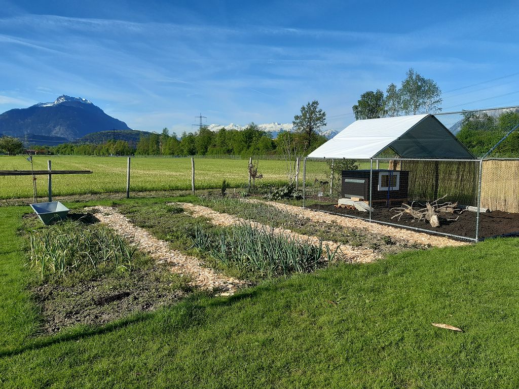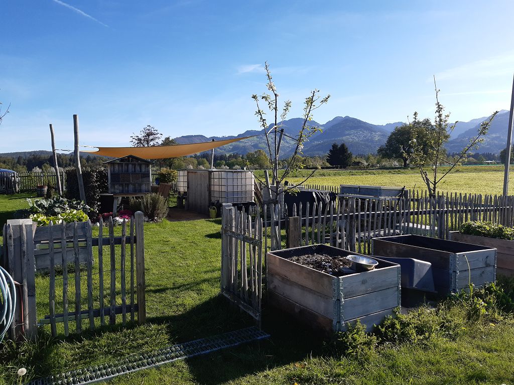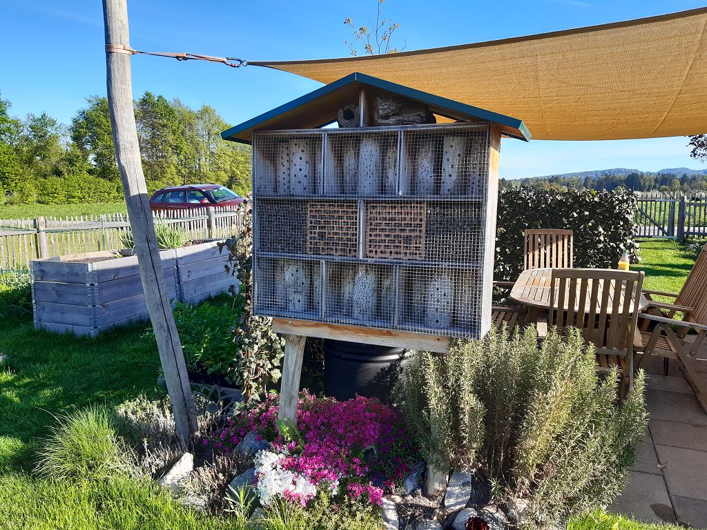 Noch recht junger Garten, in mitten großer Felder der in vielen Arbeitsstunden sehr durchdacht und mit viel Upcycling Material geschmackvoll angelegt wurde. Ein mit Blühstreifen umgebener Staketenzaun hält ungebetene tierische Besucher fern.Neben einem schönen Efeuumrankten Sitzplatz gibt es viele Gemüsebeete und Beerensträucher, Obst-und Laubbäume. Viele Stauden, ein kleines Mini-Sandarium, ein Bienenhotel und eine Vogelvoliere für 12 Wachteln ergänzen das Ganze. Nicht zu vergessen ist das Bänkle, welches gleichzeitig mit seinen Stammrundlingen den Wildbienen Unterschlupf gewährt.
