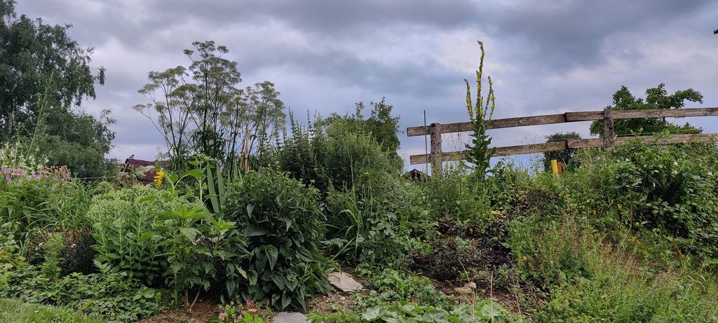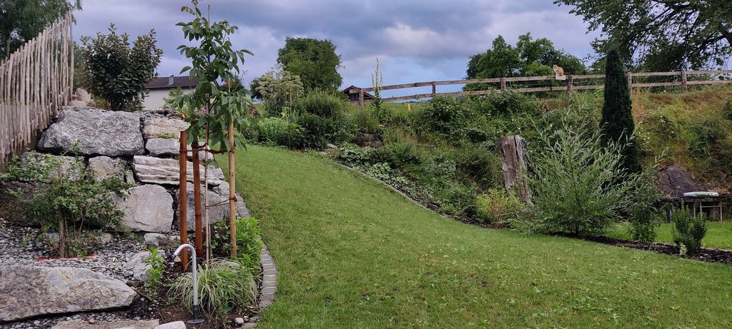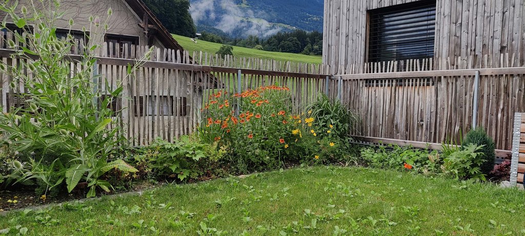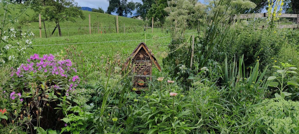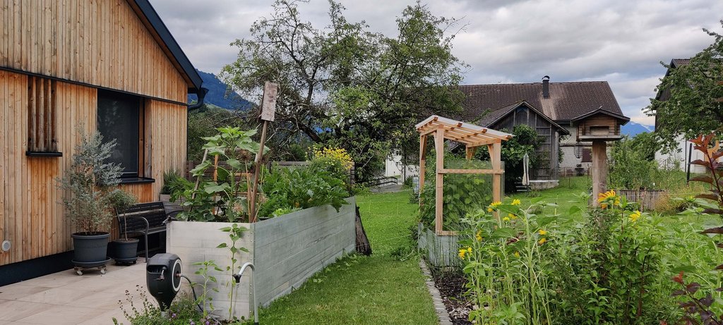 Andreas Moosmann hat vor wenigen Jahren gestartet, rundum das neu gebaute Haus ein kleines Naturgartenparadies zu schaffen. Schon jetzt gedeihen Blühstreifen, Staudenbeete und heimische Wildsträucher – viele Pflanzen fanden aus den Gärten von Verwandten und Freunden einen Platz im neuen Garten. Auf ca. 500m² haben neben wilden Ecken auch eine Blumenwiese, selbstgebaute Hochbeete für Gemüse und Kräuter, ein Nussbaum, zahlreiche Beerensträucher sowie das begrünte Carportdach Platz.