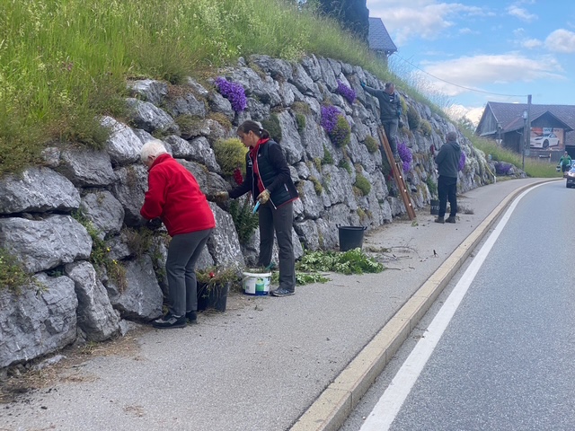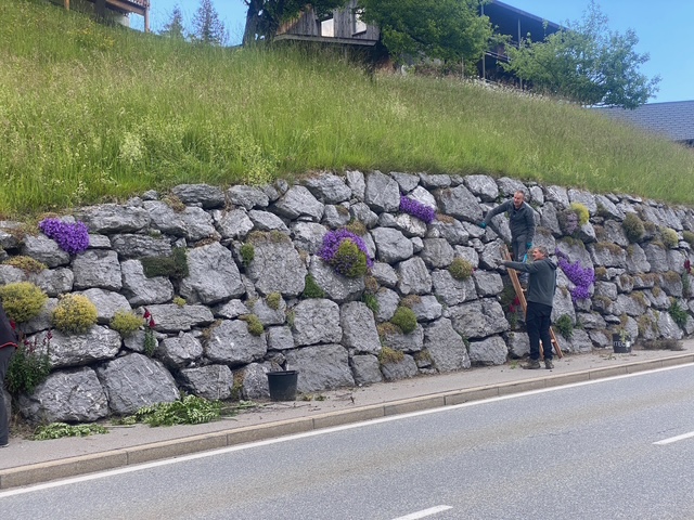 Auch die Steinmauer in Rohnen befreiten wir vom Unkraut. Schön, dass manche Autofahrer soviel Freude an der blühenden Mauer haben, dass sie sogar beim Vorbeifahren stehen bleiben und unsere Arbeit würdigen. Danke für euer Lob! Wir hoffen, dass auch in diesem Sommer die bereits vorbereiteten Blumenpunkte wieder viele AlberschwenderInnen und BesucherInnen erfreuen werden. Danke allen HelferInnen!