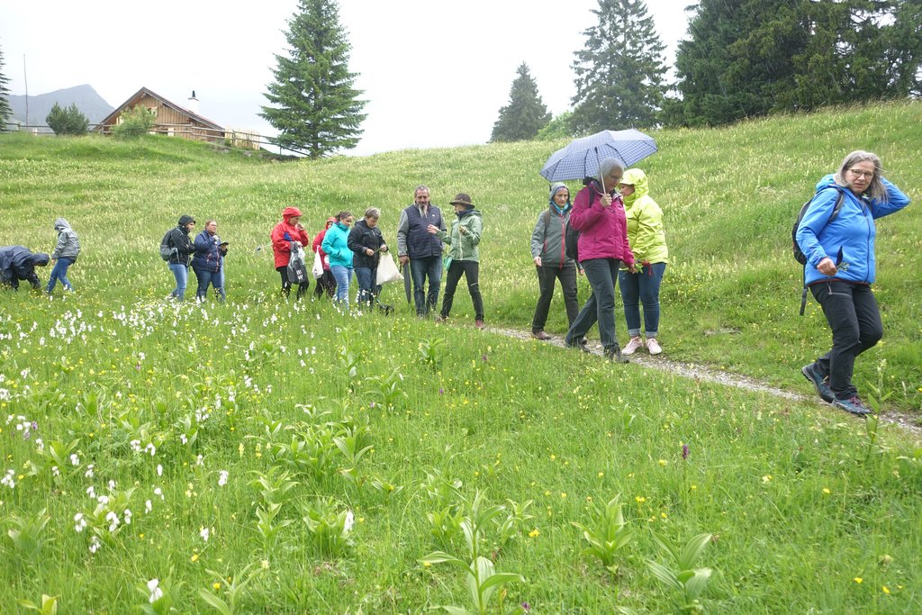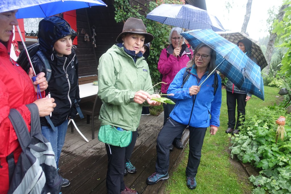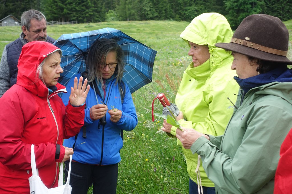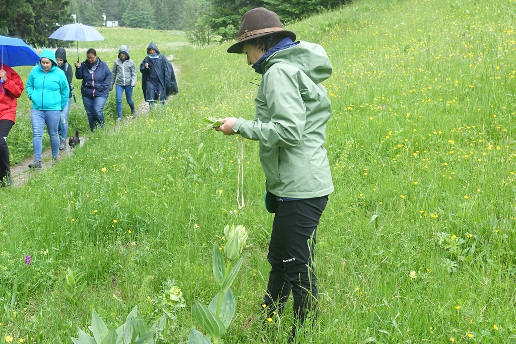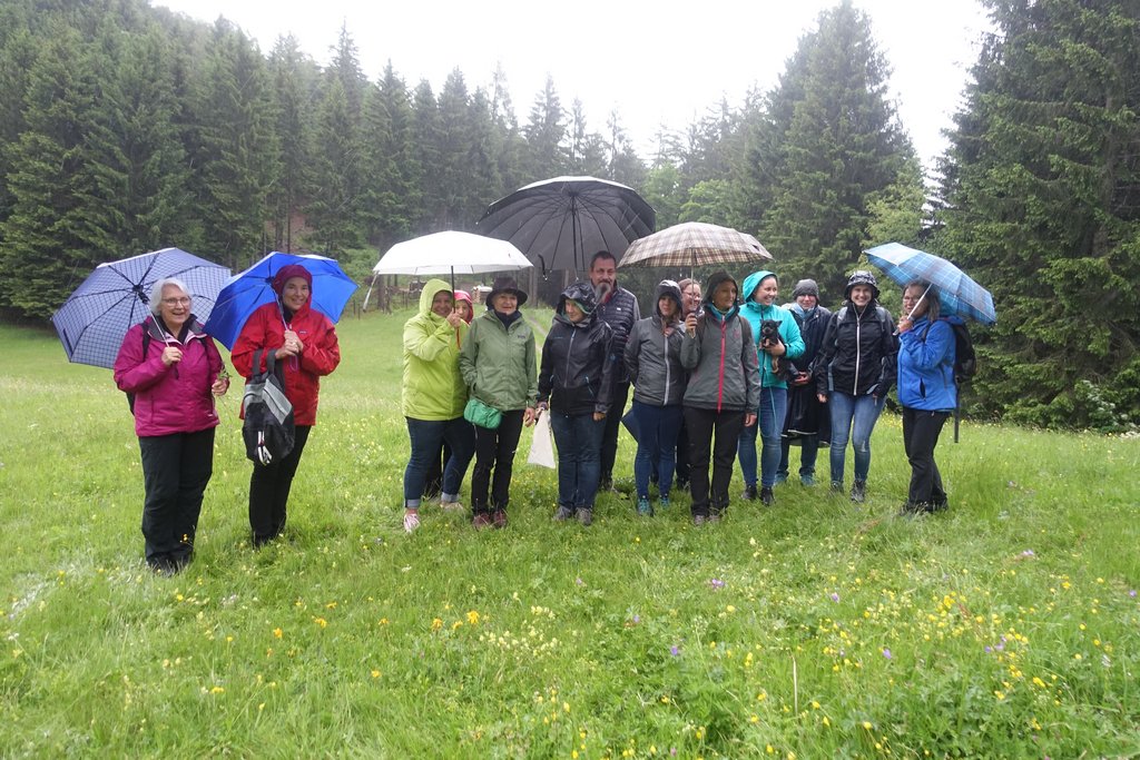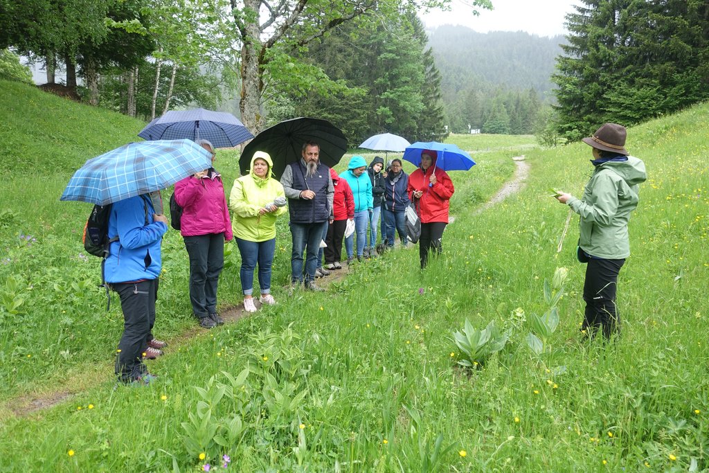 Um 17.00 Uhr trafen wir uns beim Wanderparkplatz, wo uns der Regen begrüßte. Da wir alle gut ausgerüstet waren mit Regenjacke und Schirm, konnte uns der Regen die gute Laune nicht verderben. Vom Wanderparkplatz bogen wir rechts ab und da standen auch schon die ersten Kräuter, Rotklee, Spitzwegerich, Mädesüß. Wir bekamen auch die Doppelgänger gezeigt. Zum Beispiel den gelben Enzian, wo man die Wurzeln erntet und seine giftige Doppelgängerin die weiße Germer. Bei der Verwechslung der Wurzeln kann dies tödlich ausgehen. Weiter führte uns der Weg Richtung Mottaköpfle, wo die Arnika blühte. Die Arnika kann bei Prellungen äußerlich und verdünnt als Tinktur angewandt werden. Am Ende der Wanderung gingen wir noch in den Kräutergarten von Birgit wo uns die Brennnessel genauer erklärt wurde und für jeden ein Glas Brennnesselsalz bereitstand. Wir die Kräuterfrauen bedanken uns nochmals recht herzlich für die netten und wissbegierigen Teilnehmer und das große Interesse an den Kräutern.