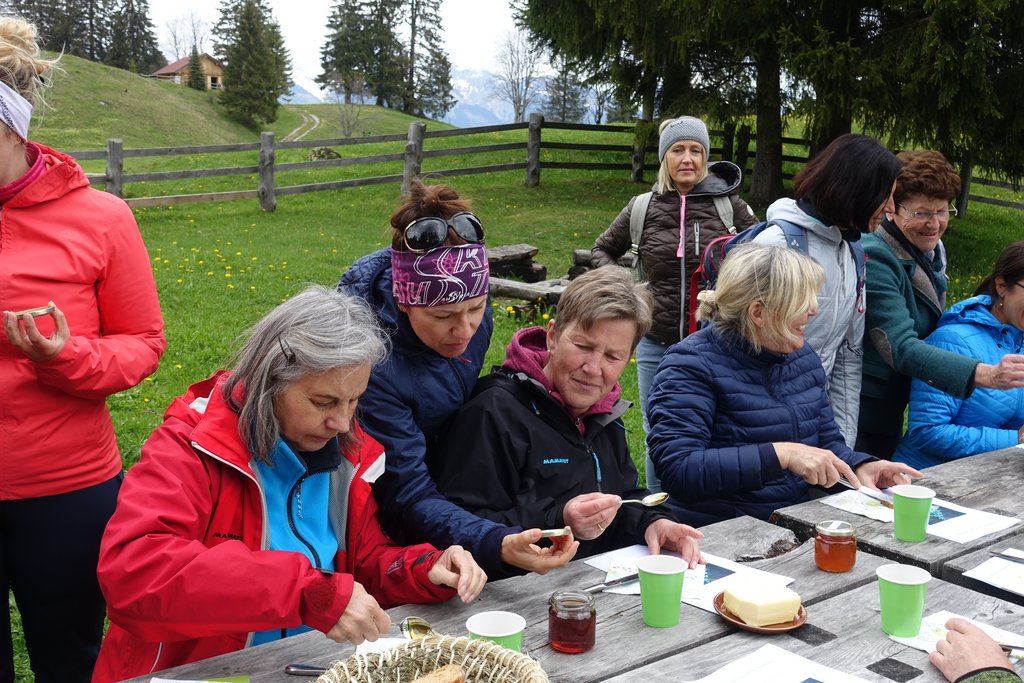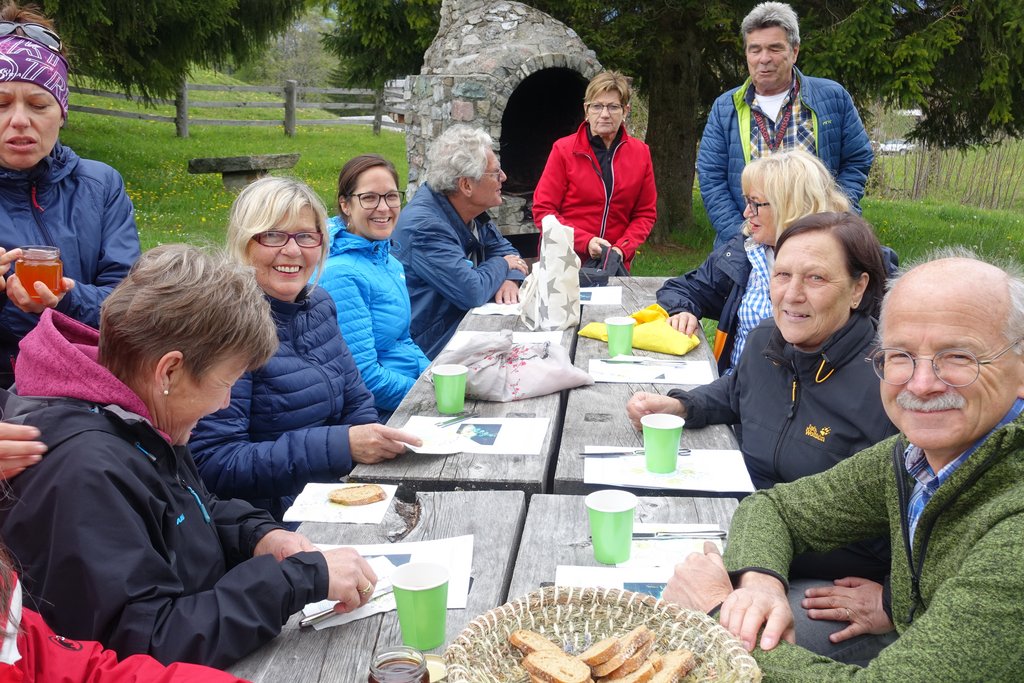 Wir trafen uns am 30 Mai bei schönem und trockenem Wetter auf dem Wanderparkplatz der Tschengla. Passend zu Christi Himmelfahrt konnten wir mit 2 Gruppen die Kräuterwanderung beginnen. Dabei lernten wir die verschiedenen Kräuter wie Wegerich, die Schafgarbe, Kreuzblume, Blutwurz, Löwenzahn, sowie die Blätter des Huflattichs kennen. Nach ca. 2 Std. Wanderung trafen wir uns alle auf dem Grillplatz, zum gemütlichen beisammen sein. Die Kräuterpädagoginnen brachten ihren Kräutertee und Aufstriche zum Verkosten mit. Es war ein schöner entspannter Nachmittag wo man die Flora und Fauna der Tschengla genießen konnte.