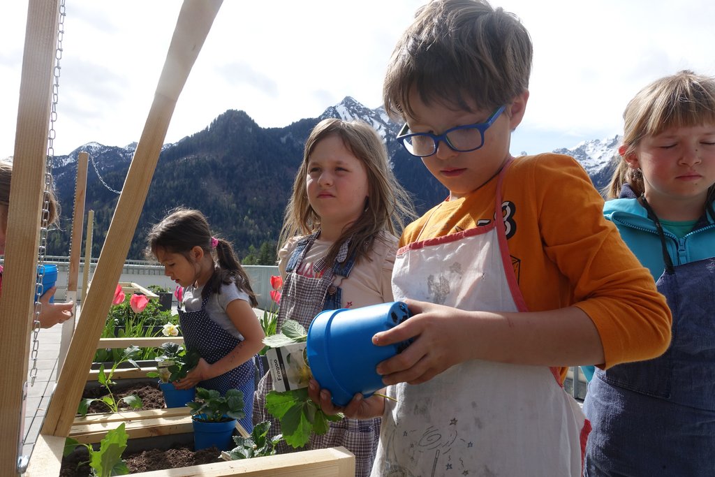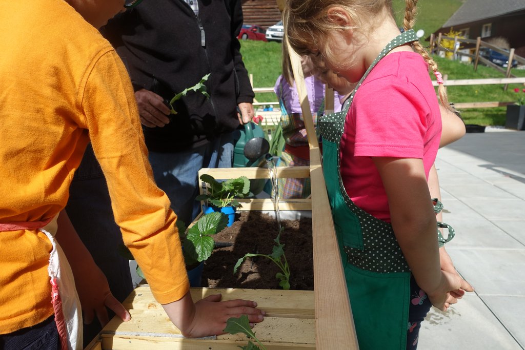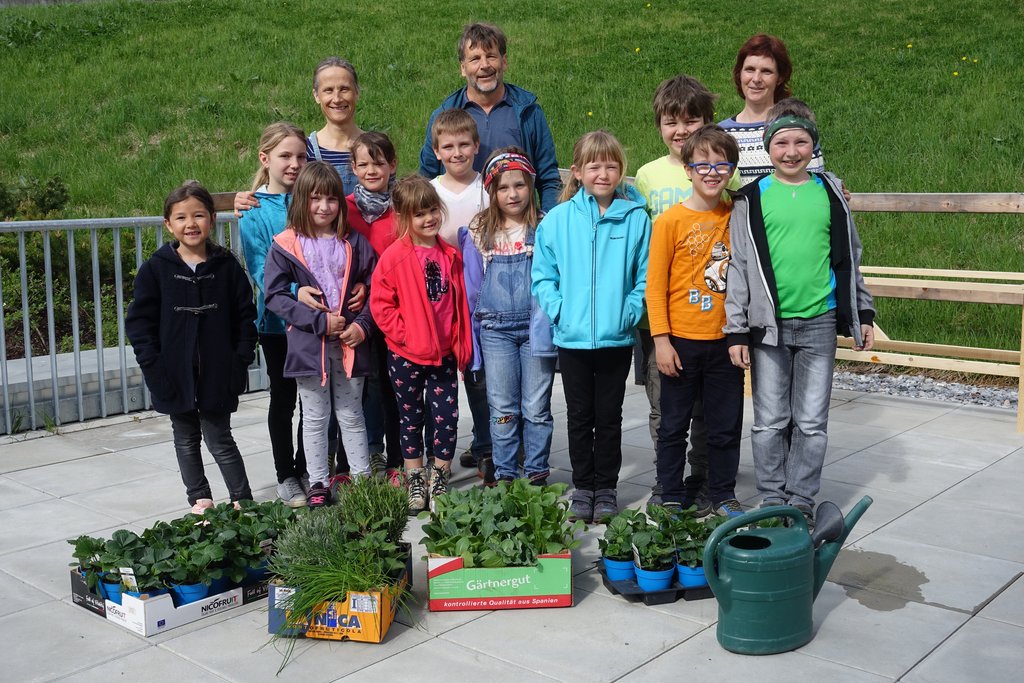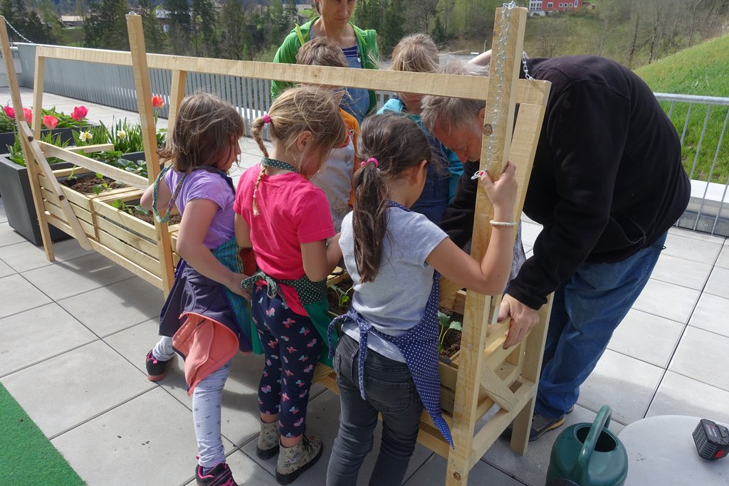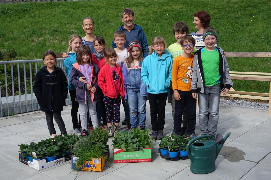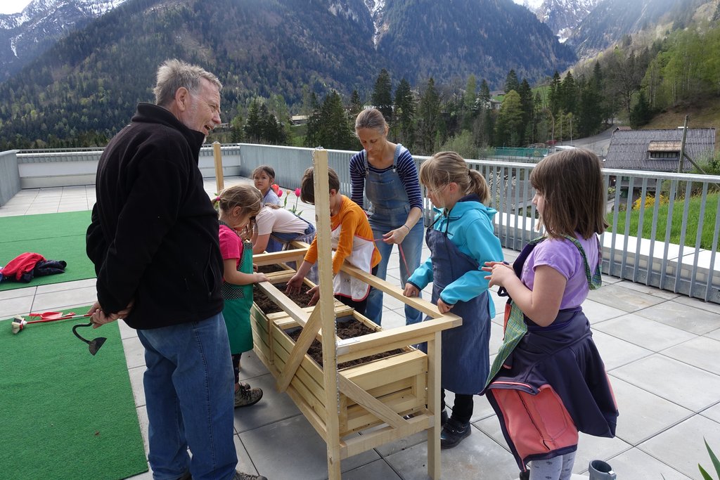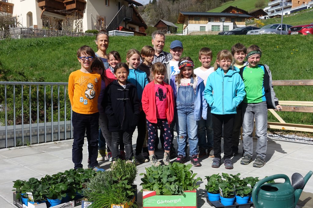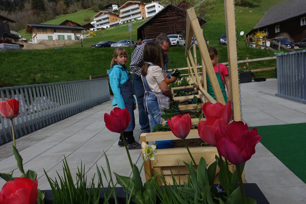 Am 24. April war es soweit, die Holzkisten wurden von den Kindern mit Hilfe von Franz Meyer bepflanzt. Nach einer kurzen Einleitung von Franz, ging es mit großer Freude an die Versetzung der kleinen Pflanzen. Die Setzlinge, wie z.B. Erdbeeren, Kohlrabi, Rübli und einig mehr, bekamen ihren Platz in der Holzkiste. Auch die Gießkanne kam zum Einsatz und manches Kind kam auch noch einen Wasserspritzer ab. Die Kinder hatten großen Spaß dabei. Wir bedanken uns bei der Direktion und Lehrerinnen der Volksschule und der Gemeinde Bürserberg für die Unterstützung der Aktion "MI KISCHTA GÄRTLE". DANKE