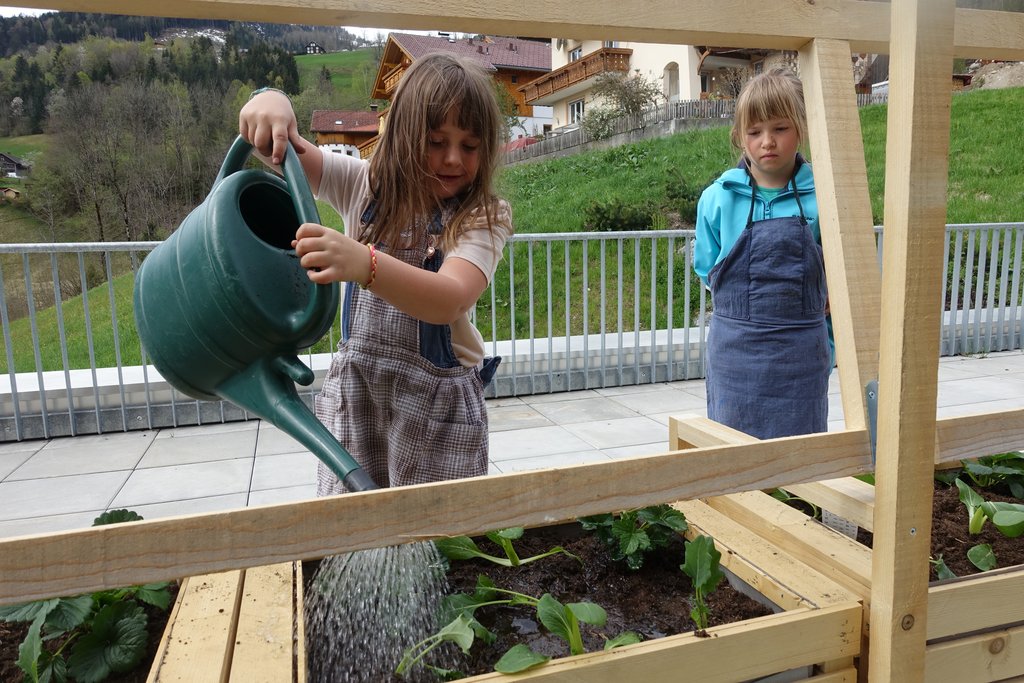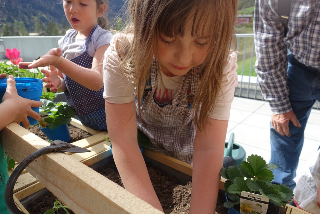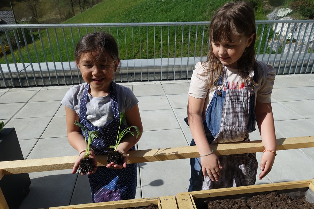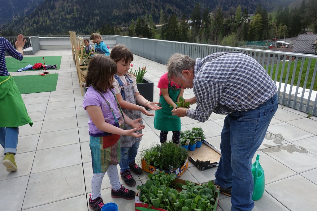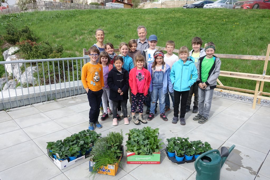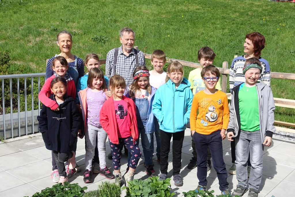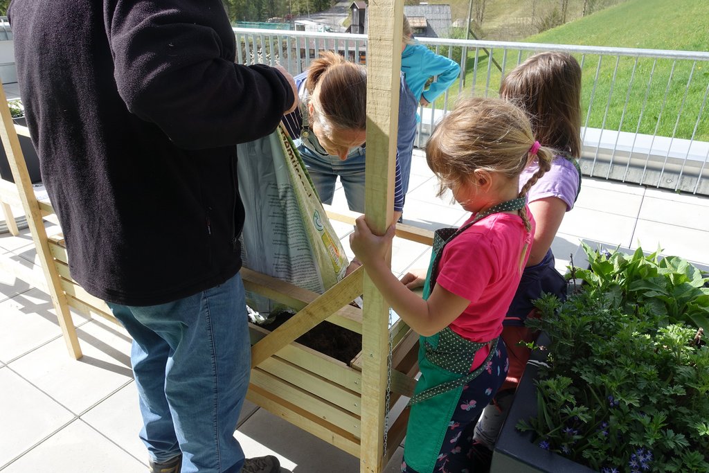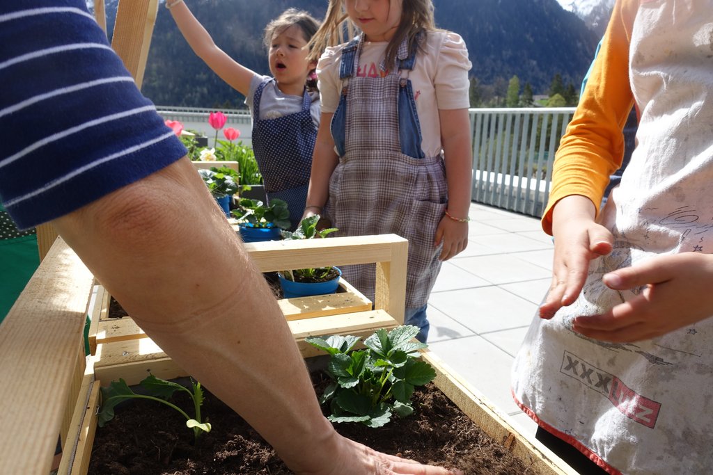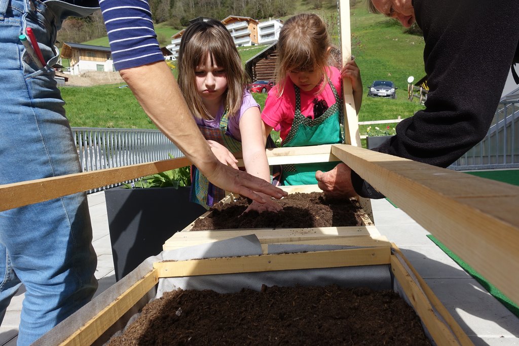 Am 24. April war es soweit, die Holzkisten wurden von den Kindern mit Hilfe von Franz Meyer bepflanzt. Nach einer kurzen Einleitung von Franz, ging es mit großer Freude an die Versetzung der kleinen Pflanzen. Die Setzlinge, wie z.B. Erdbeeren, Kohlrabi, Rübli und einig mehr, bekamen ihren Platz in der Holzkiste. Auch die Gießkanne kam zum Einsatz und manches Kind kam auch noch einen Wasserspritzer ab. Die Kinder hatten großen Spaß dabei. Wir bedanken uns bei der Direktion und Lehrerinnen der Volksschule und der Gemeinde Bürserberg für die Unterstützung der Aktion "MI KISCHTA GÄRTLE". DANKE