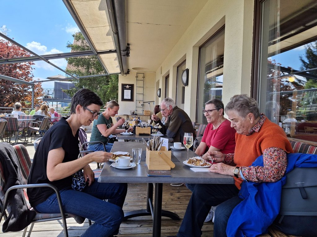 Nach dem Mittagessen ging es weiter auf die Rückfahrt, wobei ein Zwischenstopp im Gasthof Ochsen in Sulzberg eingeplant war. Hier hatten die Teilnehmer die Möglichkeit auf der schönen Terrasse, sich mit Kaffee und Kuchen zu stärken oder sich ein erfrischendes Eis zu gönnen. Bei Sonnenschein und einzigartigen Ausblick auf den Bregenzerwald fand der Tagesausflug seinen Ausklang.