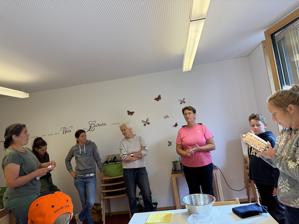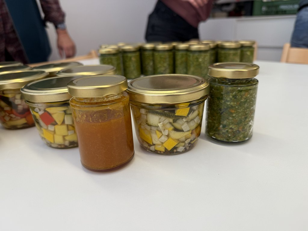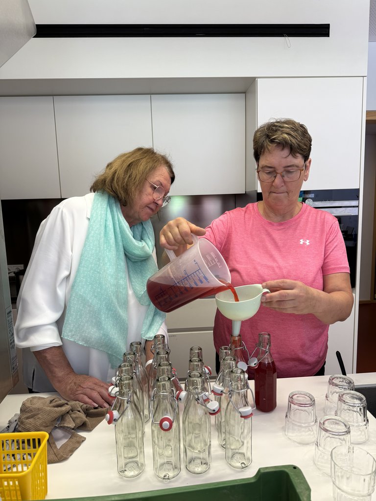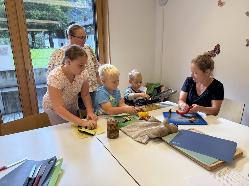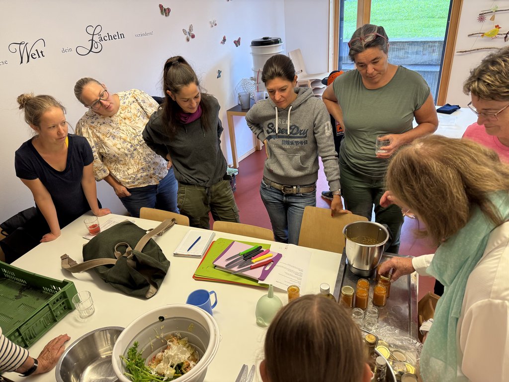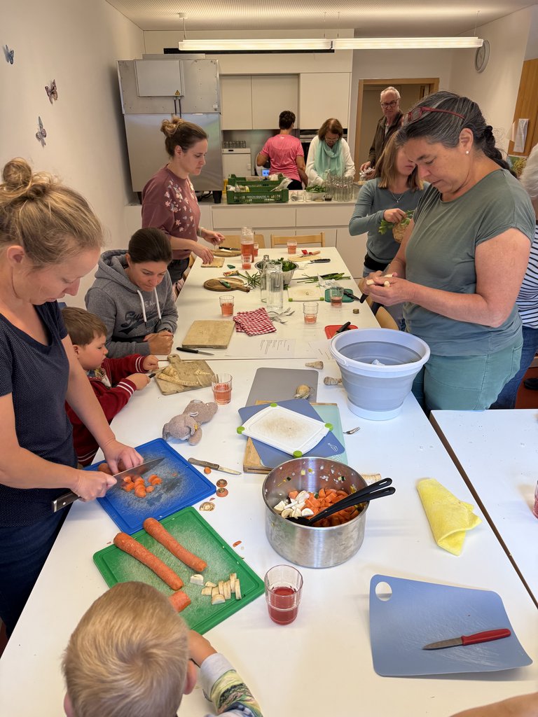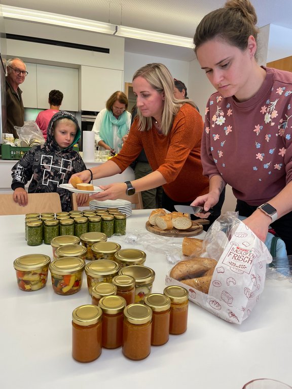 Gemeinsam mit Marianne Scheidbach wurde fleißig geschnippelt, gerührt und natürlich auch probiert. Aus Obst und Gemüse entstanden Saft, Marmelade, Pesto und eingelegte Köstlichkeiten. Besonders beliebt waren die kleinen Kostproben, die Marianne schon vorbereitet hatte – die kamen bei Groß und Klein richtig gut an.