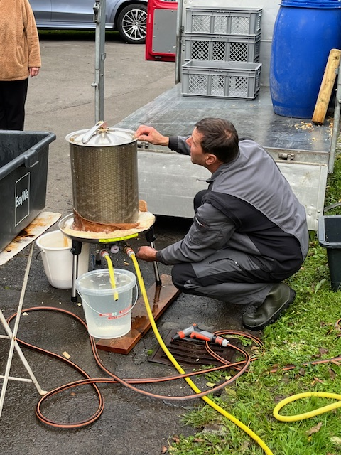 gemeinsam unter der fachgerechten Anleitung von Elmar Felder wurde das Obst verpresst