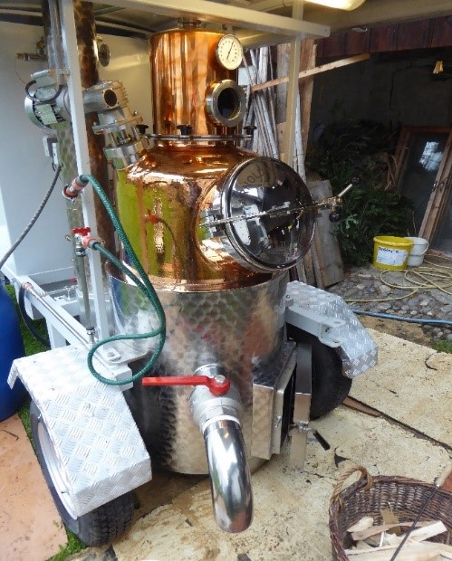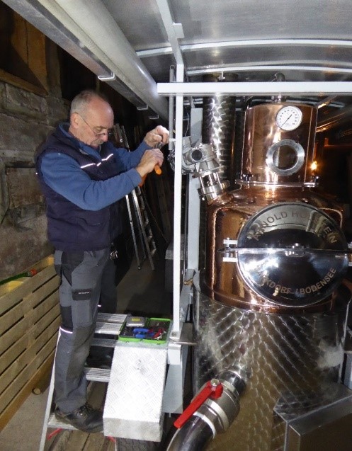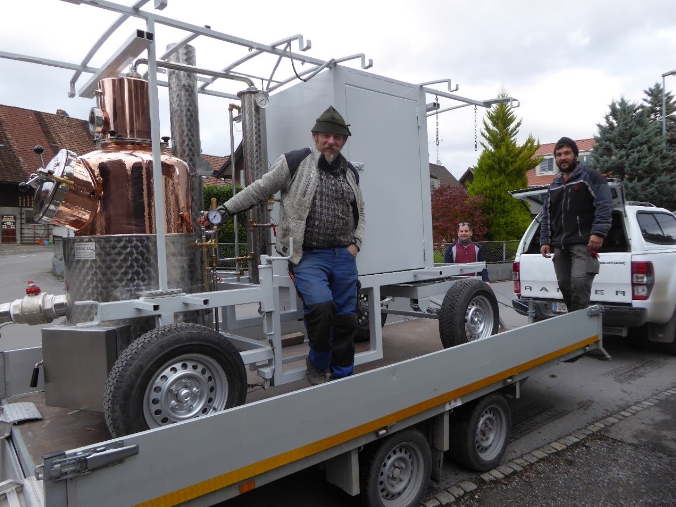 Wir haben einige Brennereien besichtigt, Angebote eingeholt und uns dann für die Brennerei der Firma Holstein in Eriskirch entschieden. Der bisherige Brennhafen wurde von Wolfgang Fässler gekauft. Er war bereit, uns beim Transport des Brennhafens von Eriskirch nach Dornbirn zu unterstützen, was coronabedingt nicht ganz einfach war. Dafür möchten wir uns bei ihm recht herzlich bedanken.