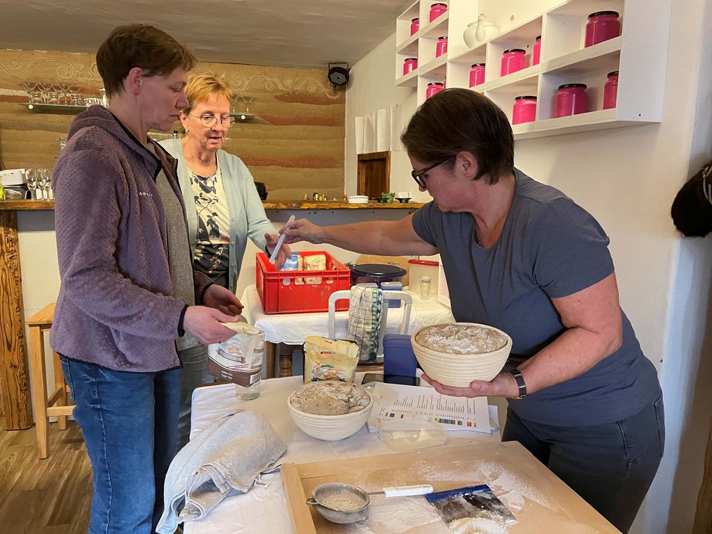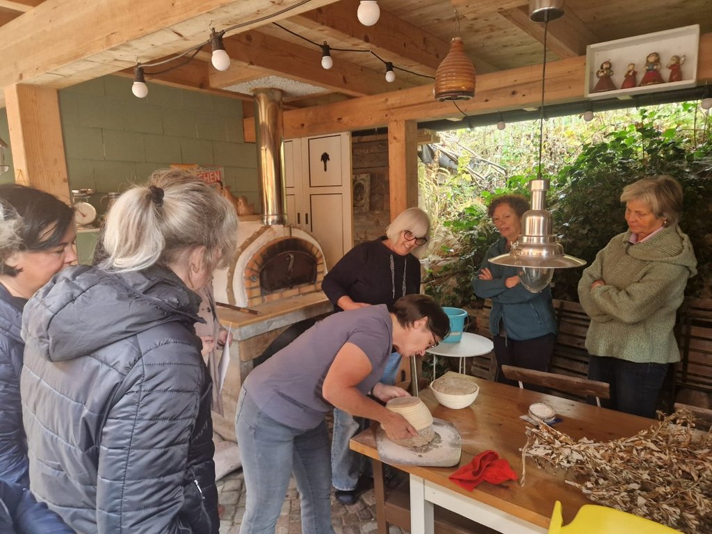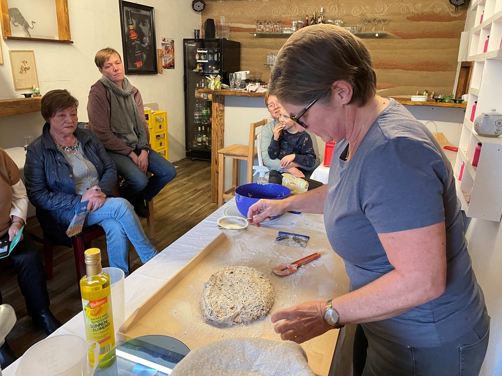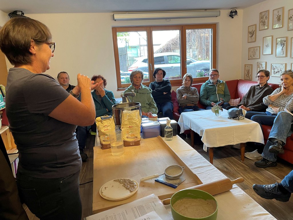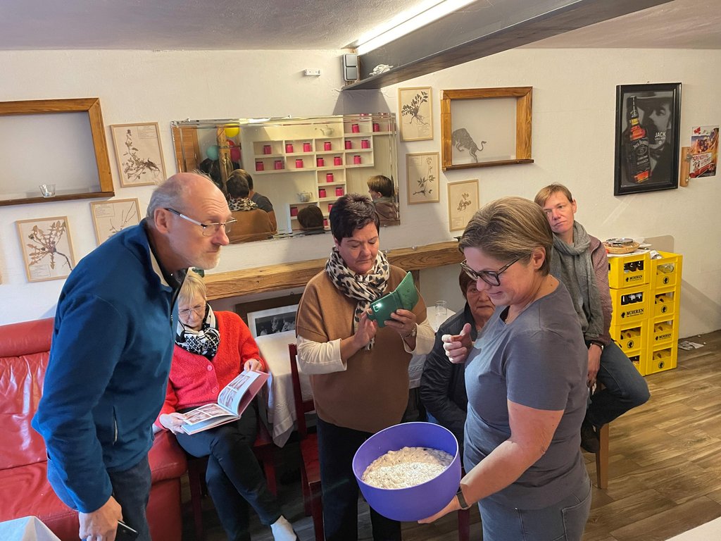 Unter der Anleitung von Christiane Fässler lernten die Teilnehmerinnen und Teilnehmer das Ansetzen von Natursauerteig, der als Grundlage für das im Holzbackofen gebackene Sauerteigbrot diente. Ergänzend wurde ein kräftiges Vollkornbrot mit verschiedenen Kernen zubereitet. Margit steuerte verschiedene Aufstriche bei, die zusammen mit den selbstgemachten Frühstückssemmeln sowie den frisch gebackenen Broten verkostet wurden. Der Nachmittag war geprägt von Wissensvermittlung, praktischem Arbeiten und einem regen Austausch.