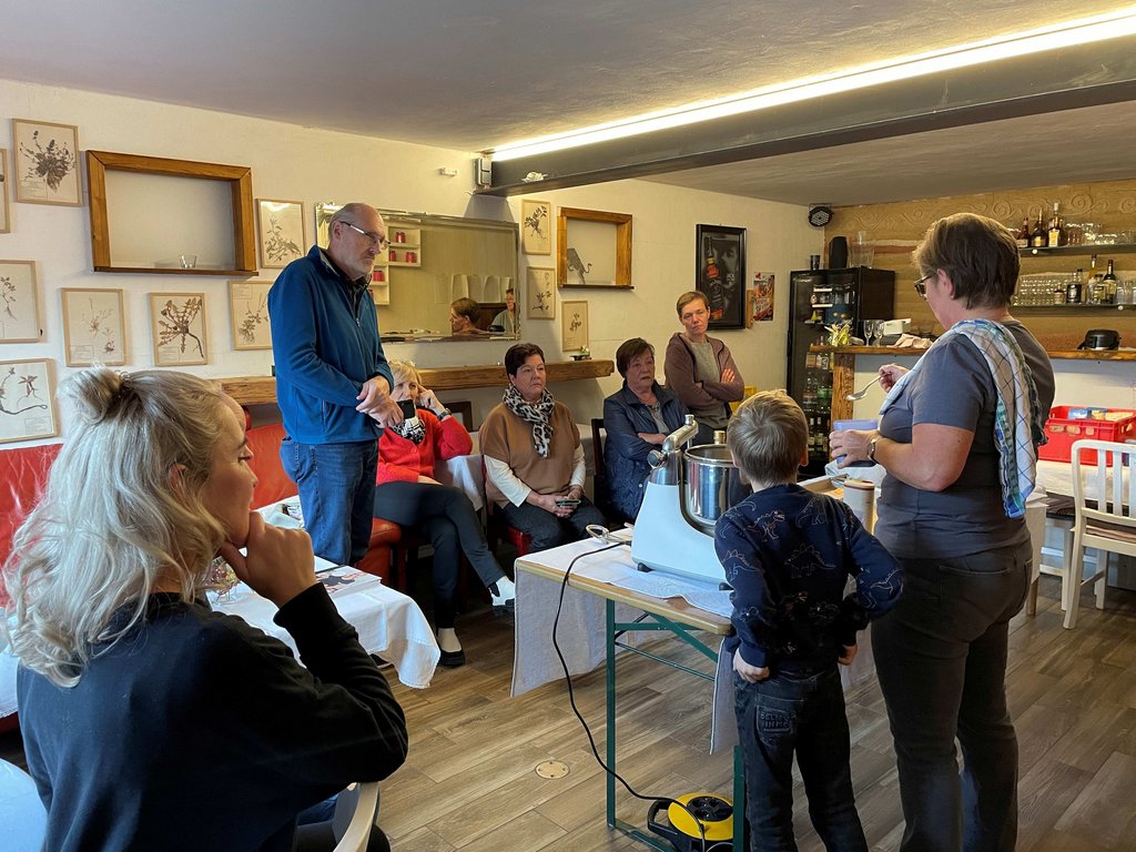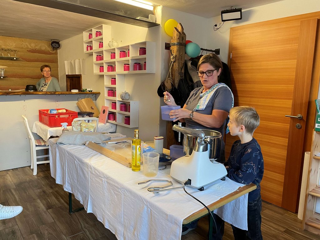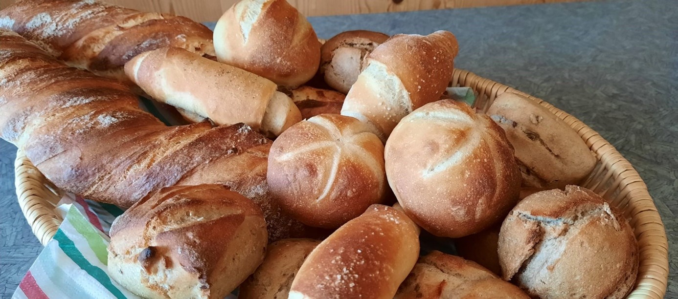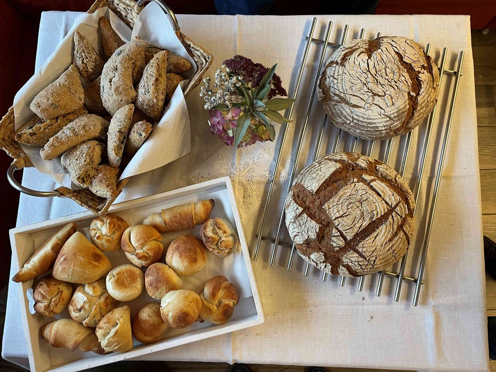 Unter der Anleitung von Christiane Fässler lernten die Teilnehmerinnen und Teilnehmer das Ansetzen von Natursauerteig, der als Grundlage für das im Holzbackofen gebackene Sauerteigbrot diente. Ergänzend wurde ein kräftiges Vollkornbrot mit verschiedenen Kernen zubereitet. Margit steuerte verschiedene Aufstriche bei, die zusammen mit den selbstgemachten Frühstückssemmeln sowie den frisch gebackenen Broten verkostet wurden. Der Nachmittag war geprägt von Wissensvermittlung, praktischem Arbeiten und einem regen Austausch.