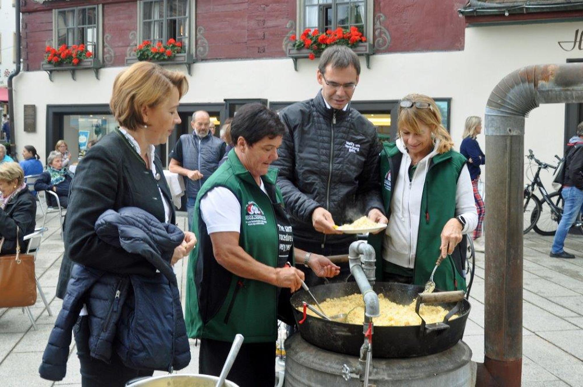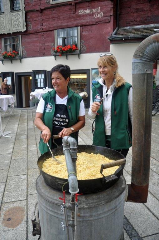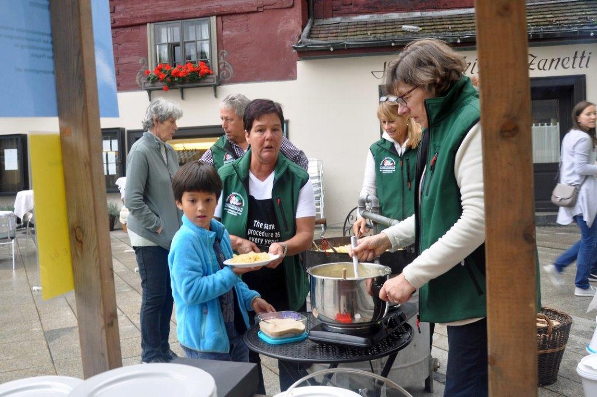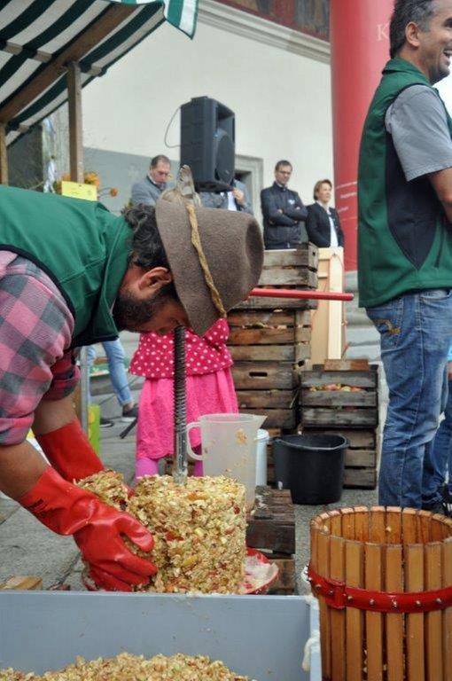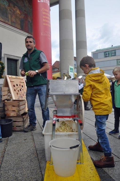 Zum Thema "Alles Öpfl" durften Erwachsene und Kinder selber Äpfel pressen. Die meisten waren sehr überrascht, wie gut dieser Saft schmeckte. Parallel dazu duftete es wunderbar nach Riebel, den wir fertig gebraten haben. Von allen, vor allem auch von vielen Ehrengästen, erhielten wir großes Lob für den luftigen Riebel, den der Koch Roland Bühel für uns vorbereitet hatte.