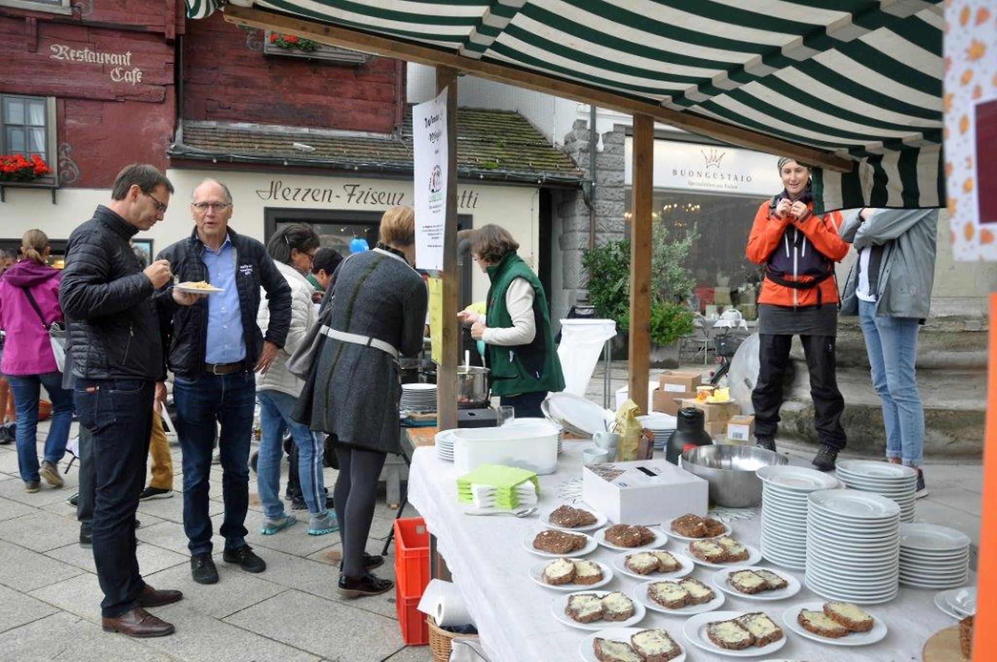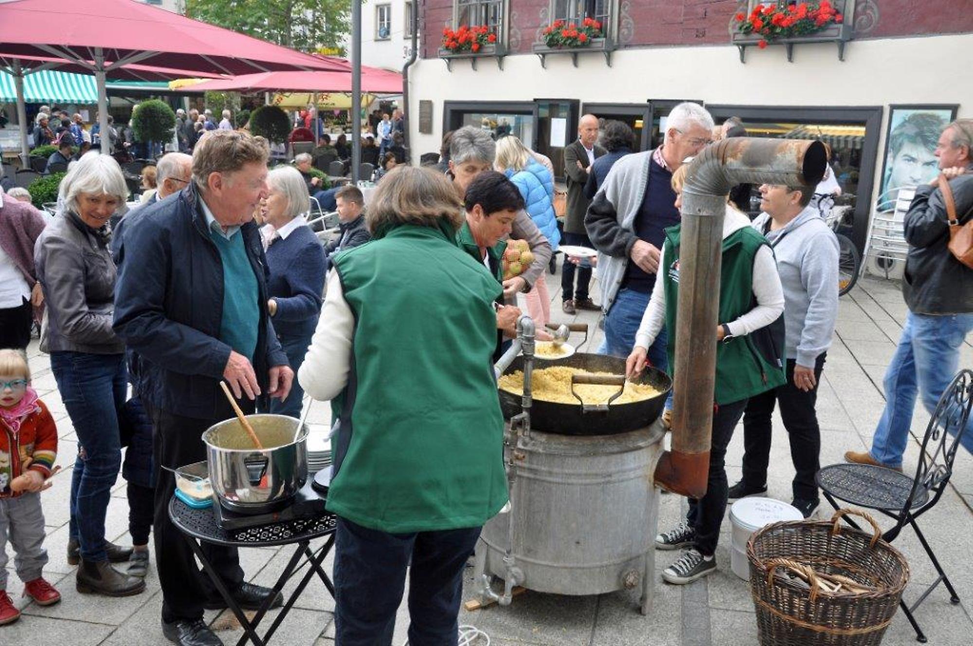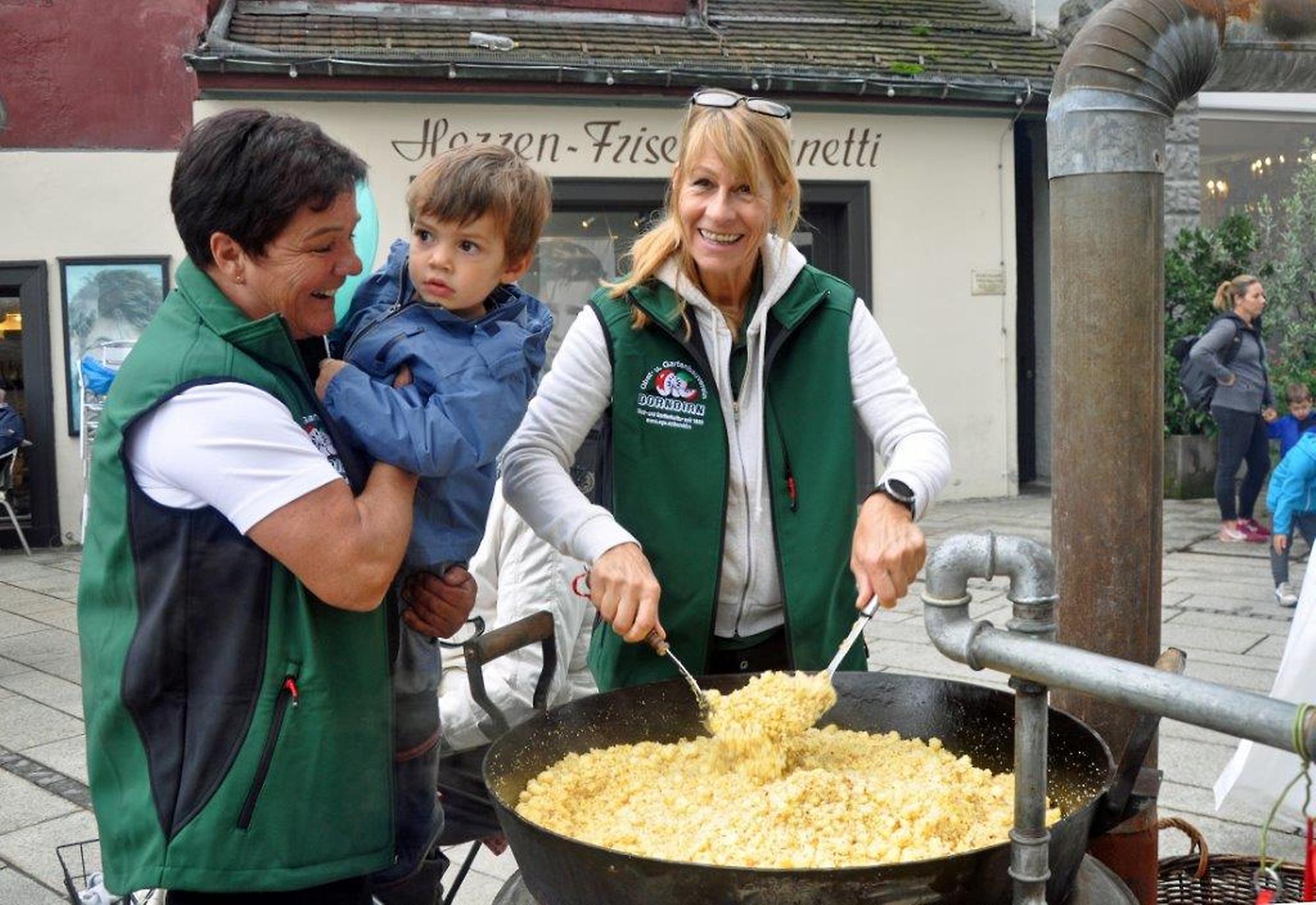 Zum Thema "Alles Öpfl" durften Erwachsene und Kinder selber Äpfel pressen. Die meisten waren sehr überrascht, wie gut dieser Saft schmeckte. Parallel dazu duftete es wunderbar nach Riebel, den wir fertig gebraten haben. Von allen, vor allem auch von vielen Ehrengästen, erhielten wir großes Lob für den luftigen Riebel, den der Koch Roland Bühel für uns vorbereitet hatte.