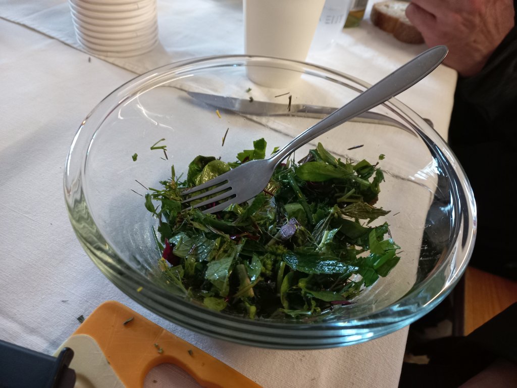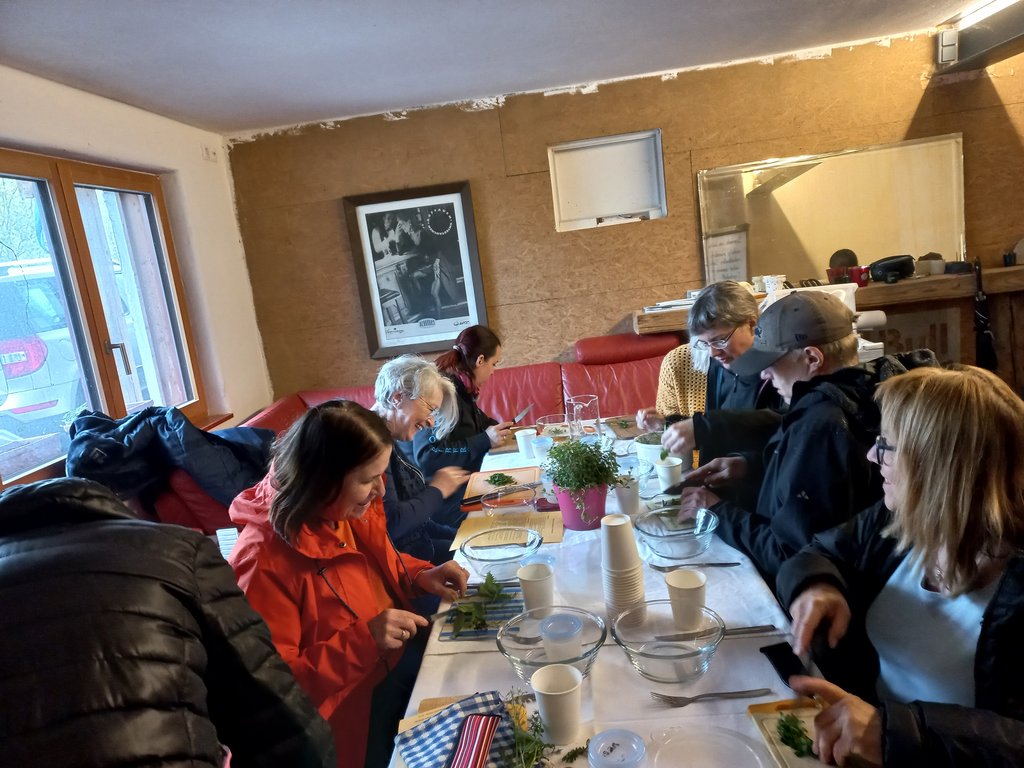 Nachdem die Körbe gefüllt worden waren, durften die gesammelten Kräuter selbstverständlich auch verkostet werden. Gemeinsam ließen Referentinnen und Teilnehmende die Veranstaltung bei wärmendem Kräutertee und natürlich dem selbst gesammeltem Salat sowie Wildkräuterpesto mit einem gemütlichen Hock ausklingen.