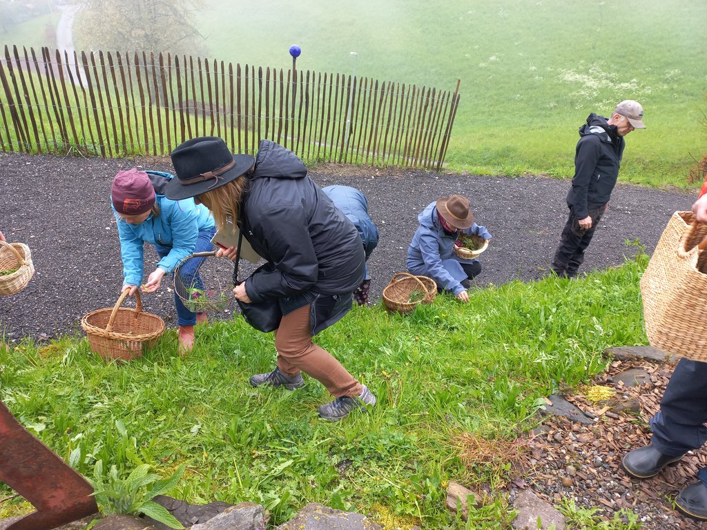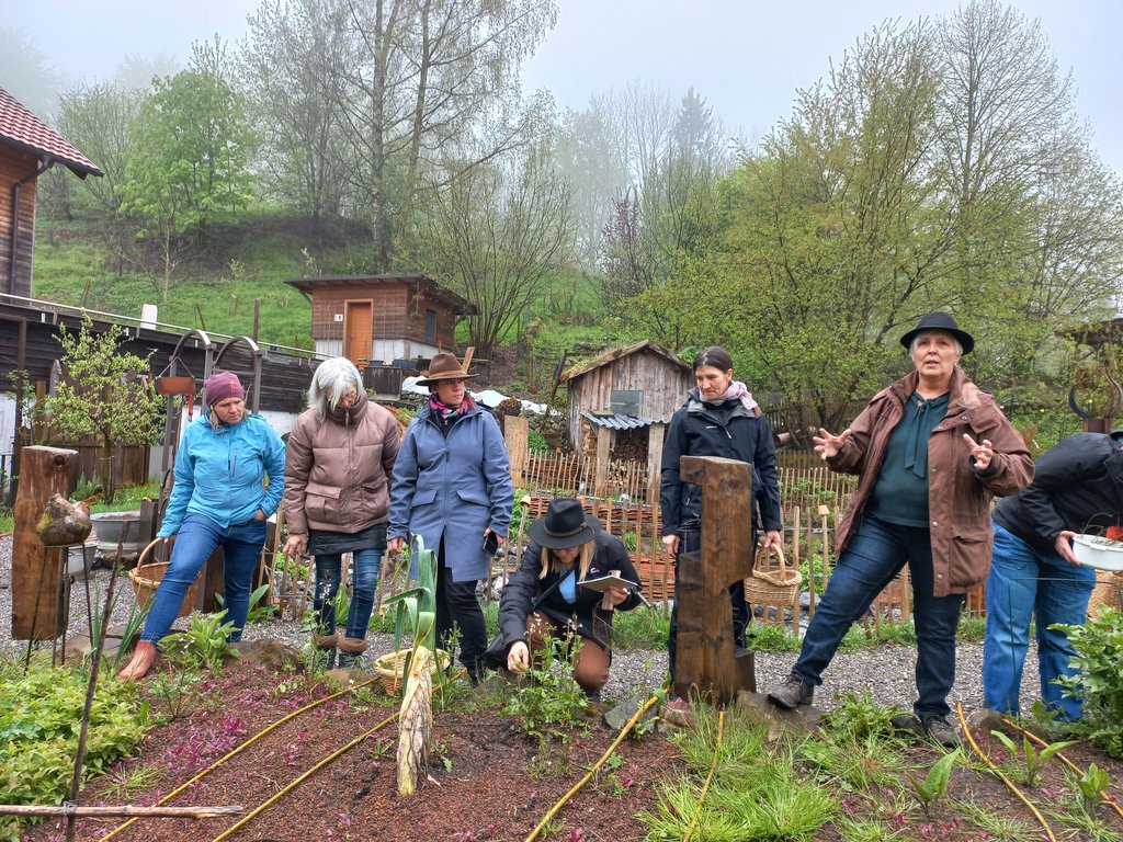Trotz schlechter Wetterprognose trafen sich elf Teilnehmer:innen bei Margit und Tanja Rusch am Bürgle zur Führung im Permakulturgarten mit Wildkräutersammeln. Gemeinsam mit Beatrix Gasser besprachen die Referentinnen mit den Teilnehmenden die Regeln fürs Sammeln von Wildkräutern bevor der Rundgang im Garten begann. Ausgerüstet mit wetterfester Kleidung, Sammelkorb und viel Motivation wurden essbare Wildkräuter gesucht und auch gefunden. Begleitend erklärte Margit Rusch verschiedene Elemente aus dem Permakulturgarten.