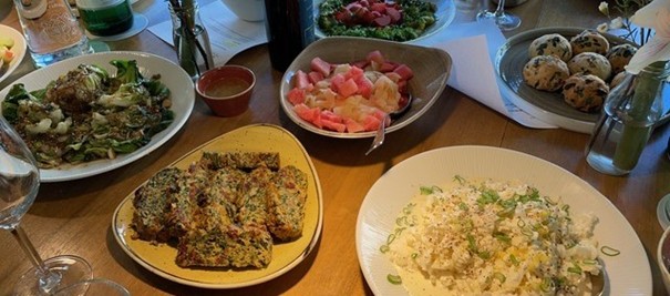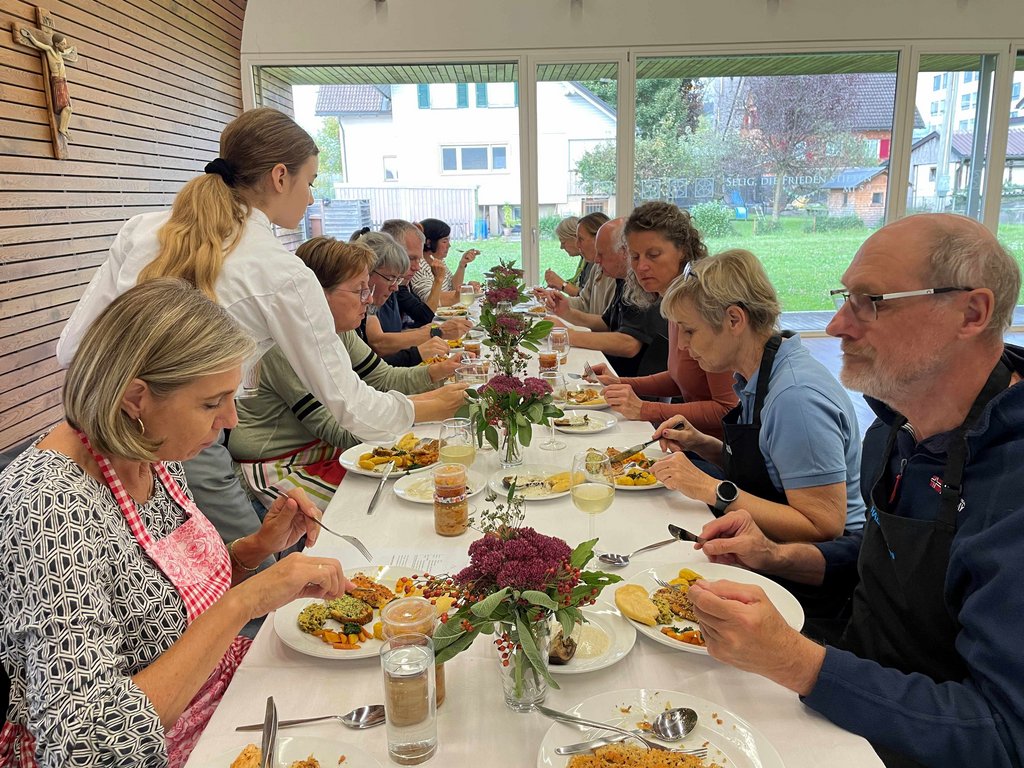 Anschließend wurde in der Küche des Pfarrheims Schoren fleißig geschnipselt, geschmort, gebacken und gegrillt – und das beinahe ausschließlich mit Gemüse und Kräutern. Einzig ein Lachs bildete die Ausnahme: Mit einer feinen Kräuterkruste gebraten, fügte er sich perfekt in die Vielfalt der vegetarischen Beilagen ein.