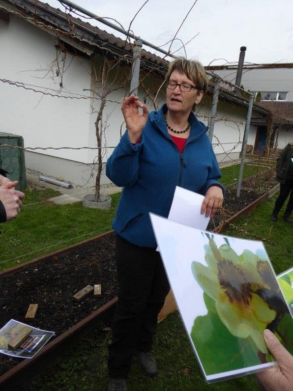 So war es möglich, dass alle Anwesenden die Informationen erhielten und bei den Kiwis gleich mithelfen konnten. So mussten alle ausgewickelt werden, damit die Ruten nicht erdrückt wurden. Biobäurin Marianne Scheidbach aus Göfis zeigte sehr gut, was jetzt zu erledigen ist, damit es im Herbst eine reiche Ernte gibt. Sie gab viele praktische Tipps, wie zum Beispiel: Wenn man eine Pergola möchte, legt man die männlichen Pflanzen über die weiblichen, damit sie diese gut bestäuben können. Wenn die Blüten verblüht sind, sc