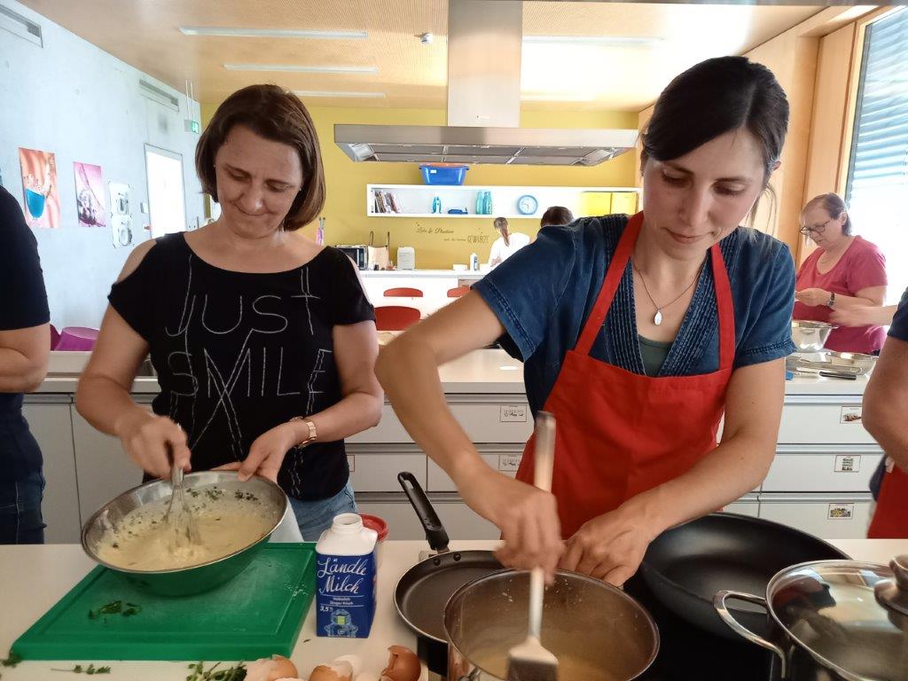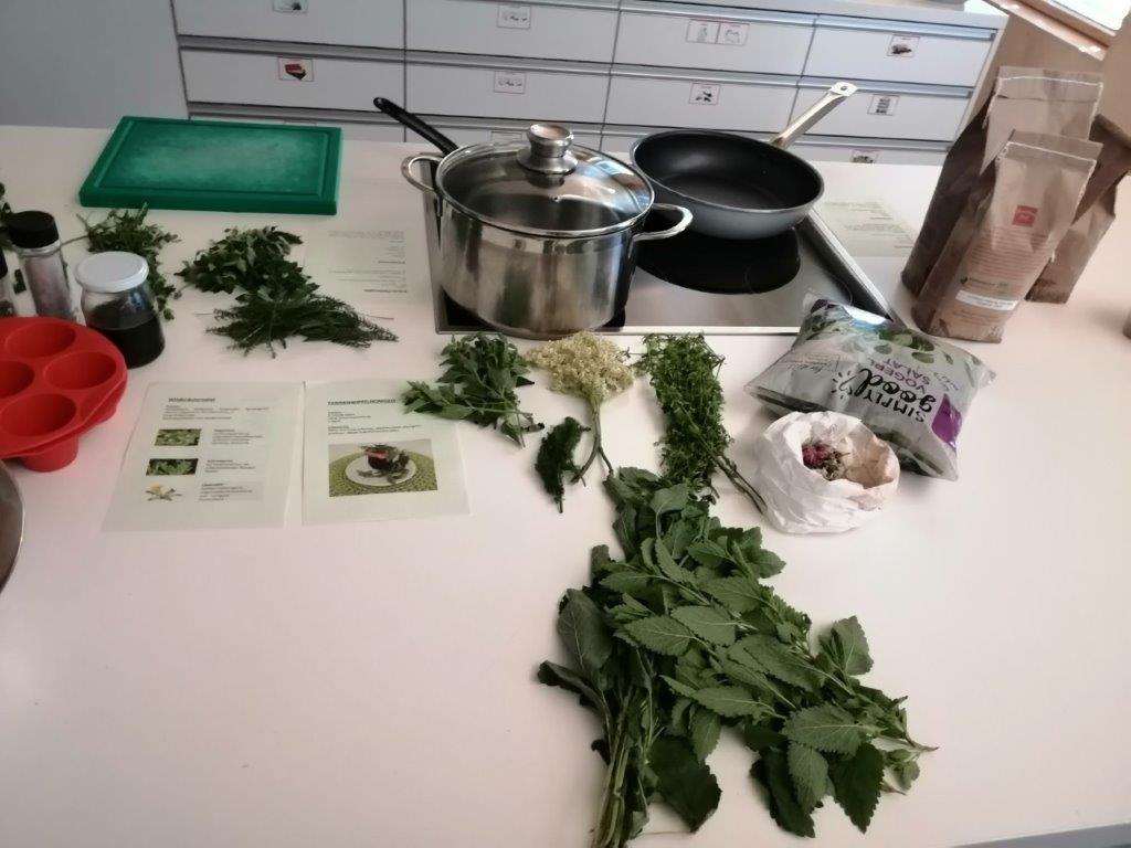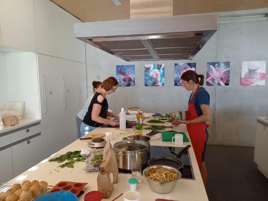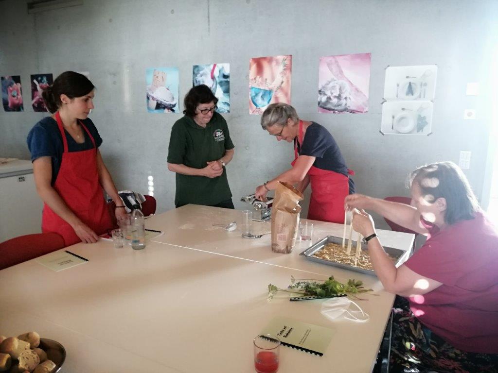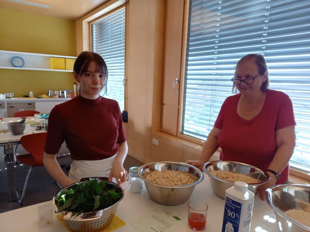 Sieben begeisterte Köchinnen und ein Koch stürzten sich nach ein paar eingehenden Informationen zu den Kräutern mit Feuereifer ins Verarbeiten von Brennnesseln, Giersch und co. Mit Hingabe wurde gemixt, gehackt, gemörsert um die verschiedenen Gerichte herzustellen. Mit großer Begeisterung wurden zum Schluss der Smoothie probiert und als Vorspeise ein köstlicher Wildkräutersalat mit Kräuterbrötchen genossen. Als Hauptspeise gab es aus Unkräutern Pesto- und Knödelvariationen, selbst gemachte Nudeln und als krönenden Abschluss ein Eisparfait.