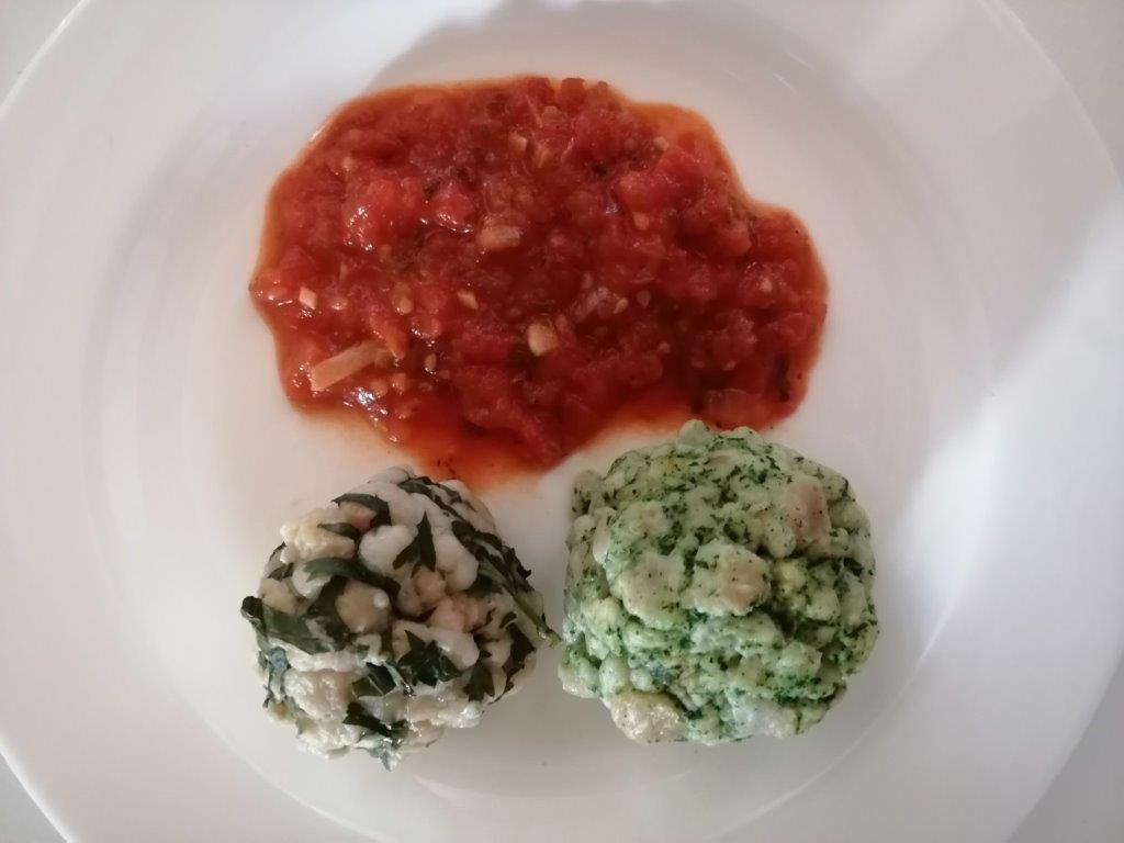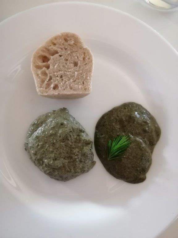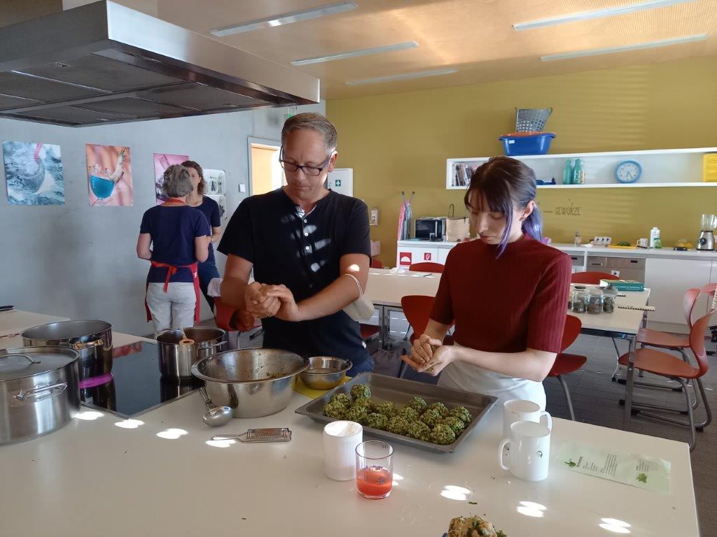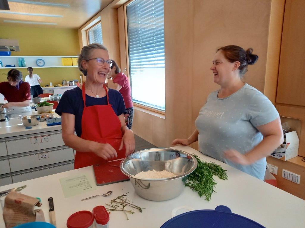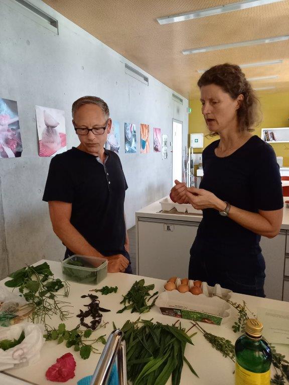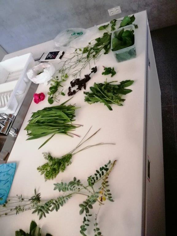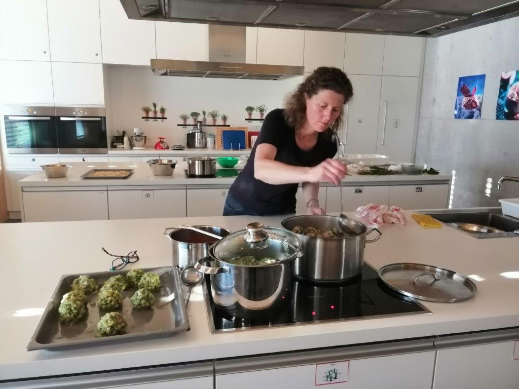 Sieben begeisterte Köchinnen und ein Koch stürzten sich nach ein paar eingehenden Informationen zu den Kräutern mit Feuereifer ins Verarbeiten von Brennnesseln, Giersch und co. Mit Hingabe wurde gemixt, gehackt, gemörsert um die verschiedenen Gerichte herzustellen. Mit großer Begeisterung wurden zum Schluss der Smoothie probiert und als Vorspeise ein köstlicher Wildkräutersalat mit Kräuterbrötchen genossen. Als Hauptspeise gab es aus Unkräutern Pesto- und Knödelvariationen, selbst gemachte Nudeln und als krönenden Abschluss ein Eisparfait.