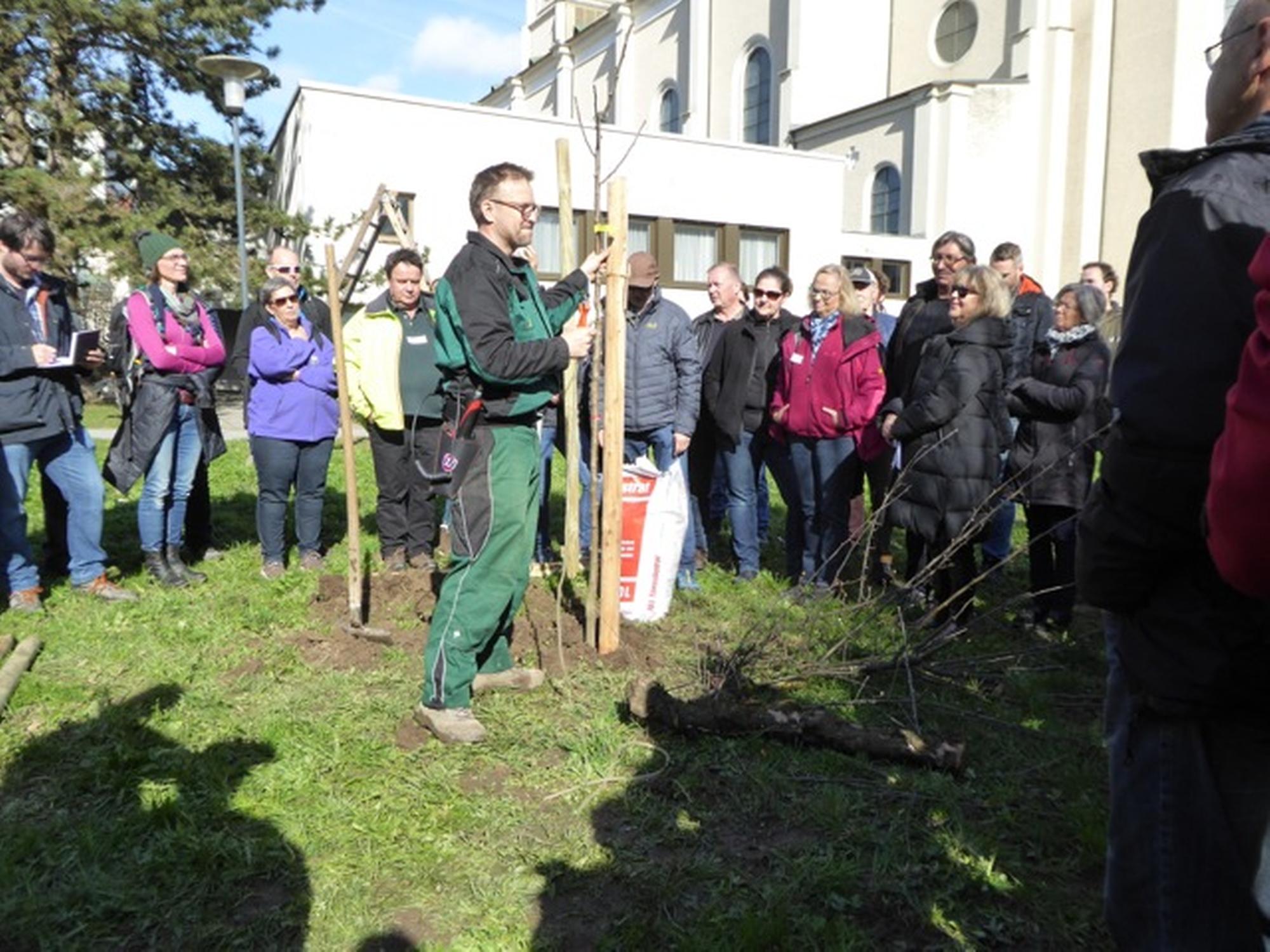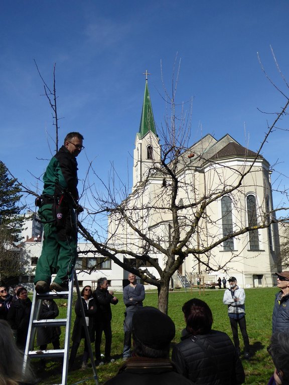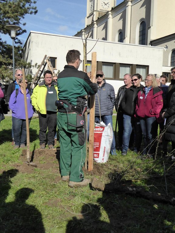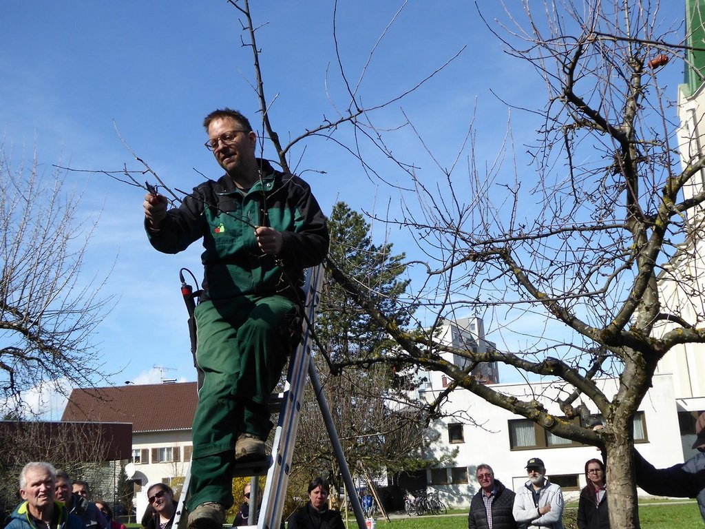 Christian Knaus zeigte dabei sehr ausführlich, was beim Setzen eines neuen Baumes beachtet werden muss. Die im vergangenen Jahr gepflanzten Bäume wurden besprochen und die entsprechenden Schnittmaßnahmen durchgeführt. Er verband Theorie und Praxis, erklärte Trieb und Knospenarten und wie ein Baum reagiert, wenn entsprechende Schnitte durchgeführt werden.