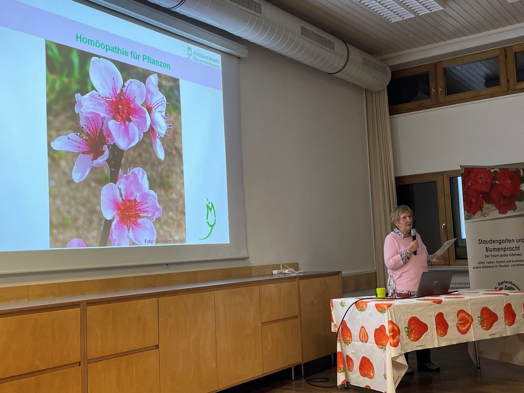 Frau Maute erklärte, wie sie erfolgreich Homöopathie nicht nur für den Menschen, sondern auch für Pflanzen anwendet. Ihre Methoden haben sich besonders in der Behandlung von Pflanzen bei Witterungseinflüssen wie Frost, Hagelschäden oder Hitze sowie bei Schwächen durch schlechtes Wachstum oder Verletzungen wie Schnittwunden als wirksam erwiesen. Sie stellte verschiedene bewährte Mittel vor, die gezielt bei den häufigsten Pflanzenkrankheiten und bei Schädlingsbefall helfen können. Besonders spannend war ihr Hinweis auf die neue Methode, homöopathische Mittel schnell anhand der Pflanzenfarben zu erlernen, eine Technik, die für viele Anwesende einen neuen Zugang zur Behandlung von Pflanzen eröffnete.