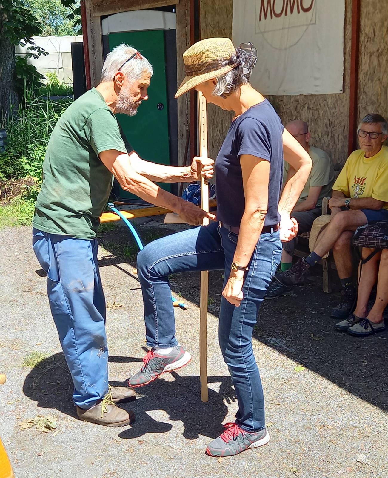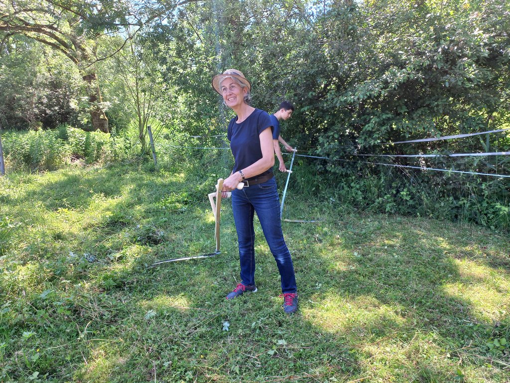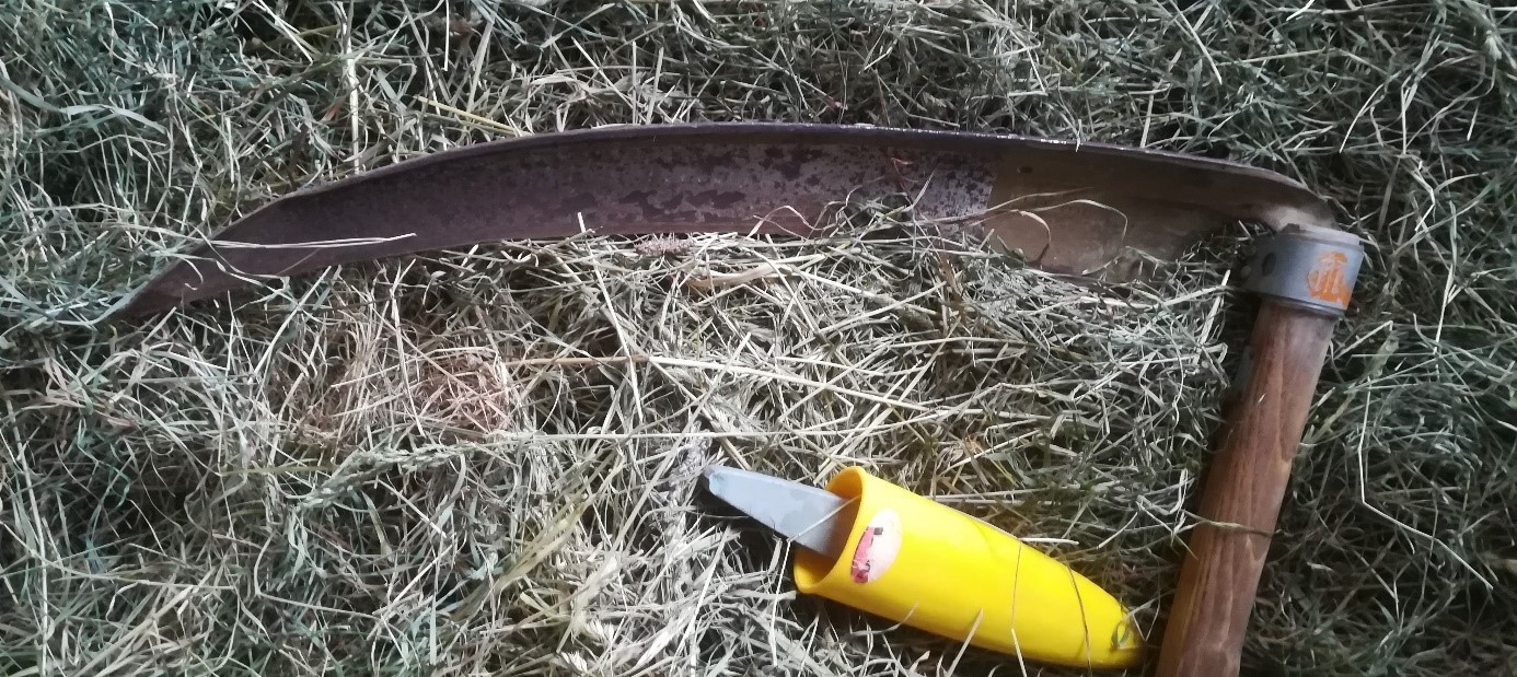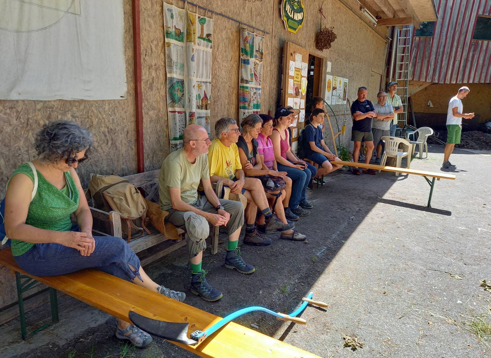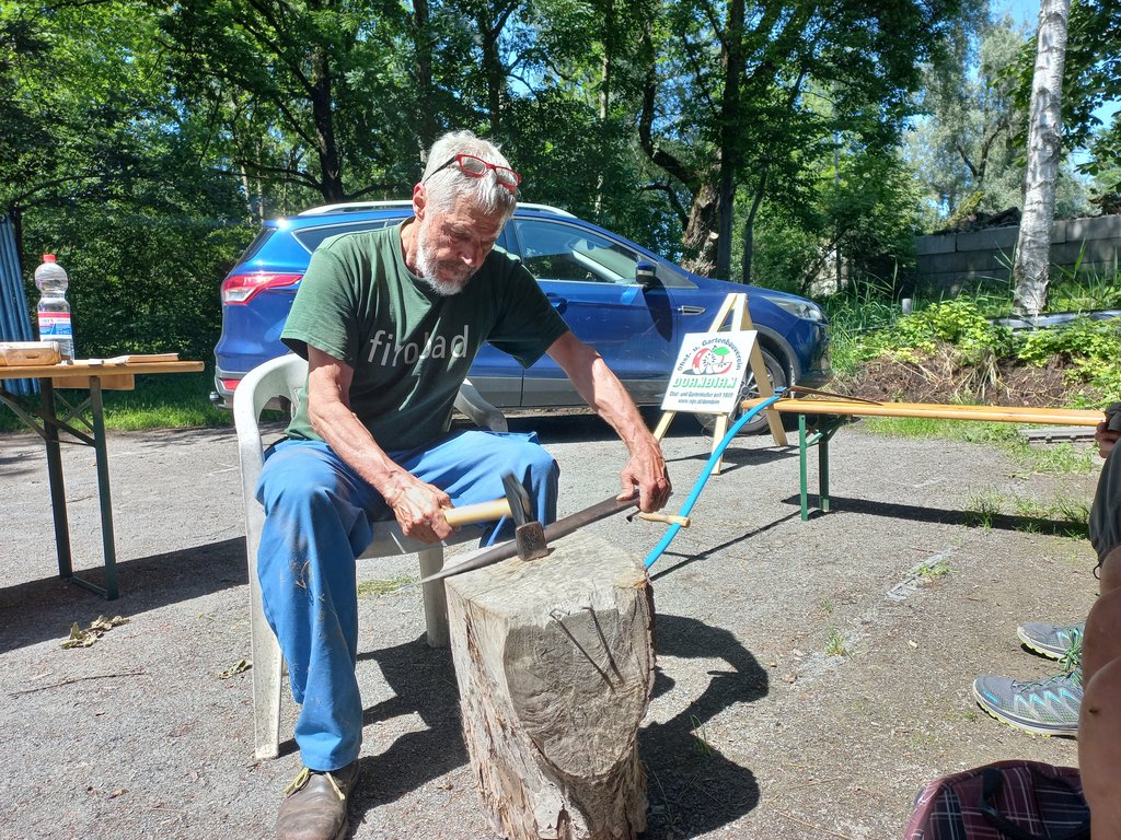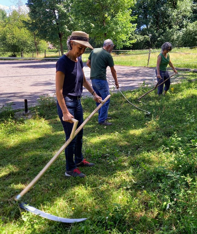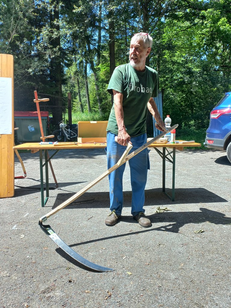 Bei strahlendem Sonnenschein trafen sich einige Interessierte um das Mähen von Hand mit der Sense zu lernen bzw. zu erfahren, welche Tricks und Kniffe beachtet werden müssen, damit dies einfach und ohne großen Kraftaufwand geht.