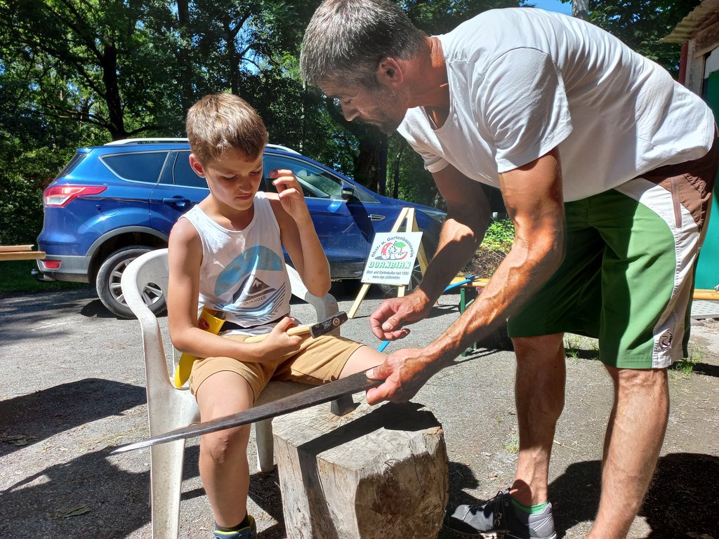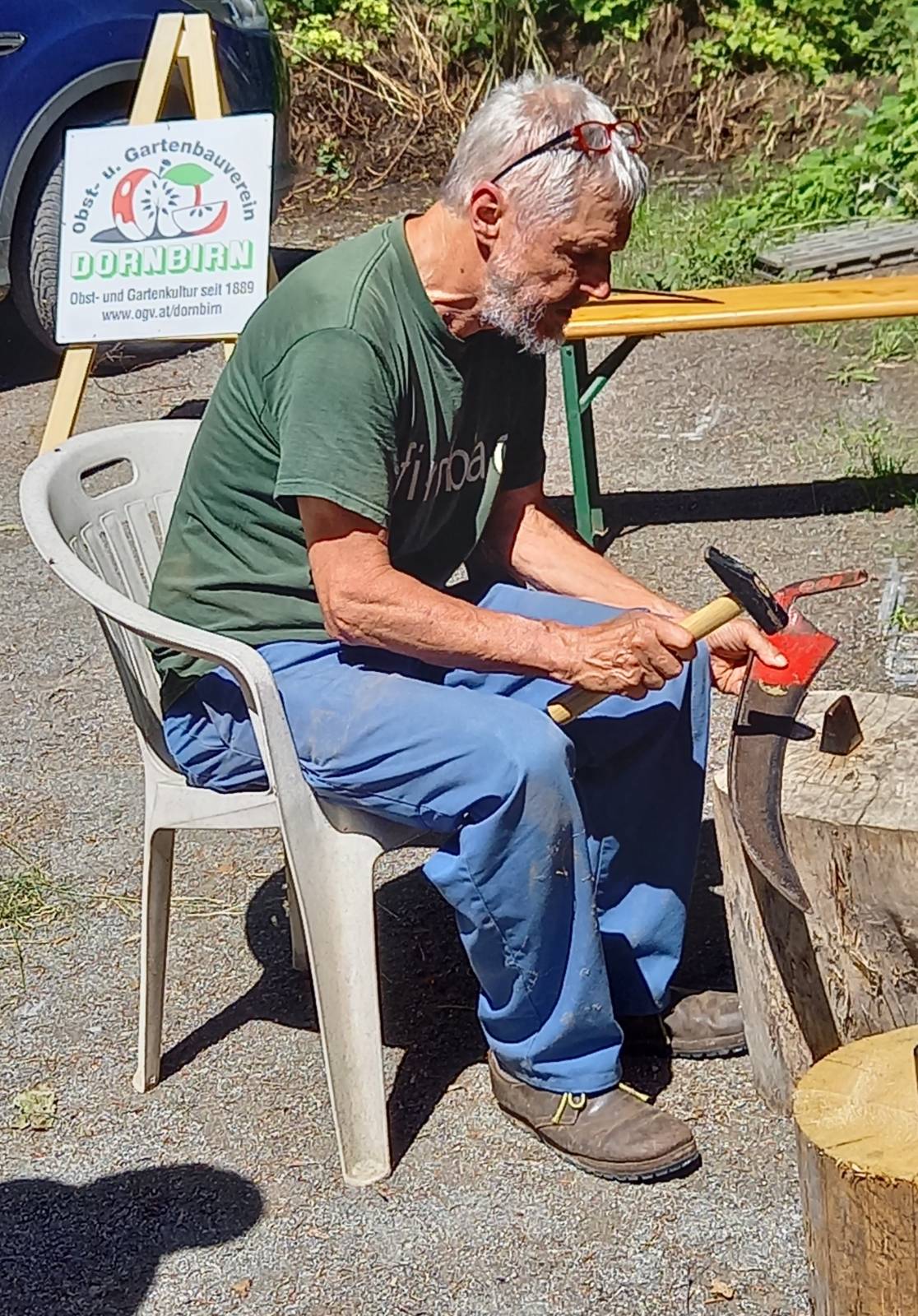 Der Kursleiter Wolfgang Juen erklärte sehr ausführlich, wie die Sense eingestellt sein sollte und wie gedengelt wird. Anschließend konnten die Kursteilnehmer selbst Hand anlegen und mähen. Dabei waren sie zum Teil überrascht, wie einfach es ist, wenn man weiß, wie es geht und die Sense einen guten „Dengel“ hat.