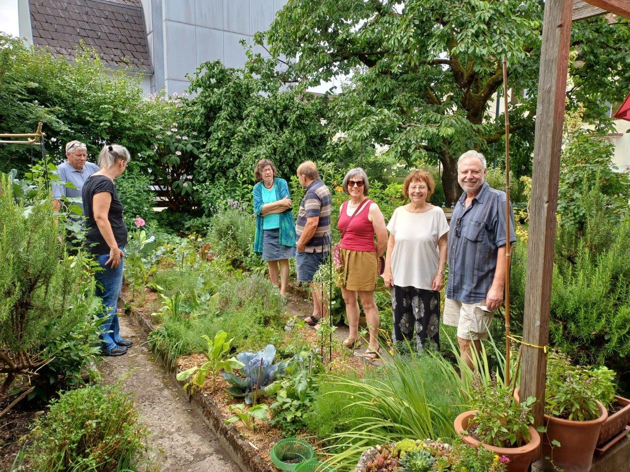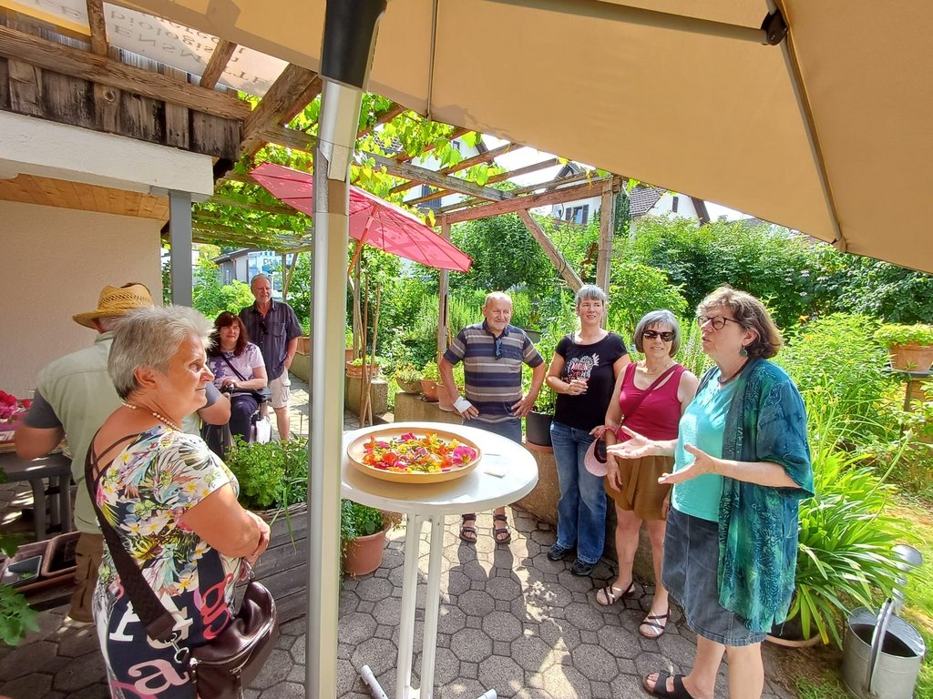 Ein Highlight war der Stadtgarten von Ingrid Benedikt in der Nachbauerstraße. Hier zeigte sich die Kraft der Vielfalt: Neben knackigem Salat wuchsen bunte Mohnblumen, Kapuzinerkresse rankte sich zwischen Heidelbeeren, Bergflockenblumen und Erbsen. Besonders ins Staunen versetzten die Rattenschwanzrettiche, eine außergewöhnliche Rarität. Als kleines Andenken durften die Besucher:innen Samen dieser Pflanze mit nach Hause nehmen. Bei erfrischendem Erdbeersaft, Pfefferminz-Zitronen-Wasser und kleinen Häppchen mit Kräuterbutter und Kapuzinerkresse-Frischkäse-Pesto wurde geplaudert, genossen und fleißig Gartenerfahrung ausgetauscht.