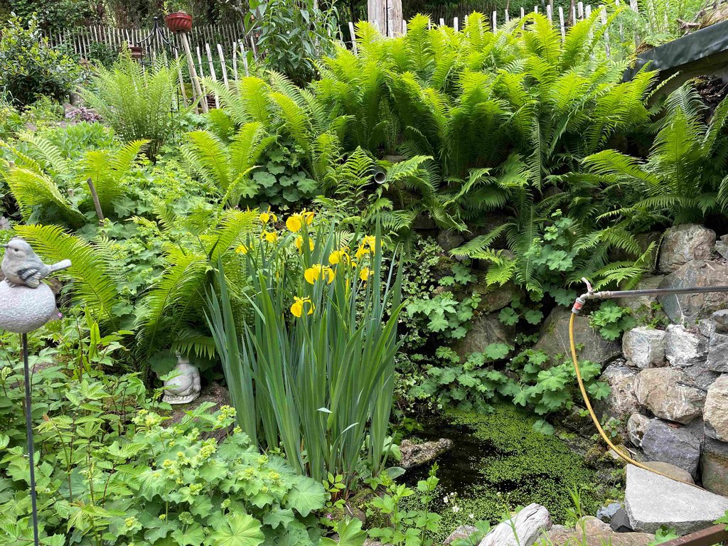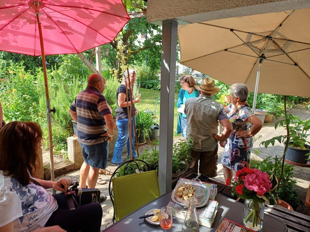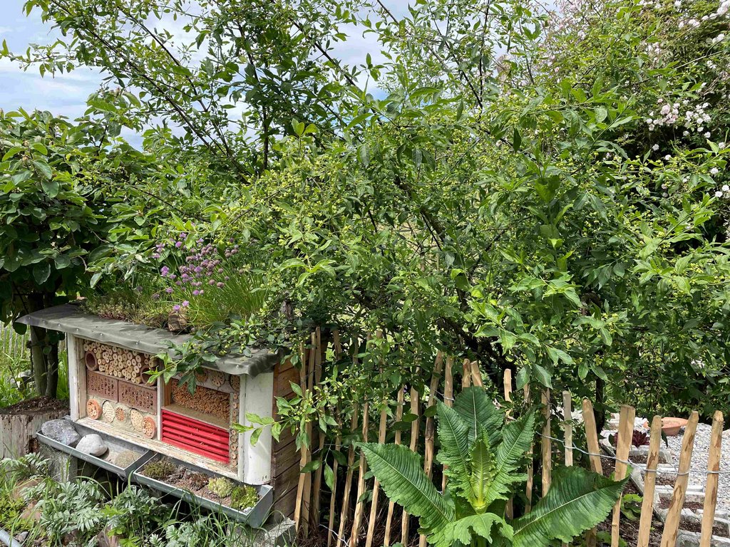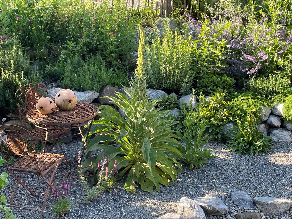 Auch bei Margit Rusch war der Garten für Besucher:innen geöffnet. Ihr Garten lud nicht nur zum Verweilen ein – bei Kaffee, Kuchen, Saft und Wasser – sondern bot auch ein vielfältiges Rahmenprogramm: Dekorative Gartenobjekte konnten erworben werden, Broschüren zu Naturgärten und Permakultur lagen zur freien Entnahme bereit, und fachkundige Führungen zu den Themen Permakultur und Kräuter rundeten das Angebot ab. Der Garten selbst zeigte eindrucksvoll, wie ein naturnaher Lebensraum voller Vielfalt und Funktion entstehen kann.
