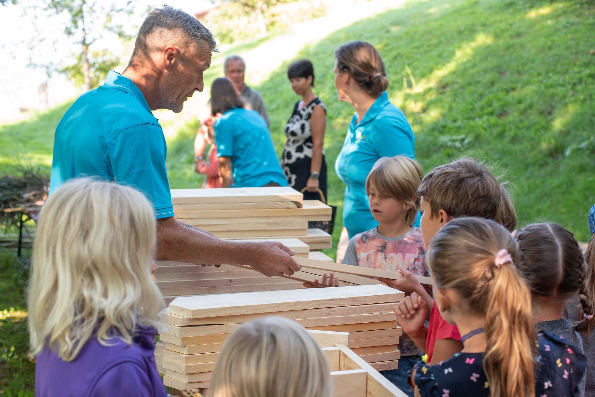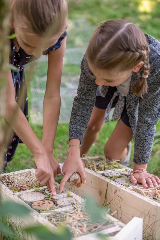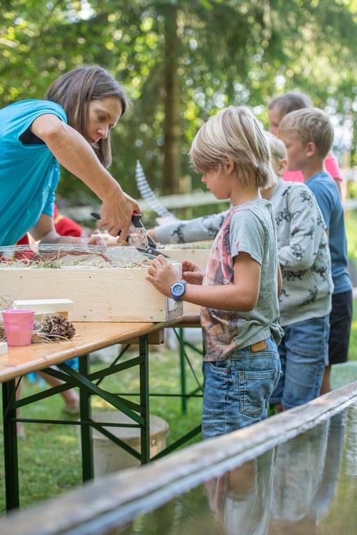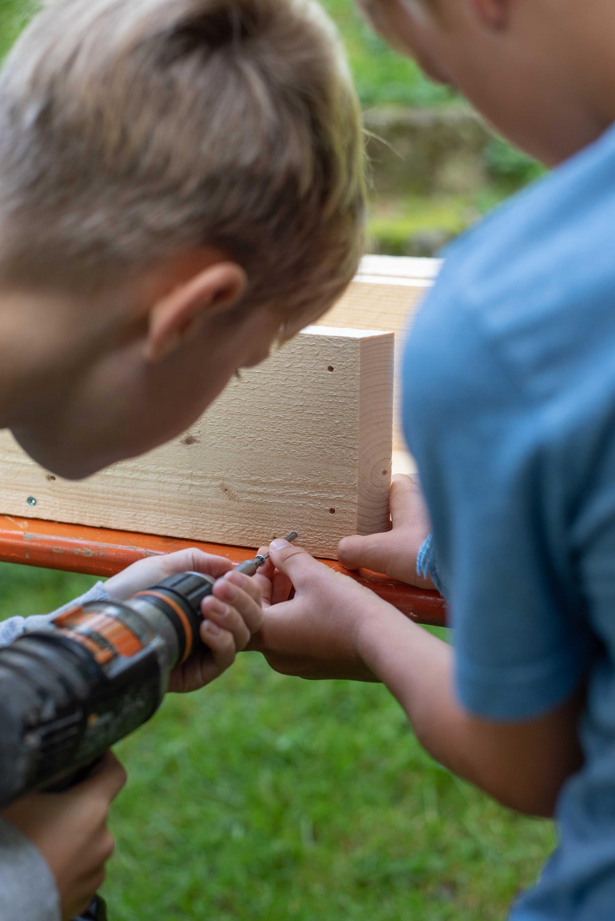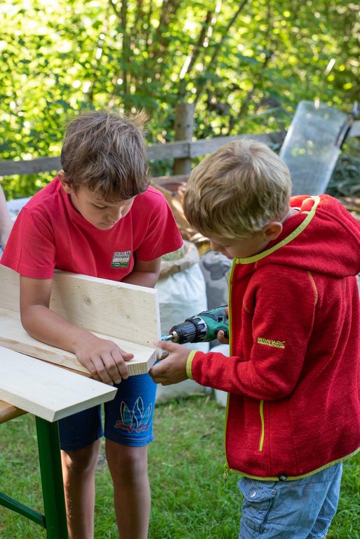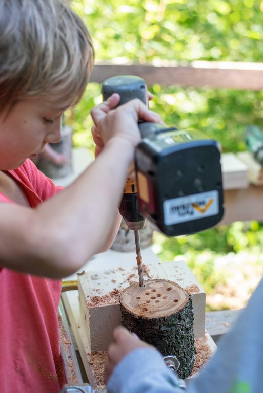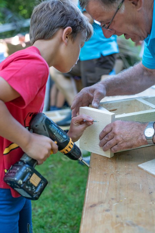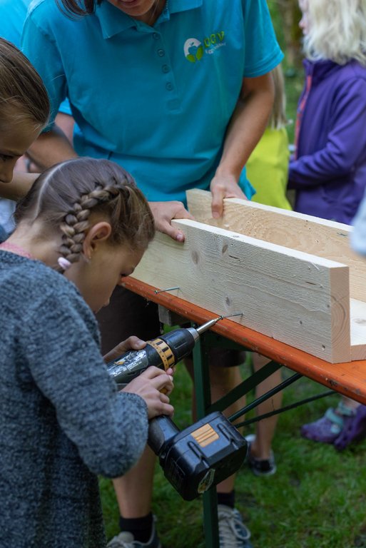 Unter fachkundiger Anleitung von Sepp und Hans wurden die Insektenhotels mit echten Akku-Schraubern zusammen geschraubt. Wir befüllten sie anschließend mit Aststücken, Holzwolle und Schilfrohren und befestigt wurde das Ganze mit einem Hasengitter. Zur Stärkung gab es eine Jause mit selbstgemachtem Kuchen, Brötchen, Käsewürfeln und frischem Gemüse.