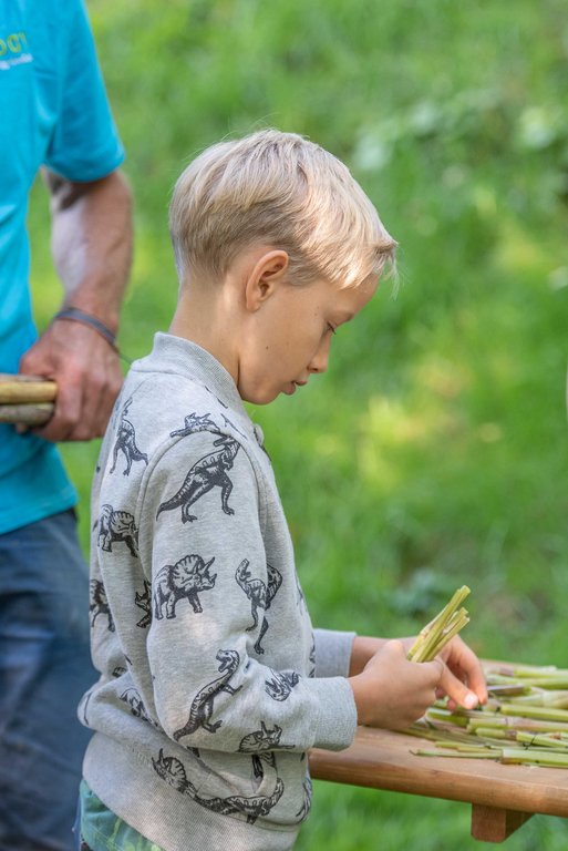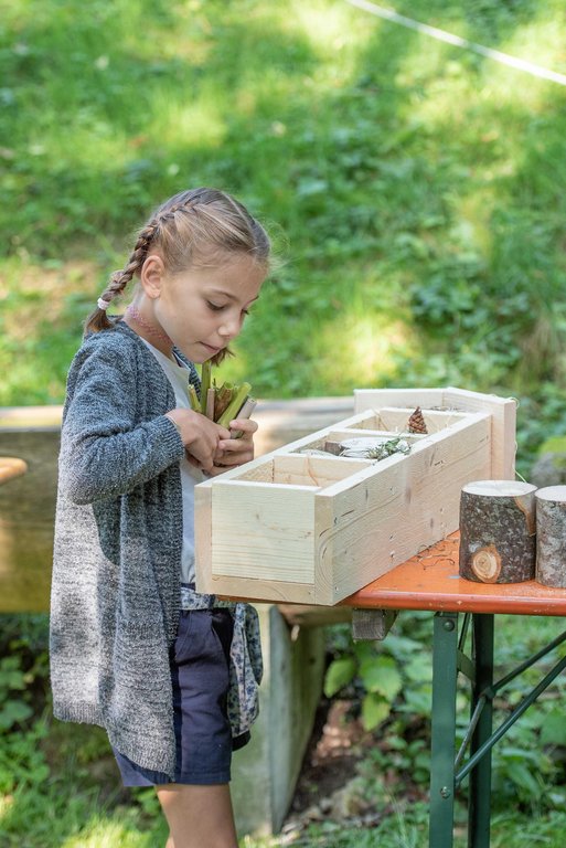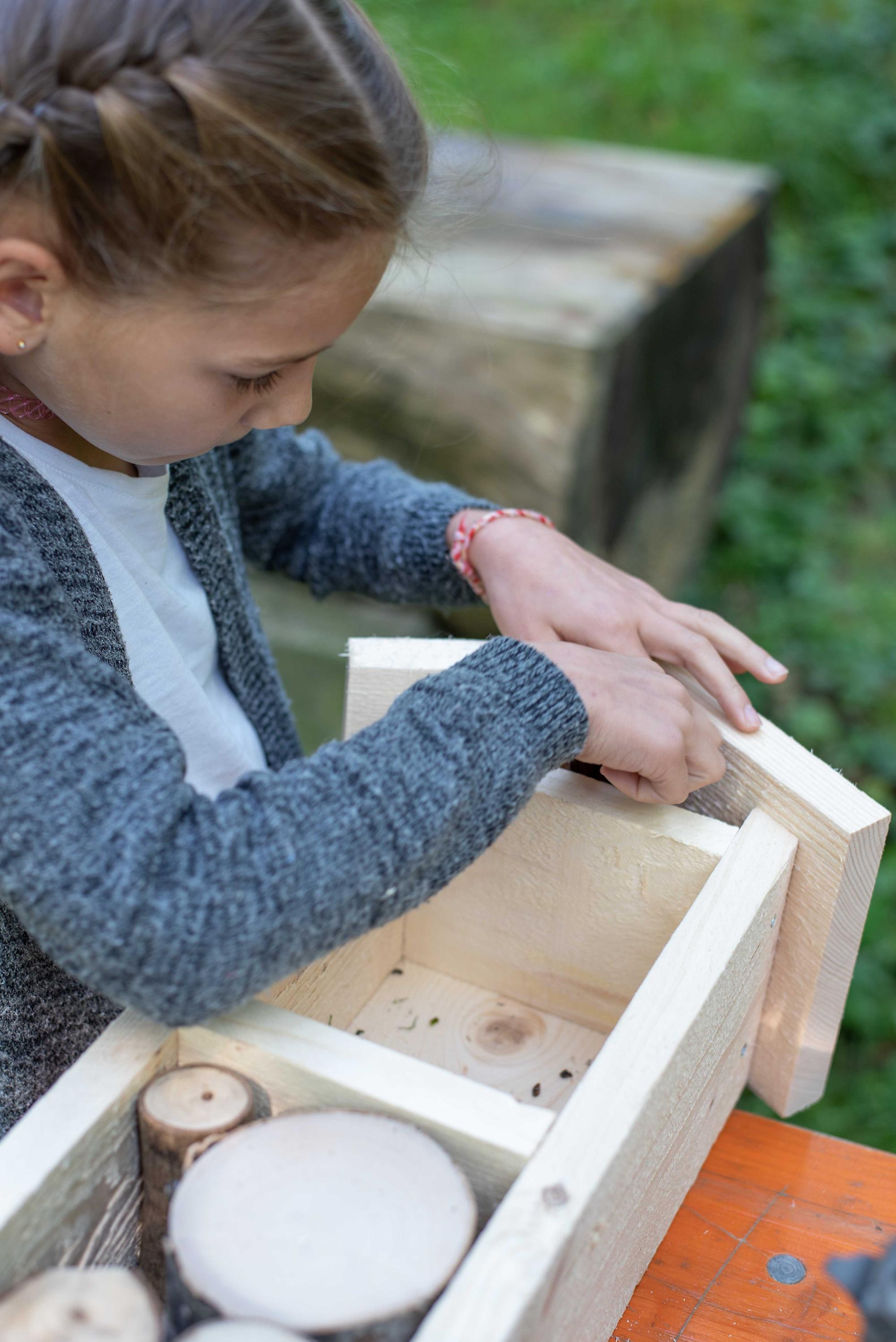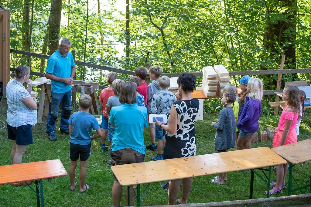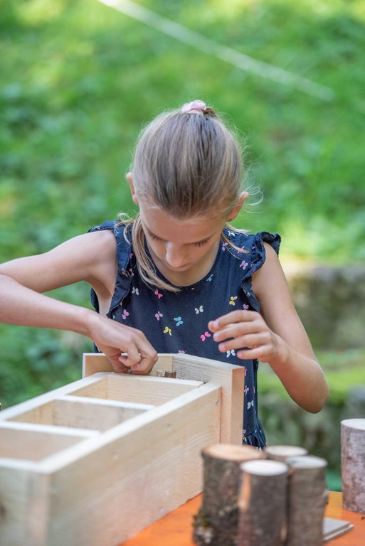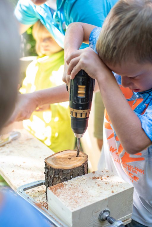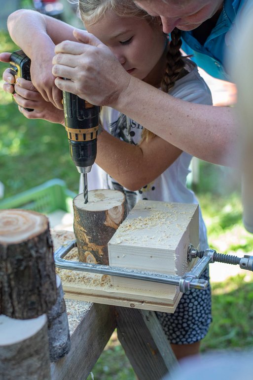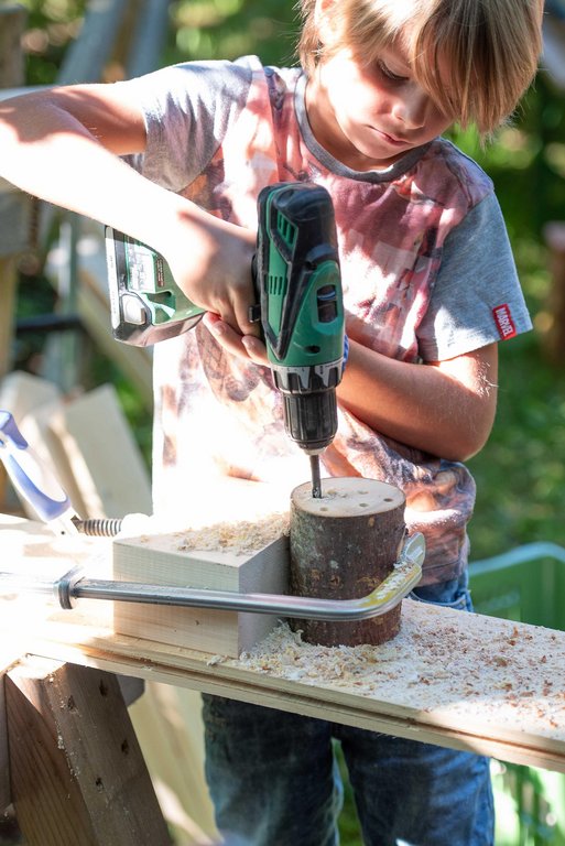 Unter fachkundiger Anleitung von Sepp und Hans wurden die Insektenhotels mit echten Akku-Schraubern zusammen geschraubt. Wir befüllten sie anschließend mit Aststücken, Holzwolle und Schilfrohren und befestigt wurde das Ganze mit einem Hasengitter. Zur Stärkung gab es eine Jause mit selbstgemachtem Kuchen, Brötchen, Käsewürfeln und frischem Gemüse.