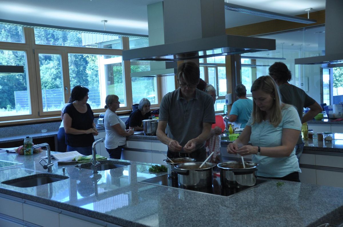 Dank der Gemeinde Frastanz konnten wir die gut ausgestattete Schulküche der Mittelschule Frastanz benutzen. Dank Sigrids Vorbereitungen gab es große Mengen fein geschnittenen Gemüses, viele Gewürze, pikante Essige und schon ging's los.