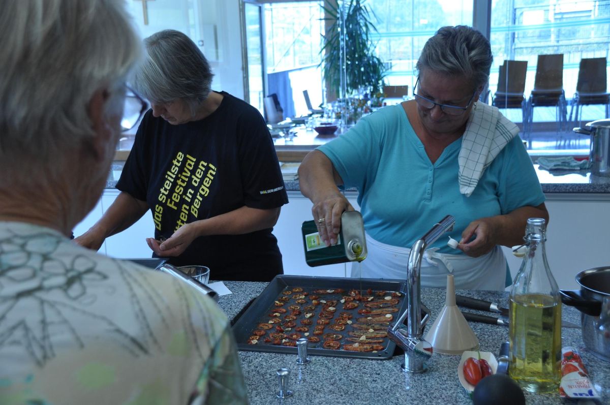Tomaten wurden in Scheiben geschnitten und mit Kräutern und Knoblauch im Rohr getrocknet. Das ergab nach zwei Stunden intensive Beigaben für allerlei Gerichte. Dann ging's zum Salsa. Hier kam die Schneidekunst von Sigrid zu Geltung. Feinwürfeliges Gemüse wurde mit Wein und Gemüsesud versetzt, gewürzt und reduziert. Ganz nebenbei gab's auch gleich ein würziges Sugo, um der Tomatenschwemme Herr zu werden. Alles in Gläser über Monate haltbar.