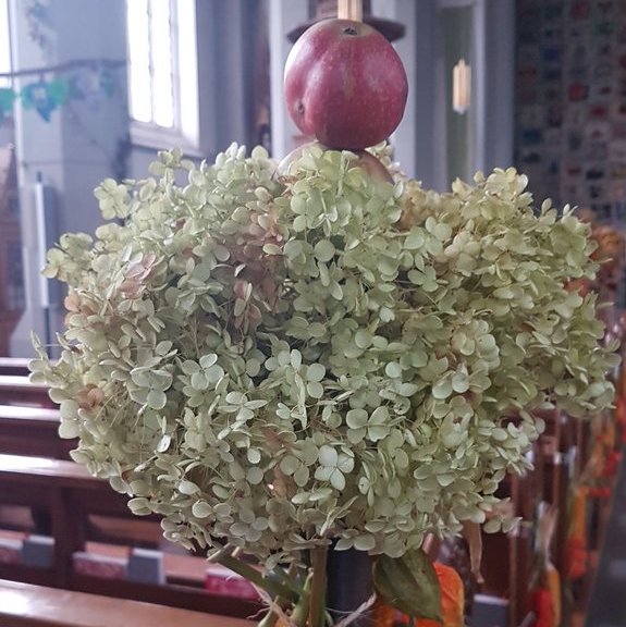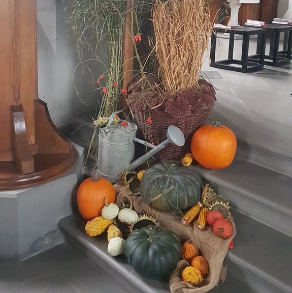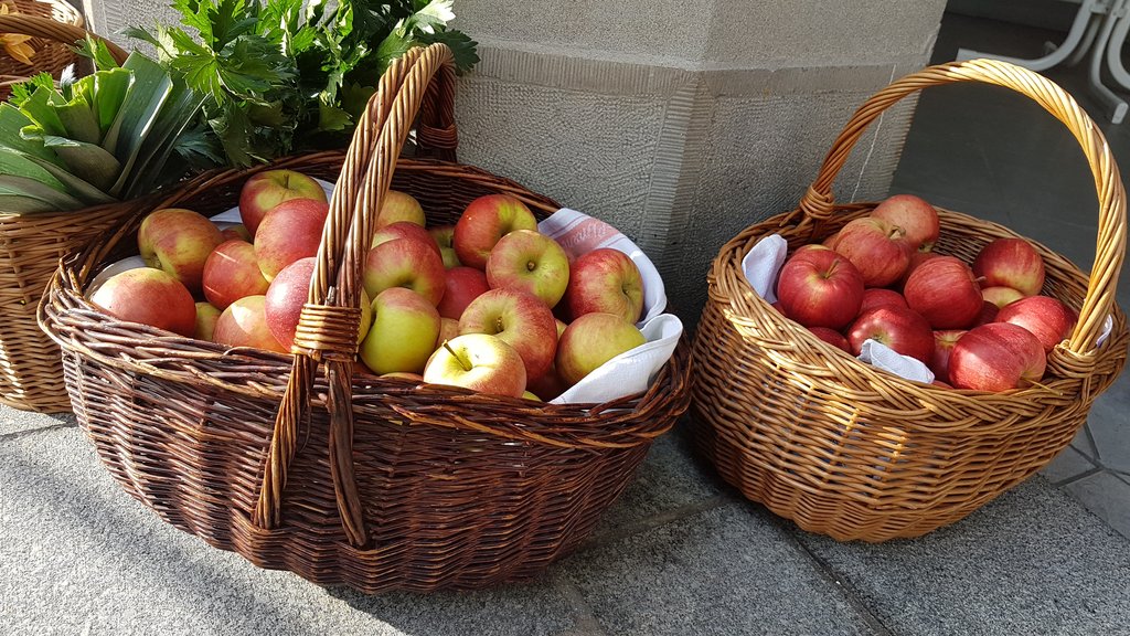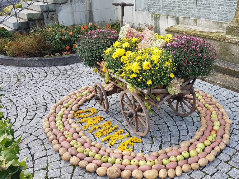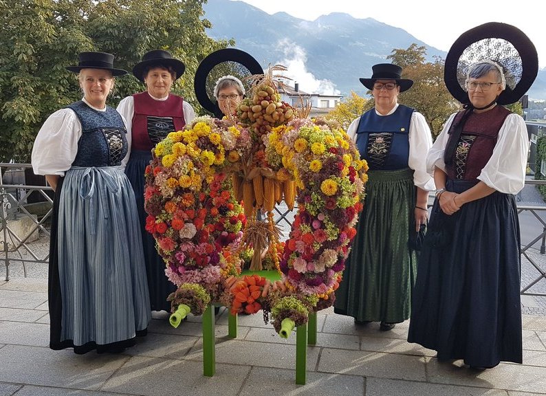 Auf dem Kirchplatz wurde der reich gefüllte Erntewagen von den Kirchenbesuchern bestaunt. Im Anschluss an den Gottesdienst erfreuten sich die Kirchenbesucher an den Äpfeln, die vom OGV verteilt wurden und an den Brötchen und Kuchen, welche von den Frastanzer Bäuerinnen spendiert wurden.