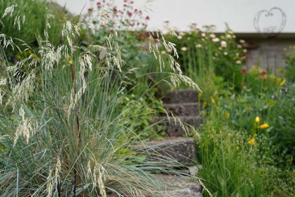 Blütenhecken und Wiesen ergänzen den Garten, der durch steile Wege erschlossen wird.