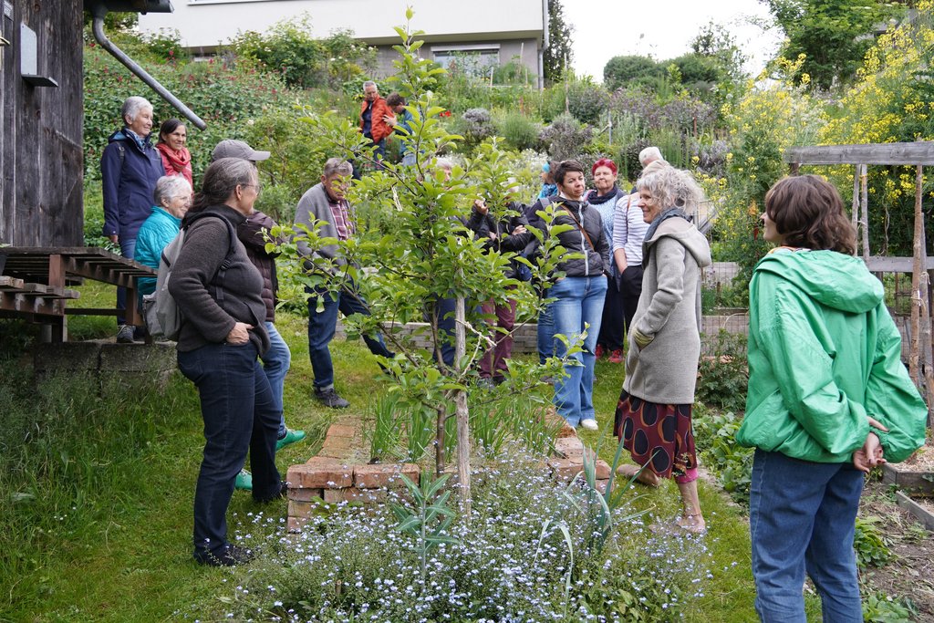 Kompost wird gemacht, holziges Schnittgut in Benjes Hecken verwertet, ein Teich, Trockenstandorte, Gemüse an einem Rahmen hochgeleitet, Minikiwi, Maibeere, Khaki, Brombeeren, Andenbeeren, Erdbeeren und allerlei Gemüse wird hier kultiviert.