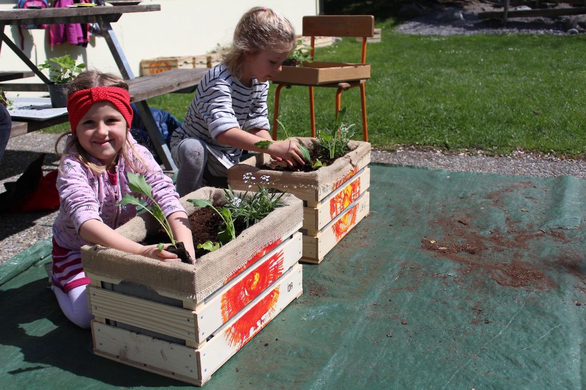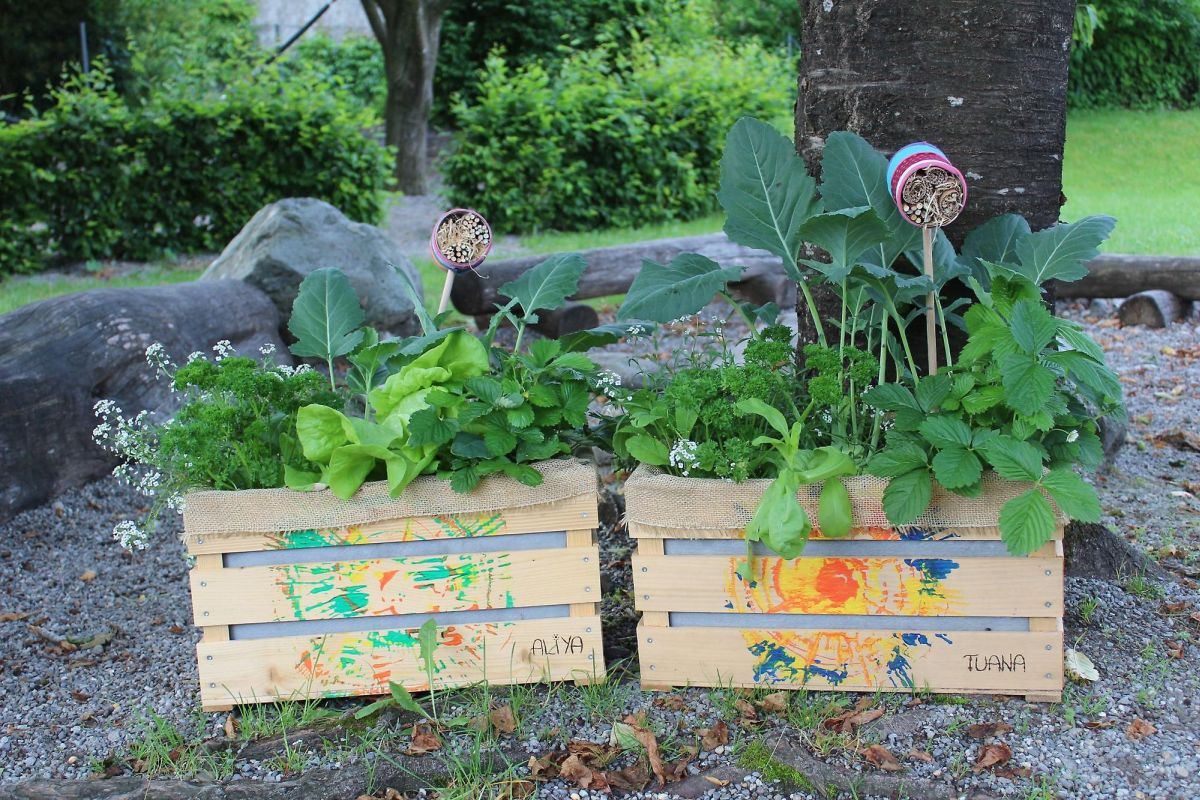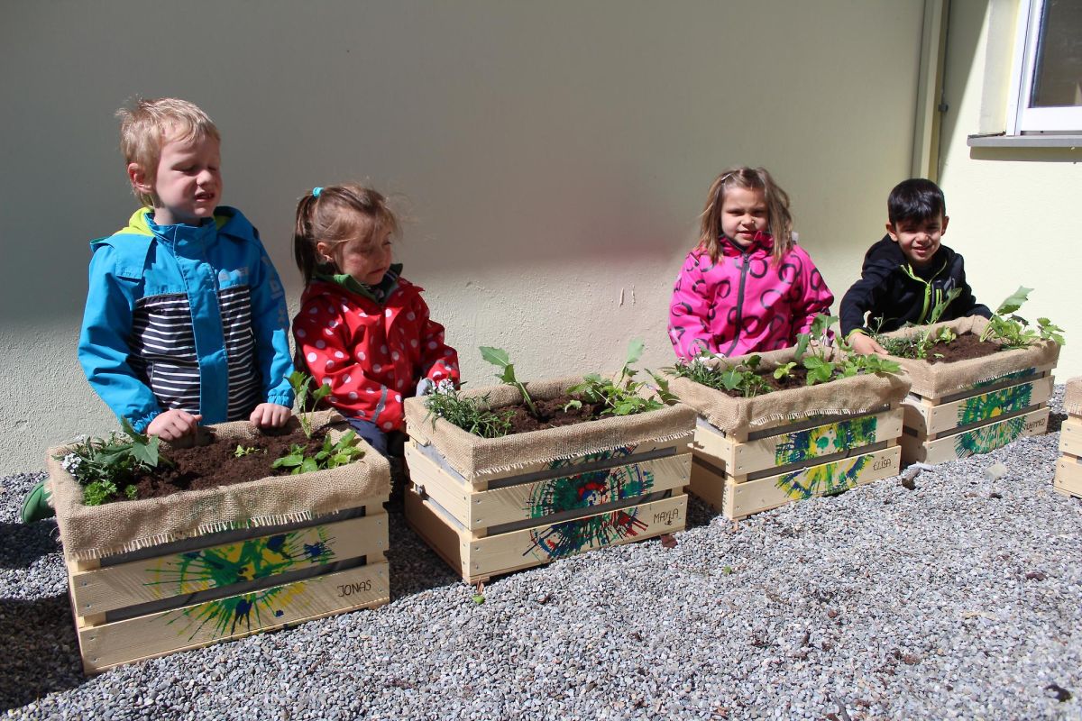 Im Kindergarten Einlis baute das Kindergartenteam und Mitglieder des OGV Frastanz 38 Holzkisten zusammen. Die Kinder waren mit sehr viel Eifer dabei und haben fleißig genagelt, geschraubt, bemalt, mit Vlies ausgekleidet und mit Gartenerde gefüllt. Besonders gefreut haben sich die Kinder bei der Bepflanzung von Salat, Gemüse, Blumen, Kräutern und Beeren.