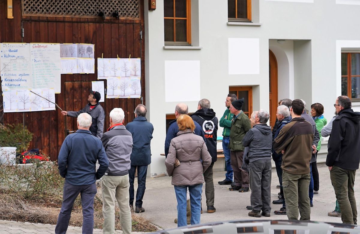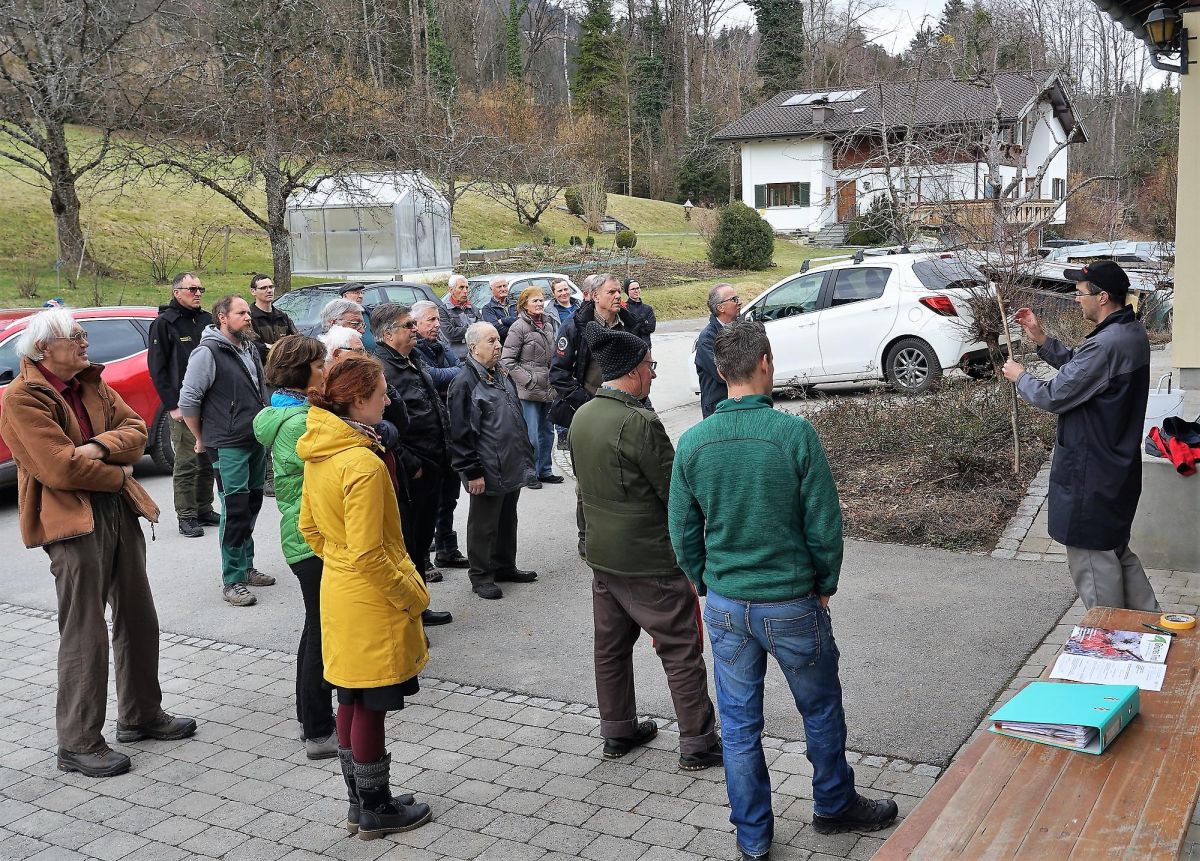 Jürgen startete mit der Erläuterung der Schnittgesetze. Starker Schnitt regt zu starkem Wiederaustrieb an. Vorsichtiger Schnitt hält den Baum eher ruhig, birgt aber die Gefahr zu dichter Kronen. Er erläuterte weiters, wie Bäume bei frühem Schnitt im Jahr reagieren. Welche Auswirkungen hat ein später Schnitt im April? Was ist im Frühsommer zu tun? Mit großem Interesse folgte die 26 Teilnehmer seinen Ausführungen.