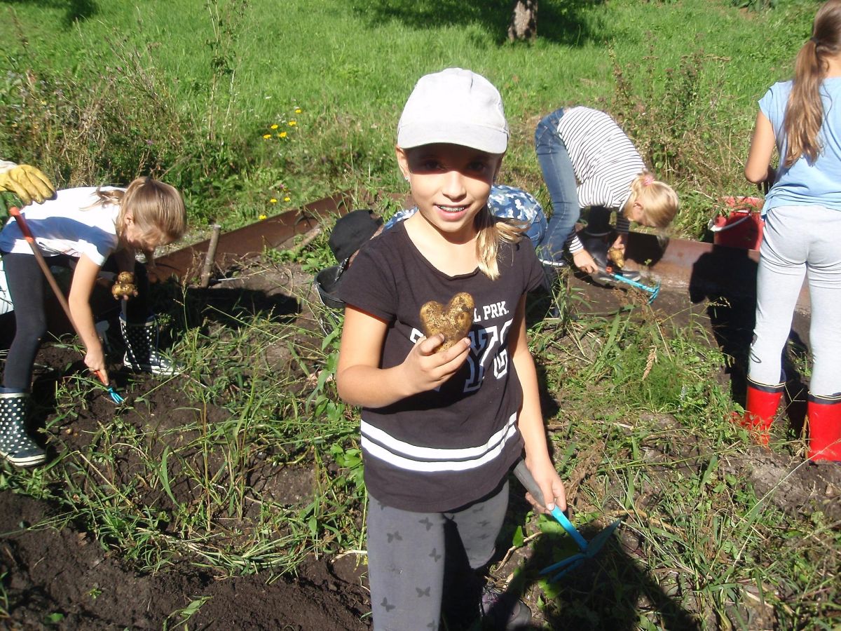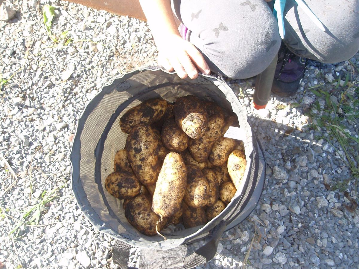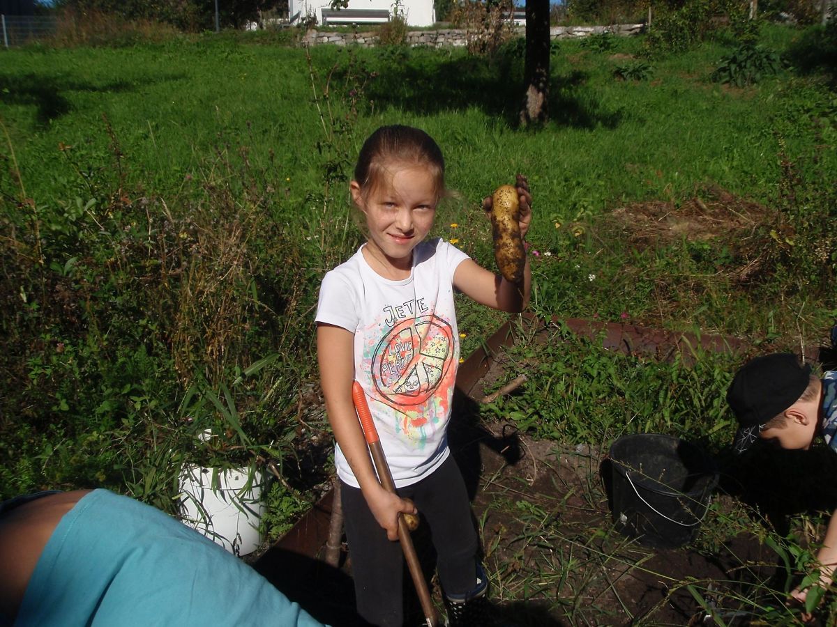 Auch bei der Ernte der Kartoffeln wurde zuerst das abgestorbene Kartoffelkraut und das Unkraut entfernt. Danach gingen die Schüler auf Kartoffelsuche - und sie wurden fündig! Die Kinder konnten eine tolle Ernte einfahren. Hier wurde mit Senf eingesät.