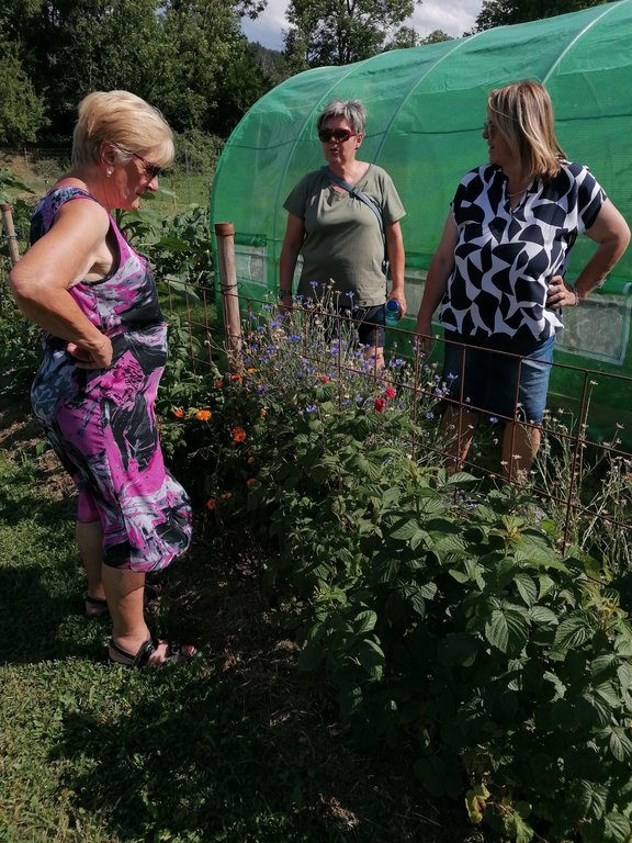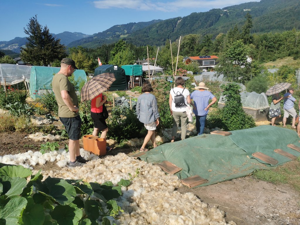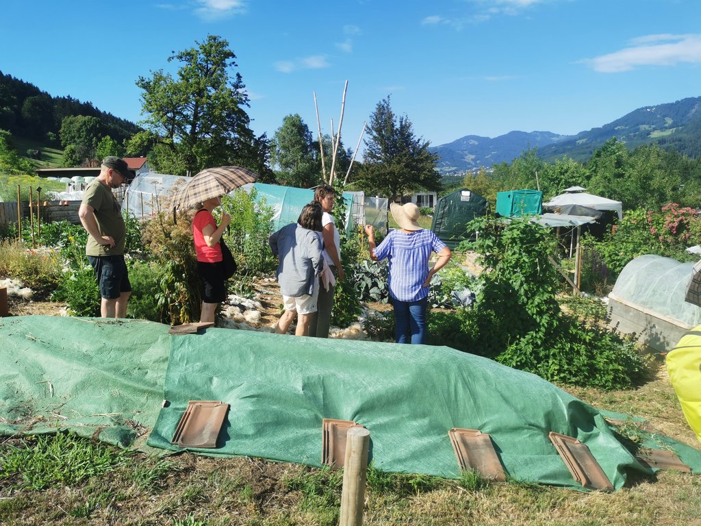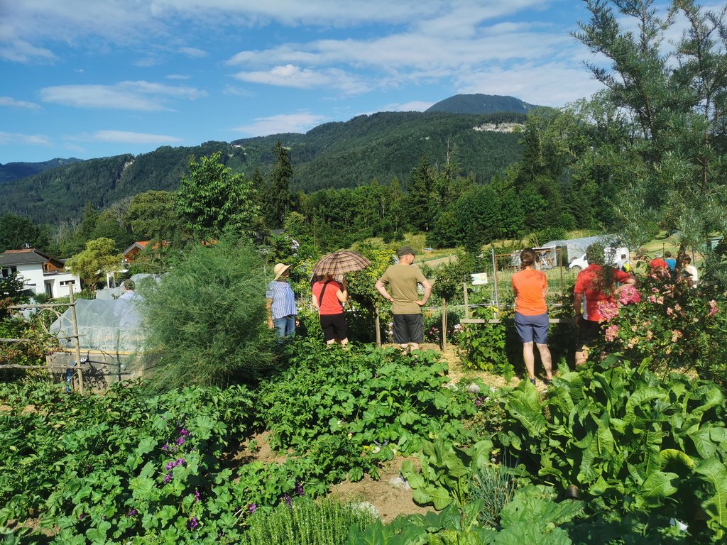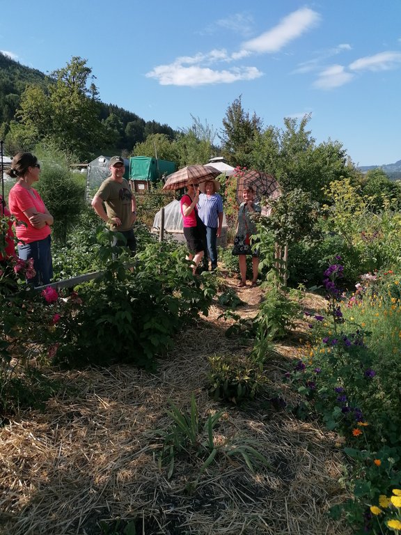 Zuerst wurden wir von Karin Bösch durch das liebevoll gepflegte und gestaltete Gartenparadies der Familien Bösch/Morscher geführt. Mit einer Vielzahl an Gemüsepflanzen, Beerensträucher und Obstbäumen sorgt sie für gesunde Ernährung ihrer großen Familie sowie ihrer Eltern. Auch die entspannende Beschäftigung in und mit der Natur ist mit ein Motivationsgrund. Ihr ist auch eine schöne Gestaltung wichtig, was an vielen Dekorationsdetails unschwer zu erkennen ist. Obwohl es vor Ort einen Brunnen gibt, wird beim Bewässern möglichst gespart, maximal 3mal wöchentlich muss reichen. Hilfreich ist dabei auch, dass alle bepflanzten Flächen gemulcht, bzw. bedeckt sind. Sie räumt allerdings ein, dass es ihr nur durch Mithilfe von Familie und Eltern möglich ist, neben Familie und Beruf das große Areal zu bewirtschaften.