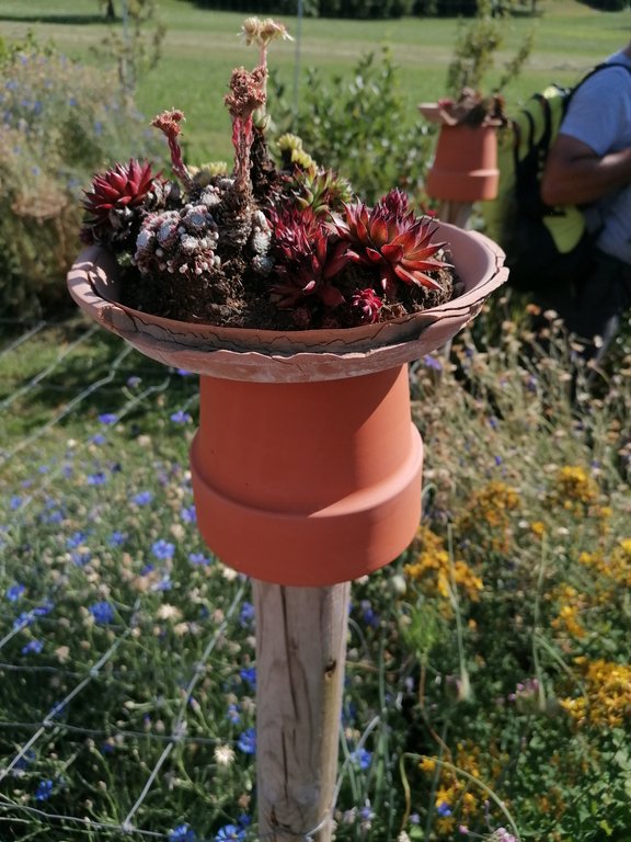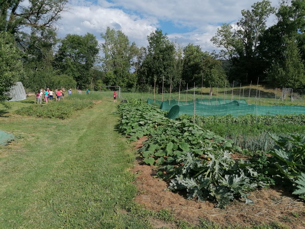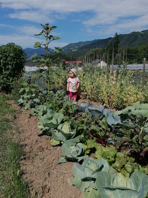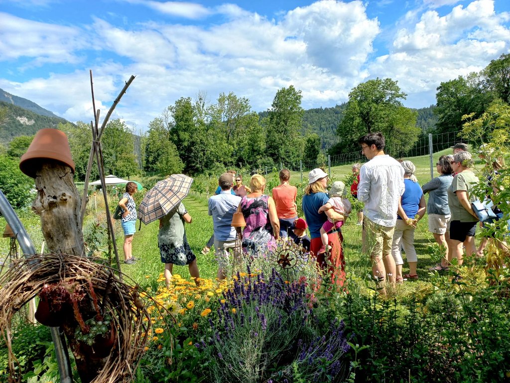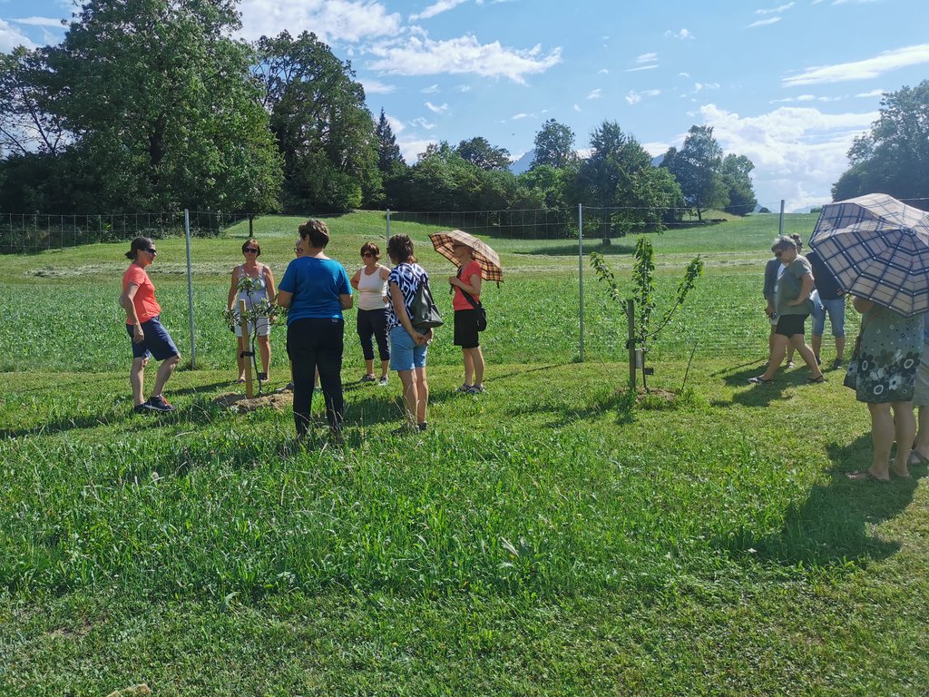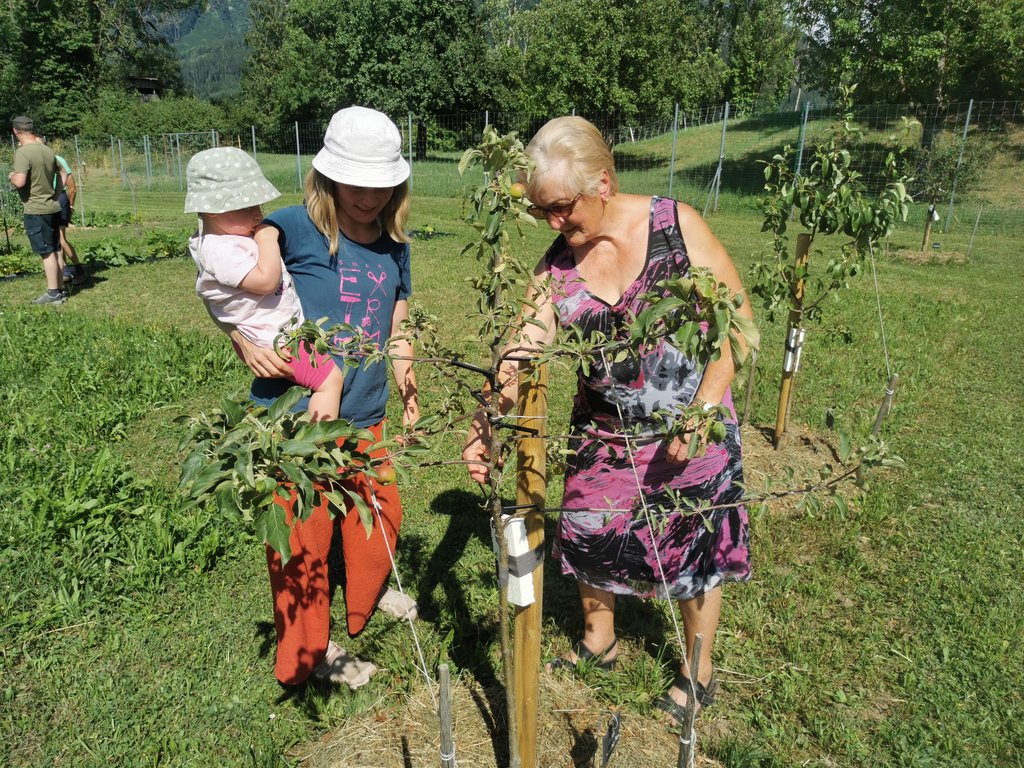 Zuerst wurden wir von Karin Bösch durch das liebevoll gepflegte und gestaltete Gartenparadies der Familien Bösch/Morscher geführt. Mit einer Vielzahl an Gemüsepflanzen, Beerensträucher und Obstbäumen sorgt sie für gesunde Ernährung ihrer großen Familie sowie ihrer Eltern. Auch die entspannende Beschäftigung in und mit der Natur ist mit ein Motivationsgrund. Ihr ist auch eine schöne Gestaltung wichtig, was an vielen Dekorationsdetails unschwer zu erkennen ist. Obwohl es vor Ort einen Brunnen gibt, wird beim Bewässern möglichst gespart, maximal 3mal wöchentlich muss reichen. Hilfreich ist dabei auch, dass alle bepflanzten Flächen gemulcht, bzw. bedeckt sind. Sie räumt allerdings ein, dass es ihr nur durch Mithilfe von Familie und Eltern möglich ist, neben Familie und Beruf das große Areal zu bewirtschaften.