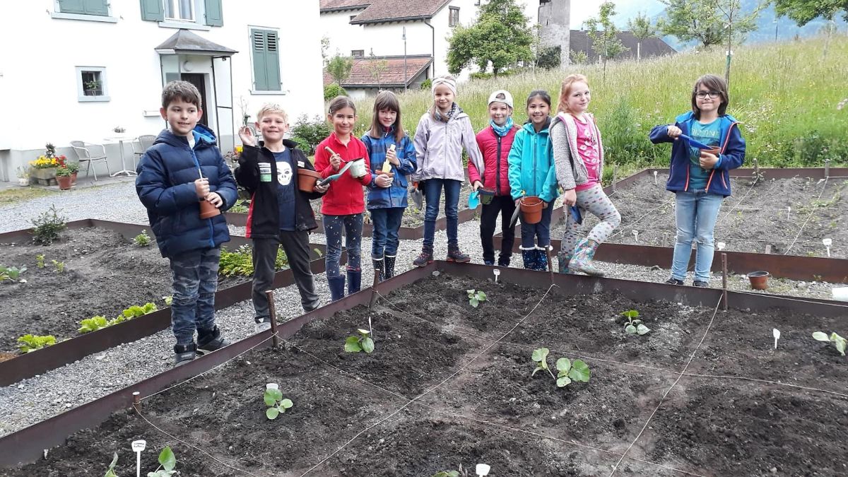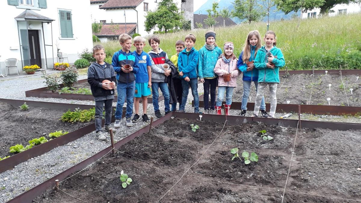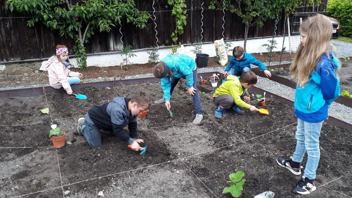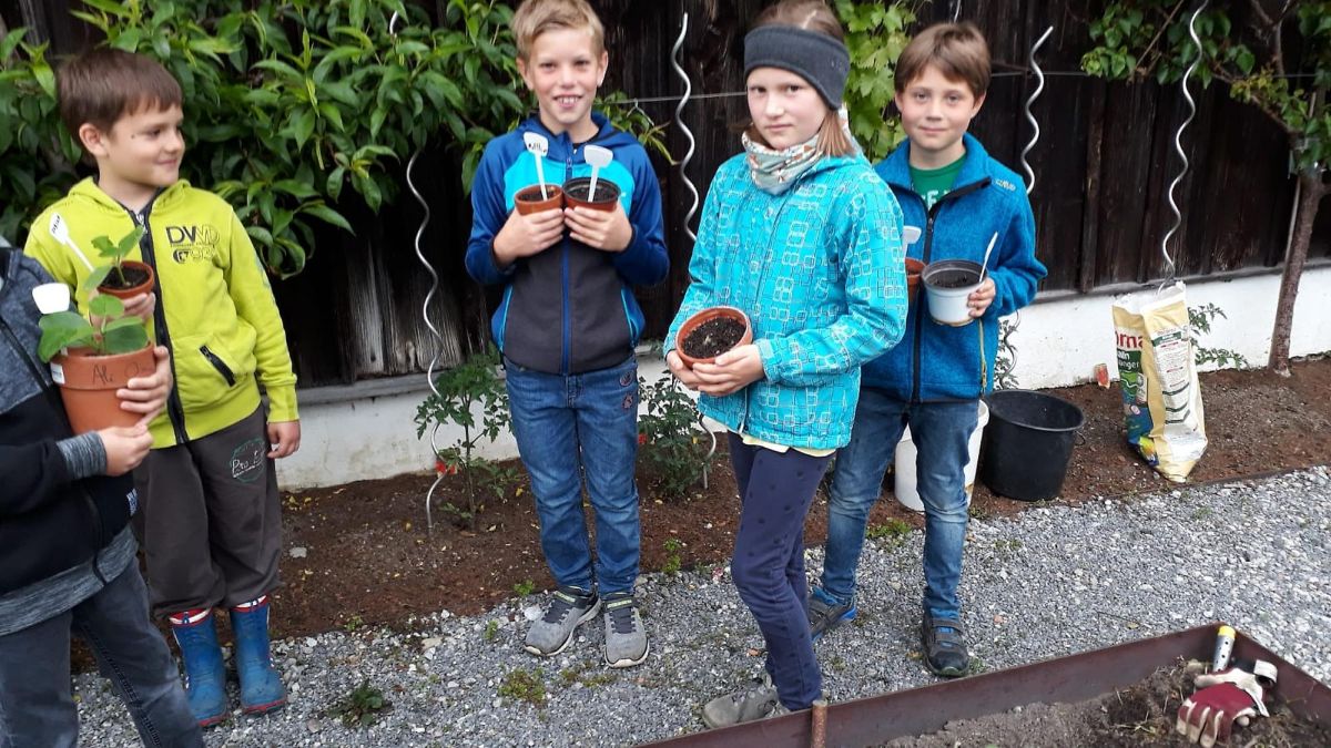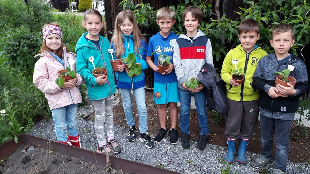 Nun war es so weit! Fast alle Kürbissamen waren gekeimt und die jungen Pflanzen schon prächtig gewachsen. Die Schüler der zweiten Klasse der Volksschule Kirchdorf konnten nun ihre Kürbisse auspflanzen, damit die starkzehrenden Pflanzen kräftig Wurzeln bilden können. Jedes Kind setzte seine Pflanze in ein Beet von ca 1 m². Das aufkeimende Unkraut wurde abgehackt, Dünger und Steinmehl eingearbeitet und die Arbeit war somit erledigt. Jetzt hoffen wir auf gutes Wachs-Wetter, sodass die Kinder viele große Kürbisse ernten können.