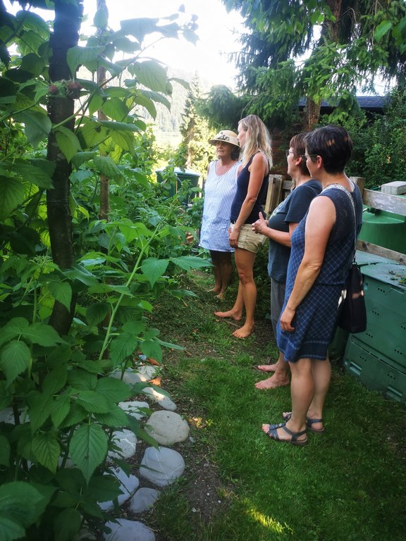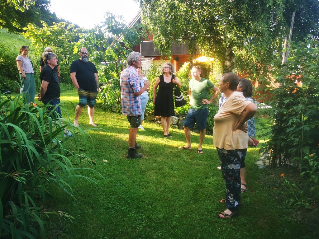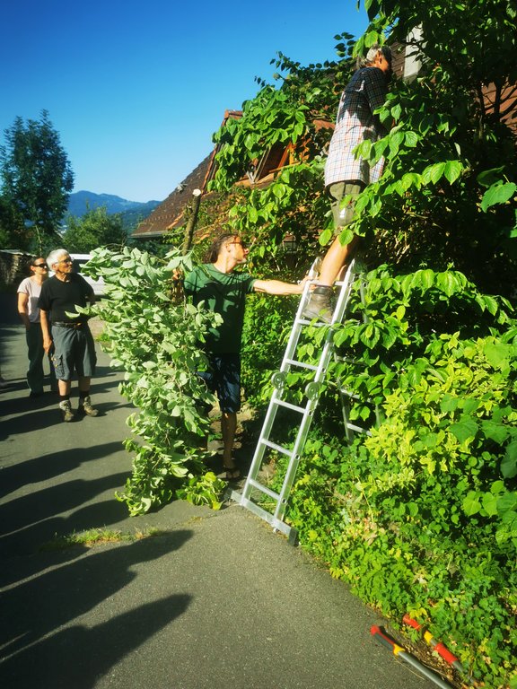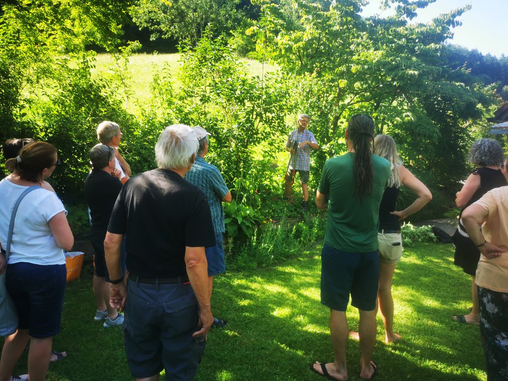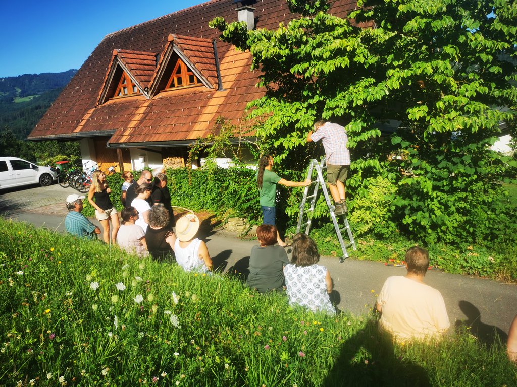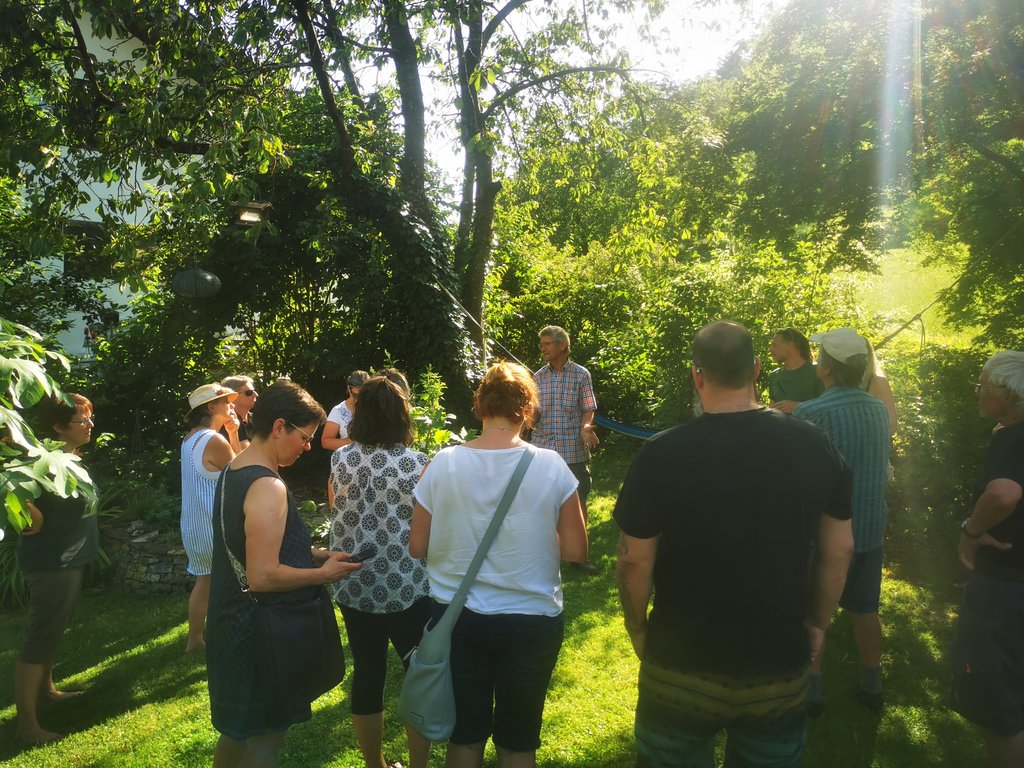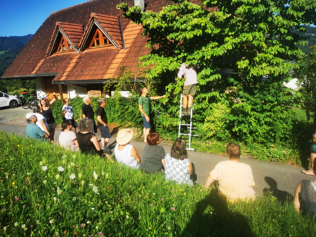 Trotz heißem Sommertag versammelte sich eine große Gruppe interessierter Gartenfreunde im Garten von Michael Furxer und Vanessa Morscher. Welche Atmosphäre große schattenspendende Bäume, rahmengebende Sträucher und Stauden die den Blick auf sich lenken ausstrahlt, durften wir gleich beim Betreten des Gartens erleben. So anmutend dieses Stadium des Gartens ist, so wichtig ist jetzt ein Rück-, Auslichtungs- und Verjüngungsschnitt. Gartenprofi Thomas Kopf erklärte uns dazu die möglichen Vorgangsweisen.Grundsätzlich ist nach der Blüte der richtige Zeitpunkt. Einen guten Einfluss hat auch der untergehende Mond. Ende Juni, wenn die Sträucher ihren Habitus erreicht haben und noch Zeit genug für einen Neuaustrieb haben, ist ebenfalls ein guter Zeitpunkt. Manchmal ist eine Standortänderung, an dem der Strauch seine natürliche Form entfalten kann, die bessere Lösung als ein Schnitt. Mit Leiter, Säge und Schere ausgerüstet zeigte uns Thomas wie man bei einem Auslichtungsschnitt praktisch vorgeht. Auch die richtige Pflege von Rispen- und Bauernhortensien war ein interessantes Thema. Zum Abschluss wurden wir von den Gastgebern zu einem gemütlichen Hock eingeladen, bei dem noch eifrig Gartenerfahrungen ausgetauscht wurden.