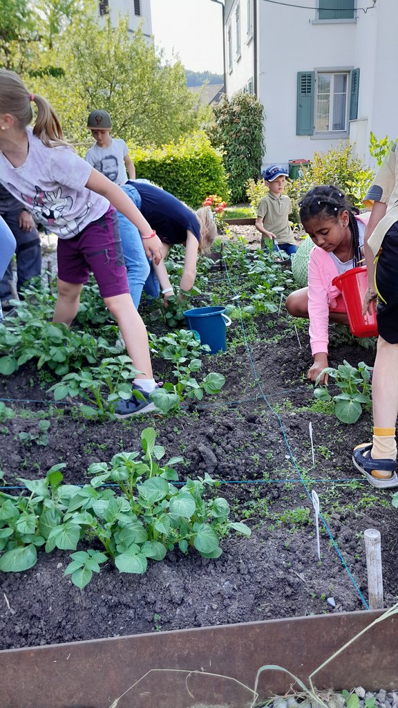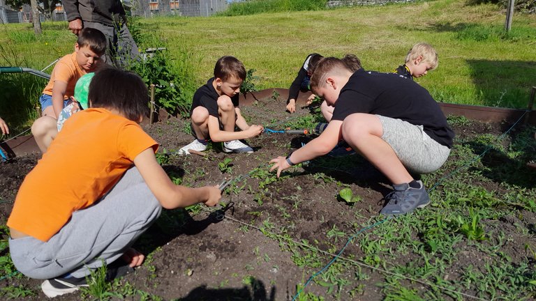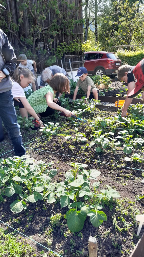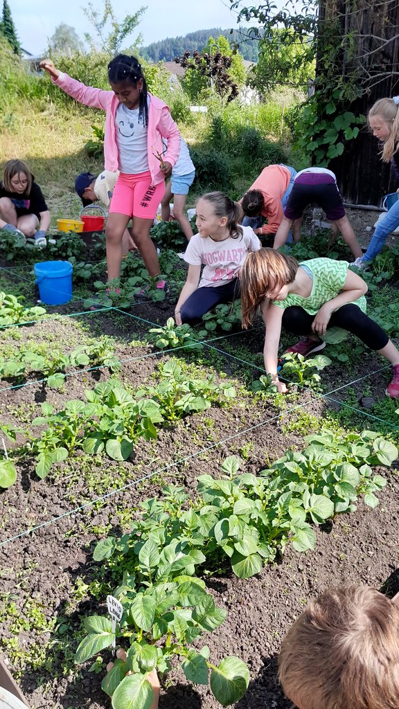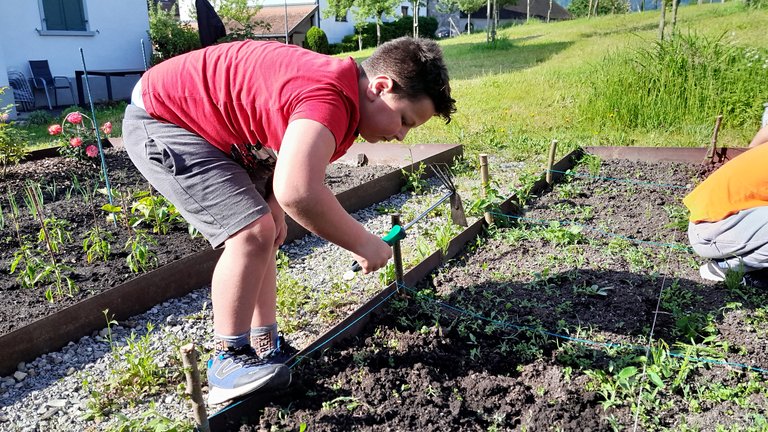 Nicht nur pflanzen und säen will gelernt sein, auch das Ausjäten gehört zu den Aufgaben eines Gärtners. Die Schülerinnen und Schüler haben das ausgezeichnet gemeistert. Die Kartoffeln und Kürbisse stehen noch, das Unkraut nicht mehr.