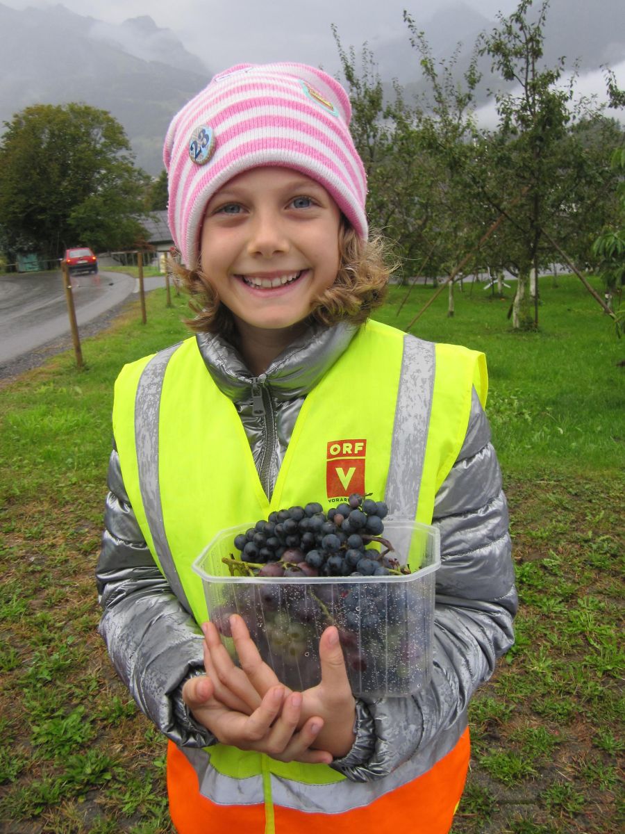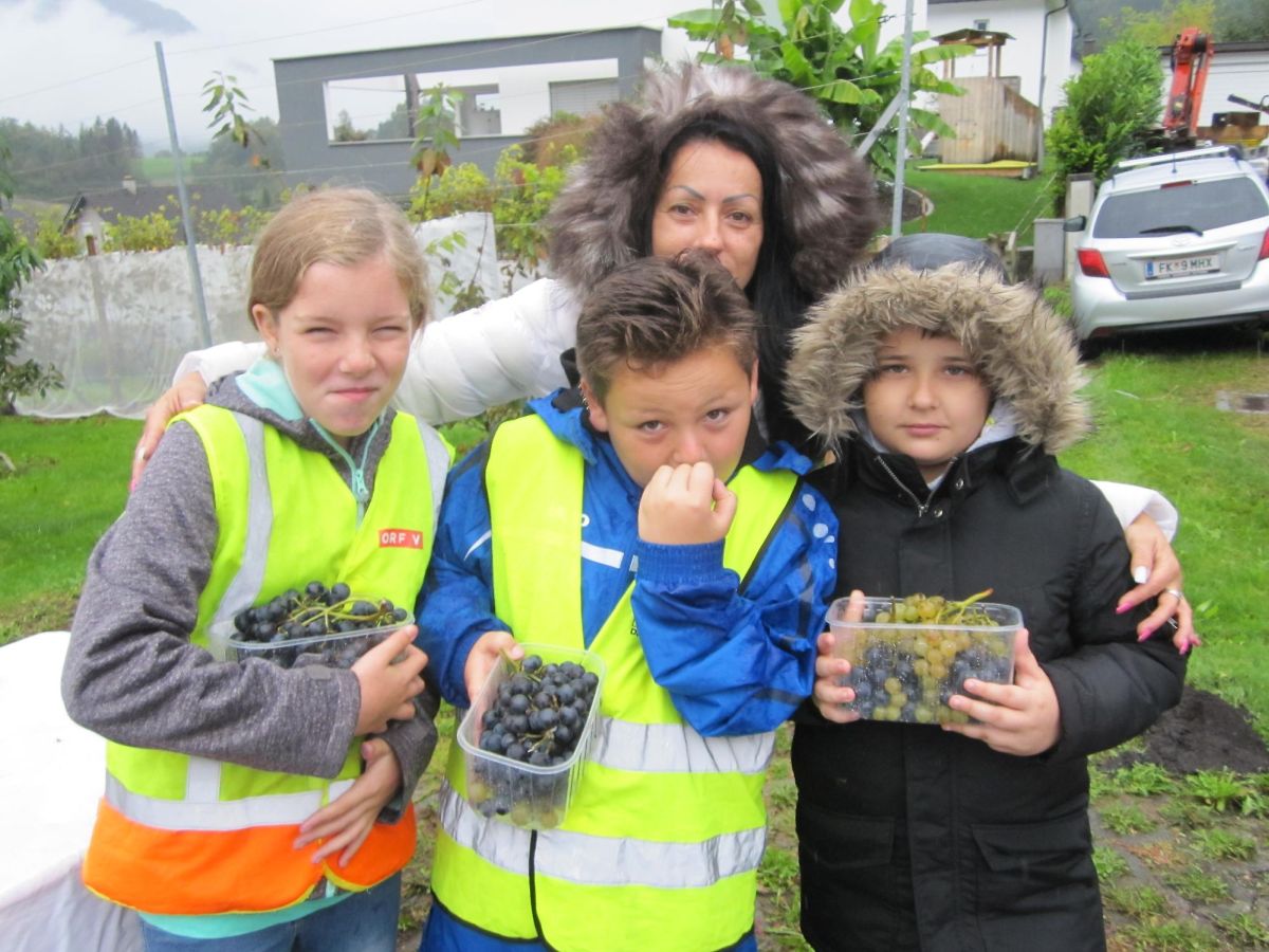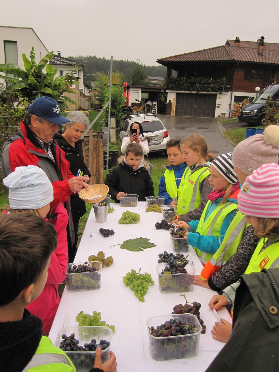 Wir, die Kinder der 4. Klasse der VS Agasella, fuhren am 26. September 2019 mit dem Bus nach Büttels. Von der Bushaltestelle liefen wir zu Franz Metzler nach Hause. Nikolaus Peer leitete das Rebenprojekt. Er hatte zwei Helfer: Franz Metzler und Willi Huber. Unser Thema war an diesem Vormittag die Traubenernte. Am Anfang wiederholten wir den Aufbau des Rebstocks und der Traube. Dann ging es auch schon los. Man teilte uns in drei Gruppen ein. Zuerst kosteten wir vier verschiedene Traubensorten. Danach gingen wir im Uhrzeigersinn zu den Rebstöcken und durften uns verschiedene Traubensorten runterschneiden. Wir bekamen Körbchen, in die wir die Trauben legten. So transportierten wir die köstlichen Trauben nach Hause.