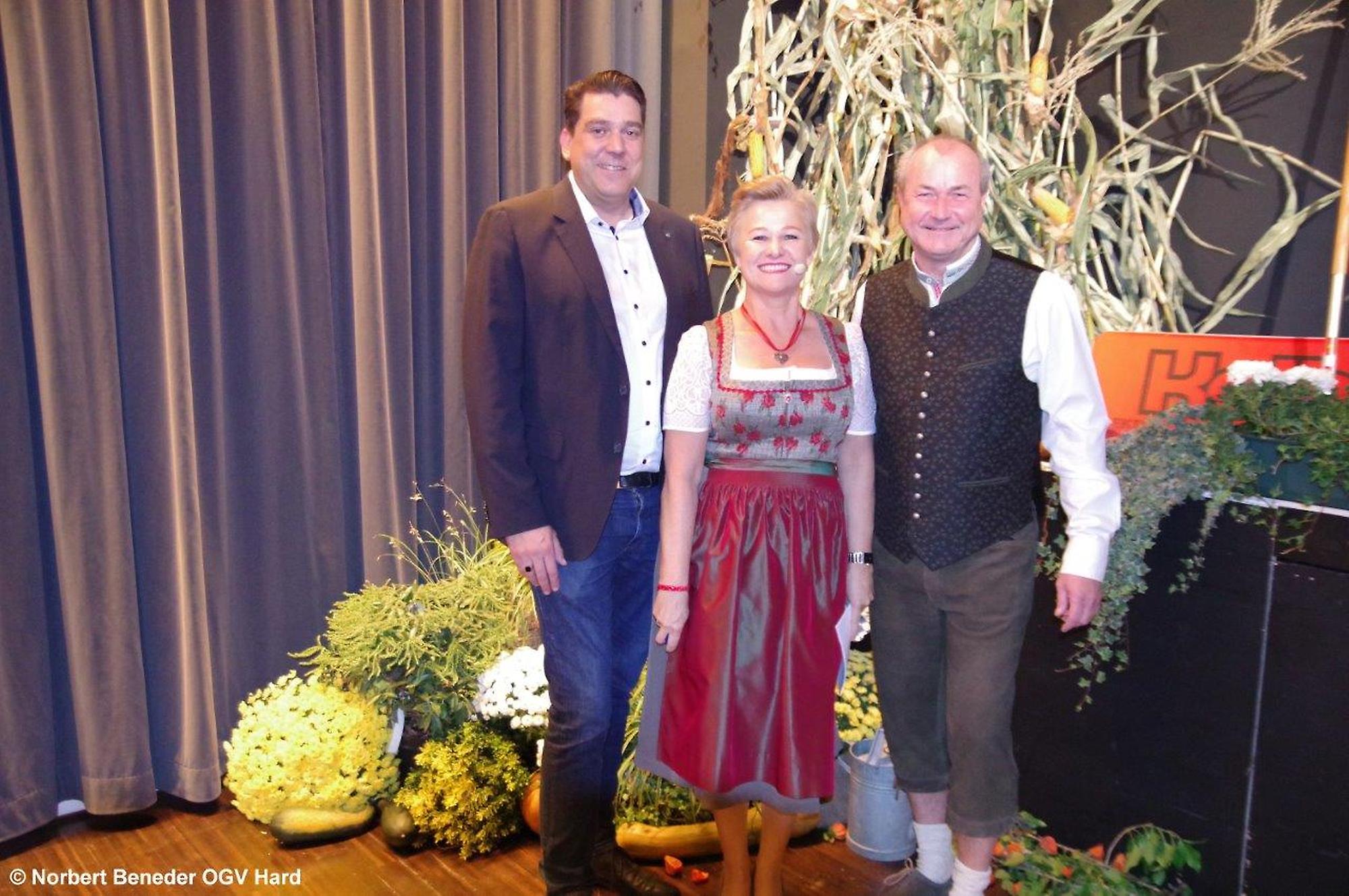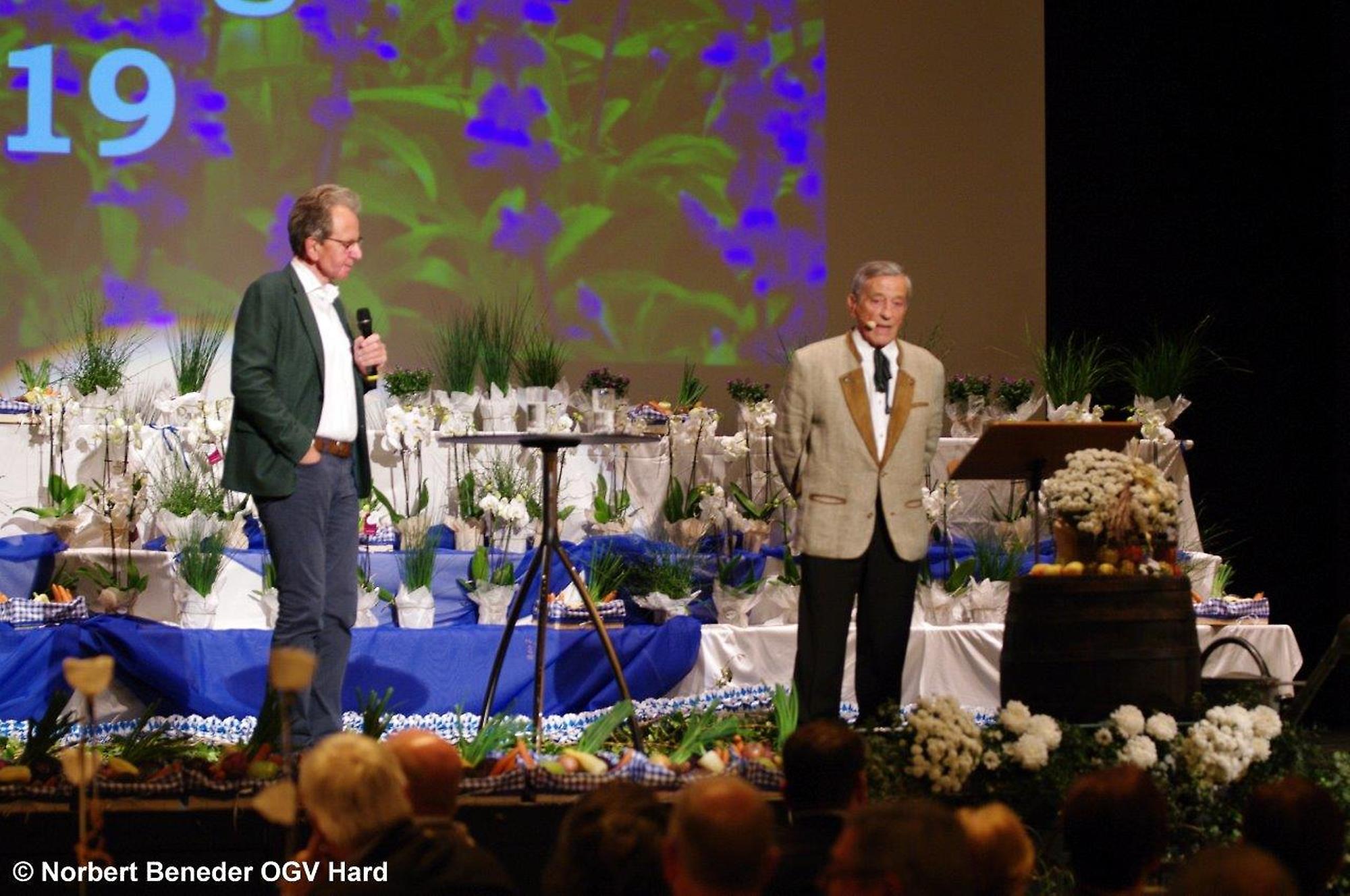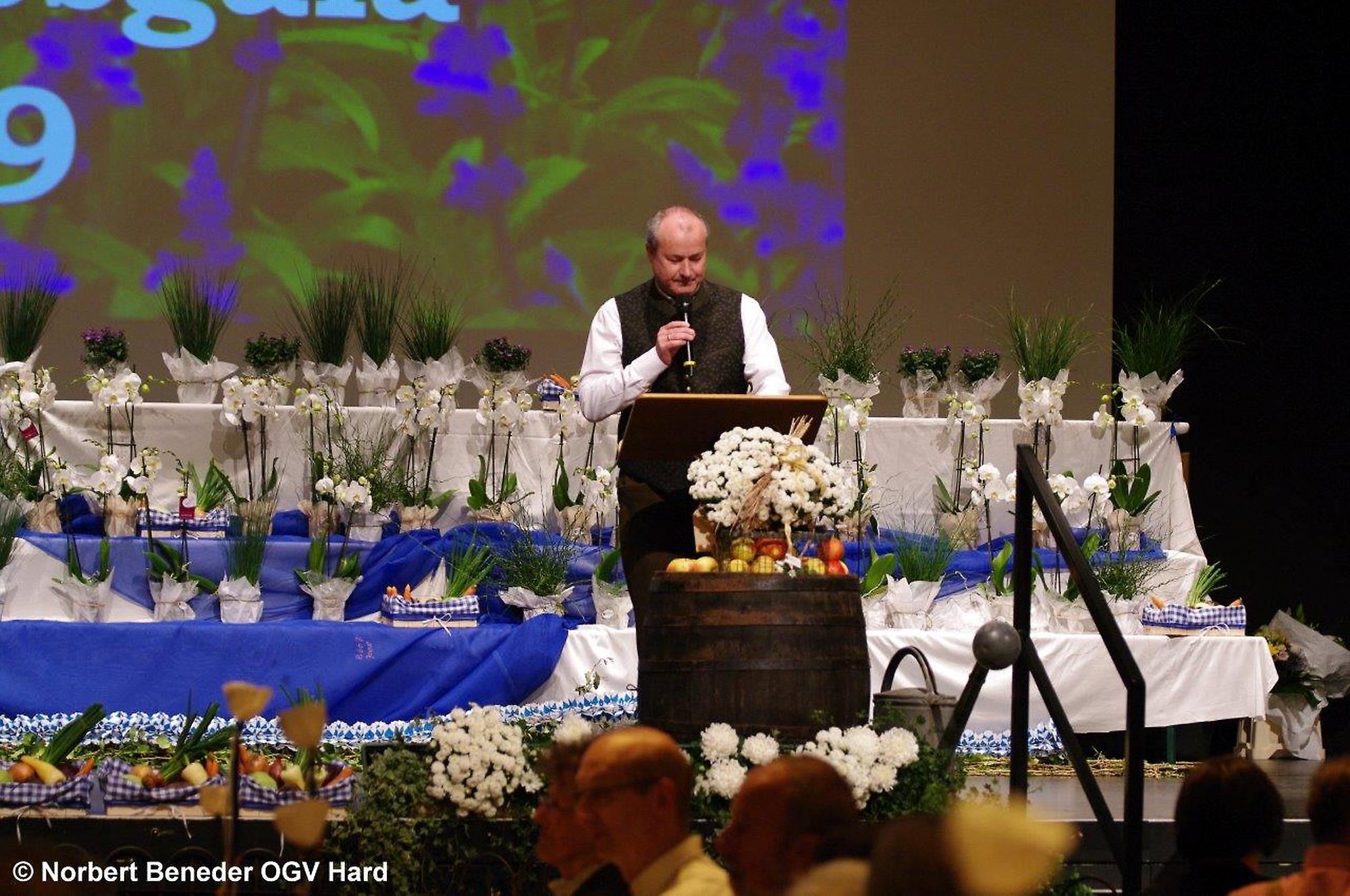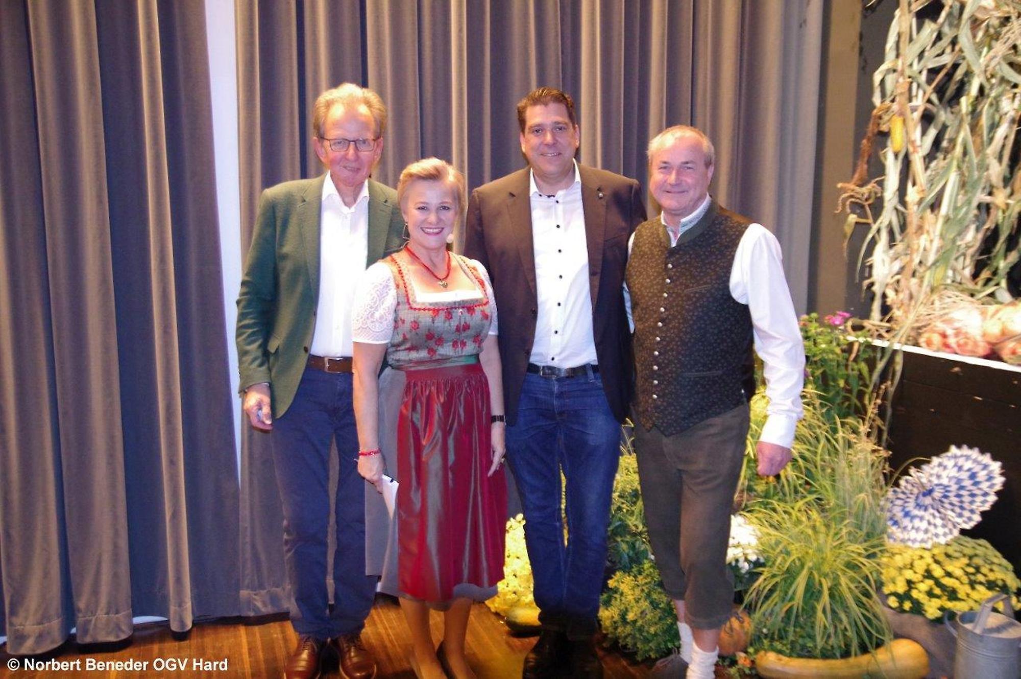 Die eingeladenen Hobbygärtner waren von der Dekoration und von der Stimmung begeistert. Der OGV feierte außerdem "40 Jahre Blumenschmuck Bewerb" und die Harder waren somit beim Blumenschmuck in Vorarlberg der Verein der ersten Stunden. Der Obmann Thomas Bitschnau konnte zahlreiche Ehrengäste, allen voran den Harder Bürgermeister Harald Köhlmeier und Harald Rammel und Erika Nägele von der FLORA Blumenschmuck Jury begrüßen. Alfred Stoppel als Vertreter des Landesverbandes OGV und die Funktionäre der befreundeten Vereine Elisabeth Vögel vom Bienenzuchtverein, Ulrike Kohler von Krippenbauverein, Kurt Engstler vom Heimatpflegeverein, Reinhard Mäser vom Schrebergärtenverein begrüßen. Die Ehrenmitglieder Michael Brandl, Oswald Dörler und Edi Lex waren ebenfalls unter der Gästeschar, wie auch die Harder Gemeindegärtner unter der Leitung von Kurt Voppichler.