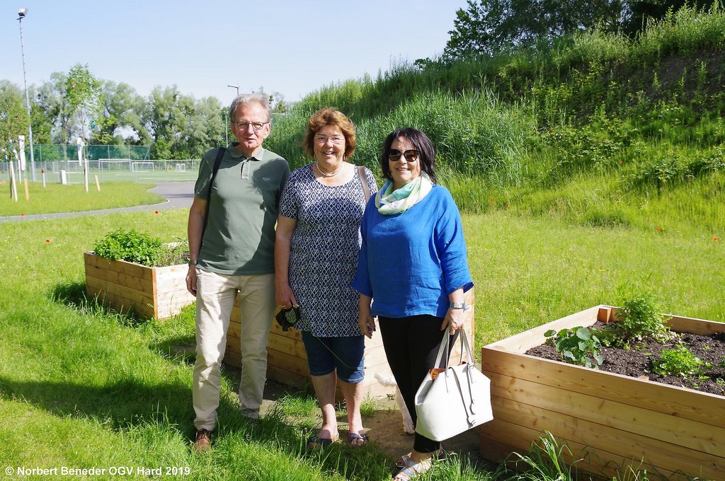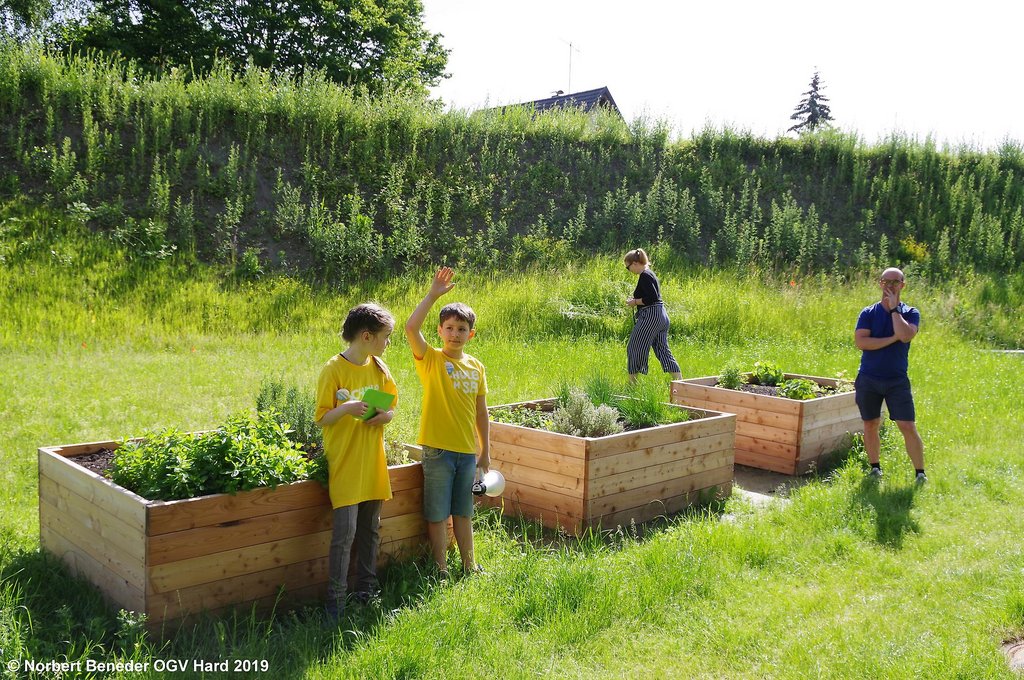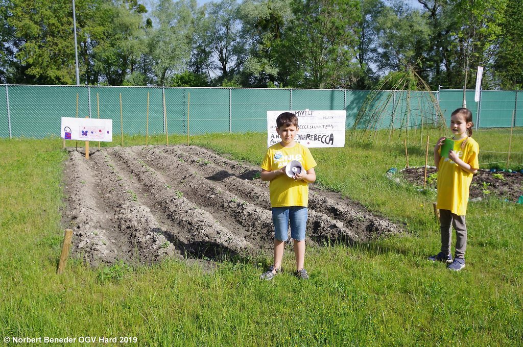 Die Volksschüler Kinan und Johanna begrüßten die Gäste und führten gekonnt und mit erstaunlichen Fachwissen durch die Gartenanlage der Schule. Zuerst wurde der Beerengarten besichtigt, in dem Johannisbeer, Himbeer und Brombeer fachmännisch gepflanzt wurden. Große Bewunderung fand die Baumschule, in der Jungbäume gezüchtet werden, die später an die Harder Bevölkerung verkauft werden sollen. Der Erlös wird der Schule wieder zukommen.